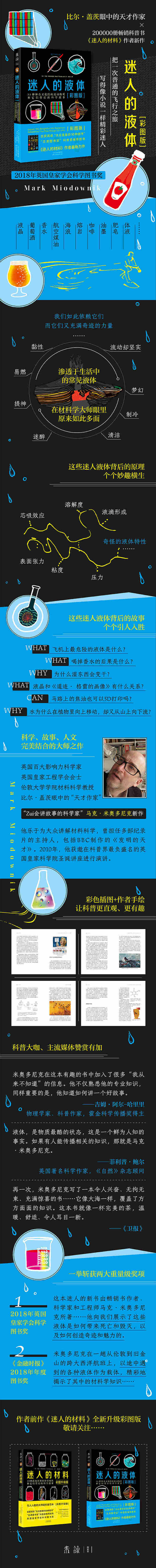 这是一本介绍液体及其特性的材料学科普书。作者马克•米奥多尼克用专业的材料学知识为我们解读了日常生活里各种各样的液体。在一次飞机旅行中,他看到了从水、胶水到咖啡、葡萄酒、液晶显示屏和洗手液等各种物质的碰撞。从革命性的钢笔和航空煤油,到自我修复道路和计算机的前沿研究,米奥多尼克运用他幽默风趣的科学叙事,揭示了为什么液体能在树里向上流,为什么油是有黏性的,为什么海浪能翻涌那么远,以及如何泡出一杯完美的茶,等等。