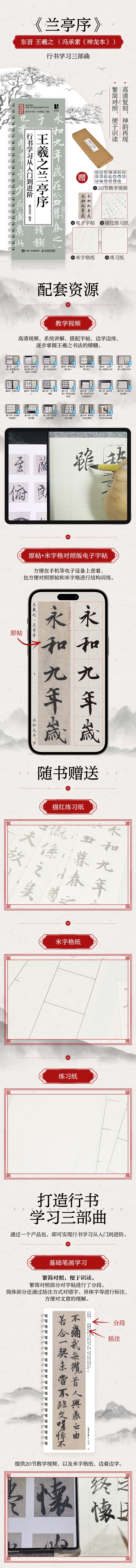 这是一个书法学习的产品包,以王羲之的《兰亭序》为蓝本,带领读者进行行书从入门到进阶三部曲的学习。*步可以进行行书基础笔画、结构的学习,书中提供了配套教学视频及纸张,读者可以跟随视频对《兰亭序》基本写法进行学习;*步可以进行描红练习,书中提供了《兰亭序》全文的描红练习纸,遵循原版墨迹,帮助读者快速熟悉行书的写法;第三步可以进行近距离对临练习,书中提供了1:1的全文字帖,还原真迹,同时还提供了繁简对照(繁体+简体)文本,可以帮助读者快速提升学习效率。此外,书中还提供了电子版米字格版的原帖及处理后的字帖对照,可辅助学习。