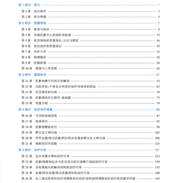 全面性。本书将循证医学证据与丰富的临床经验相结合,对乳腺癌放射治疗的各个方面进行了深入浅出的讲解,既涵盖了临床放射治疗质控体系建设与管理方面的内容,又详述了放射治疗设计与实施的每一个环节。