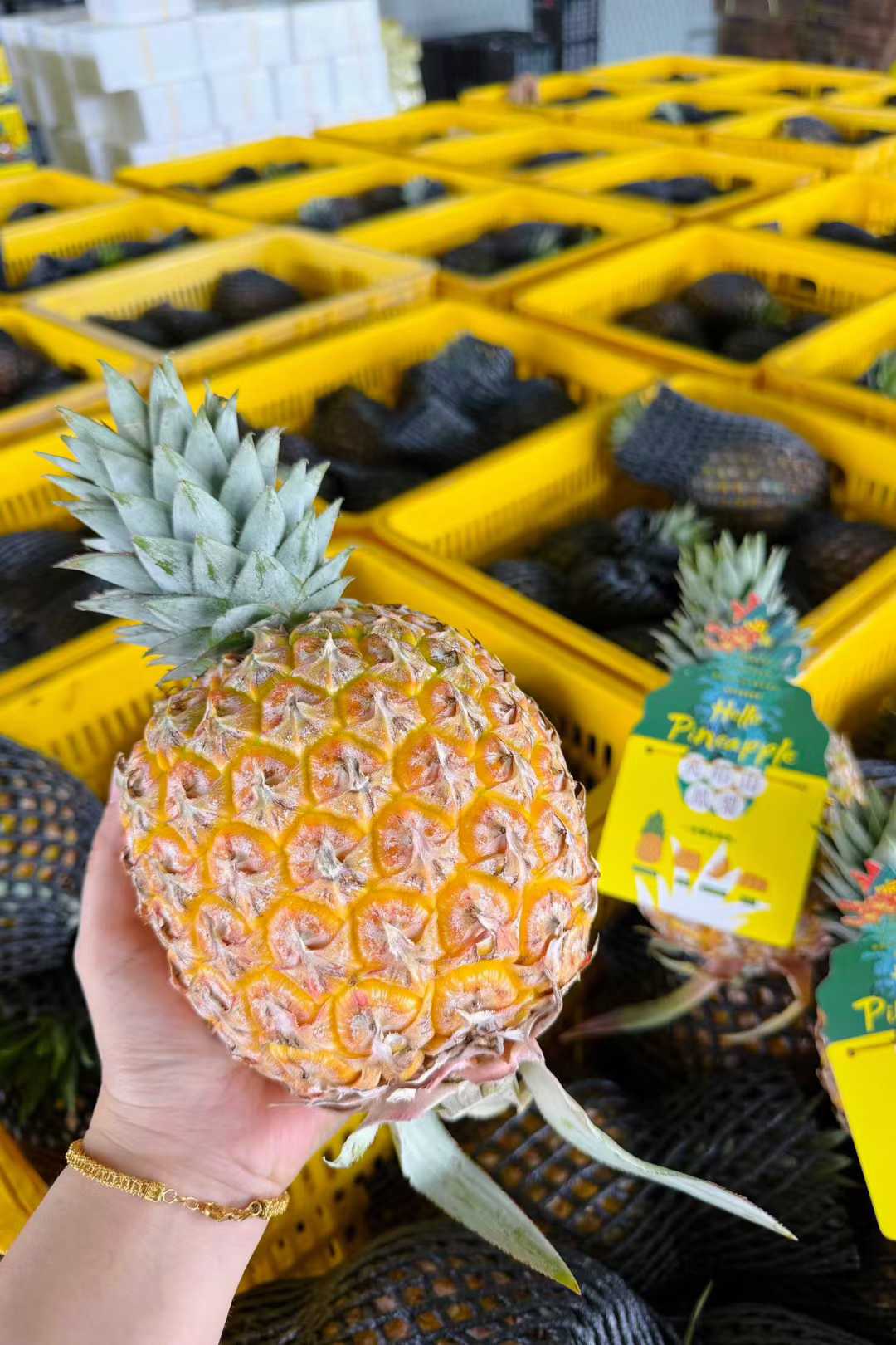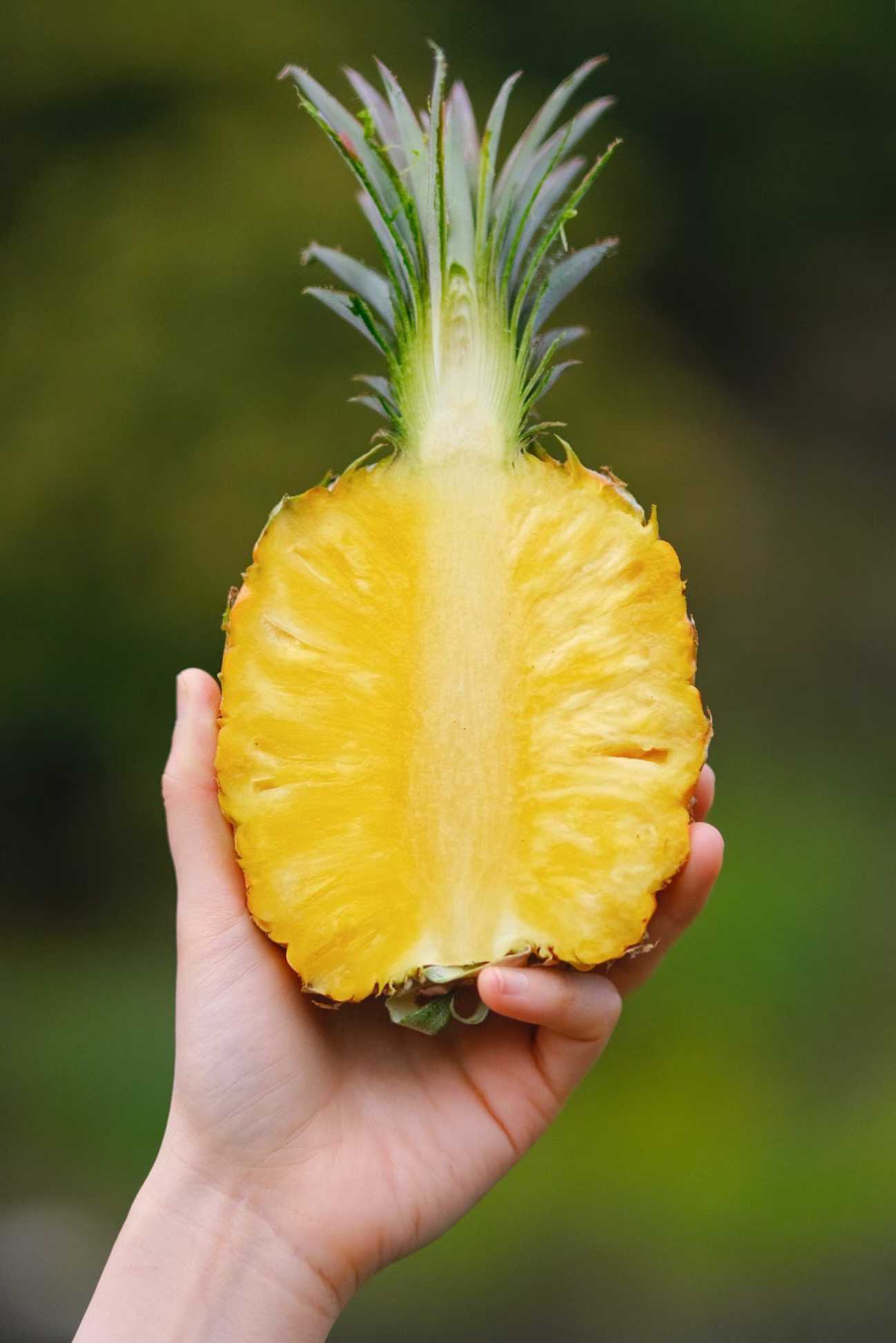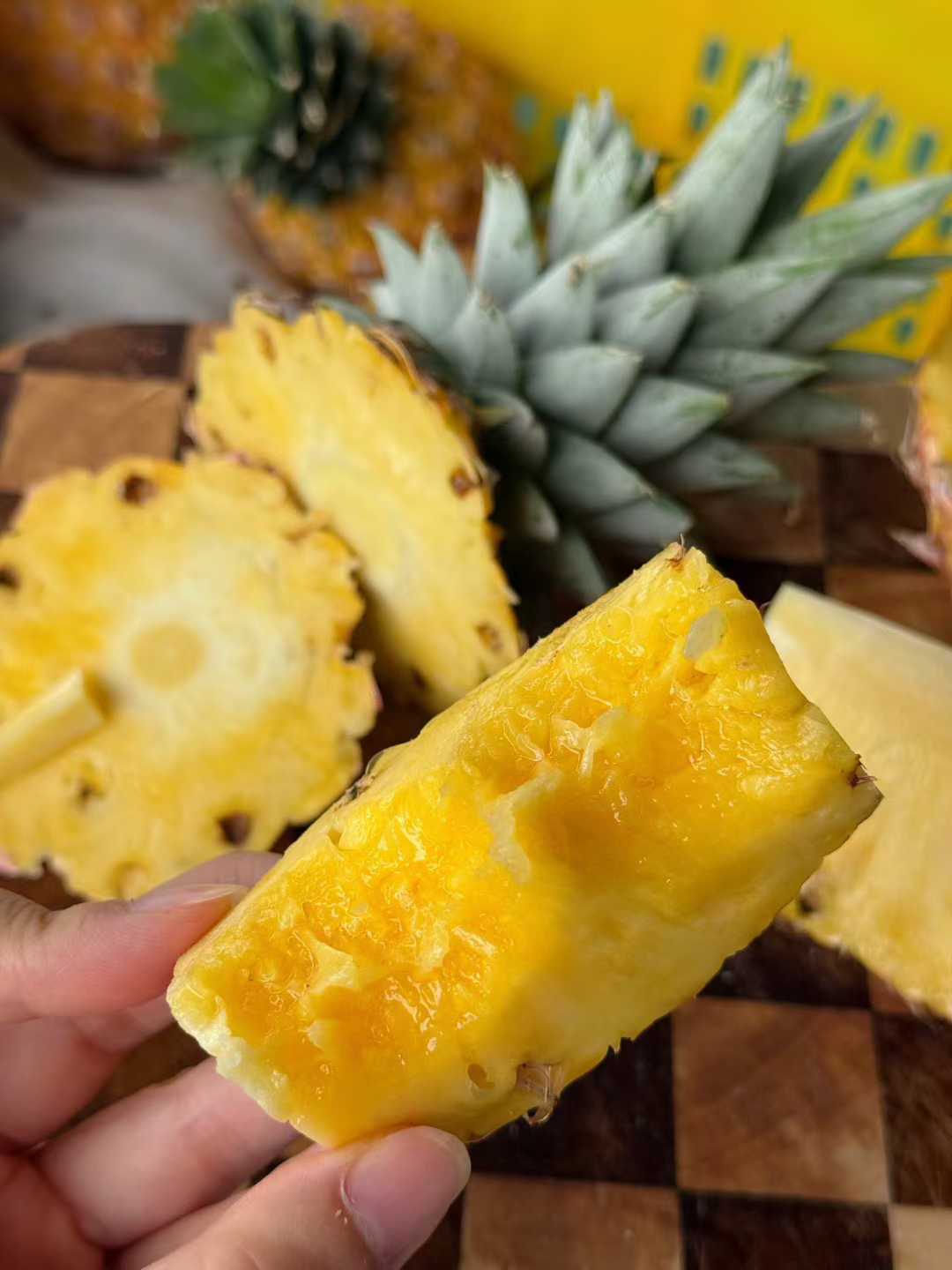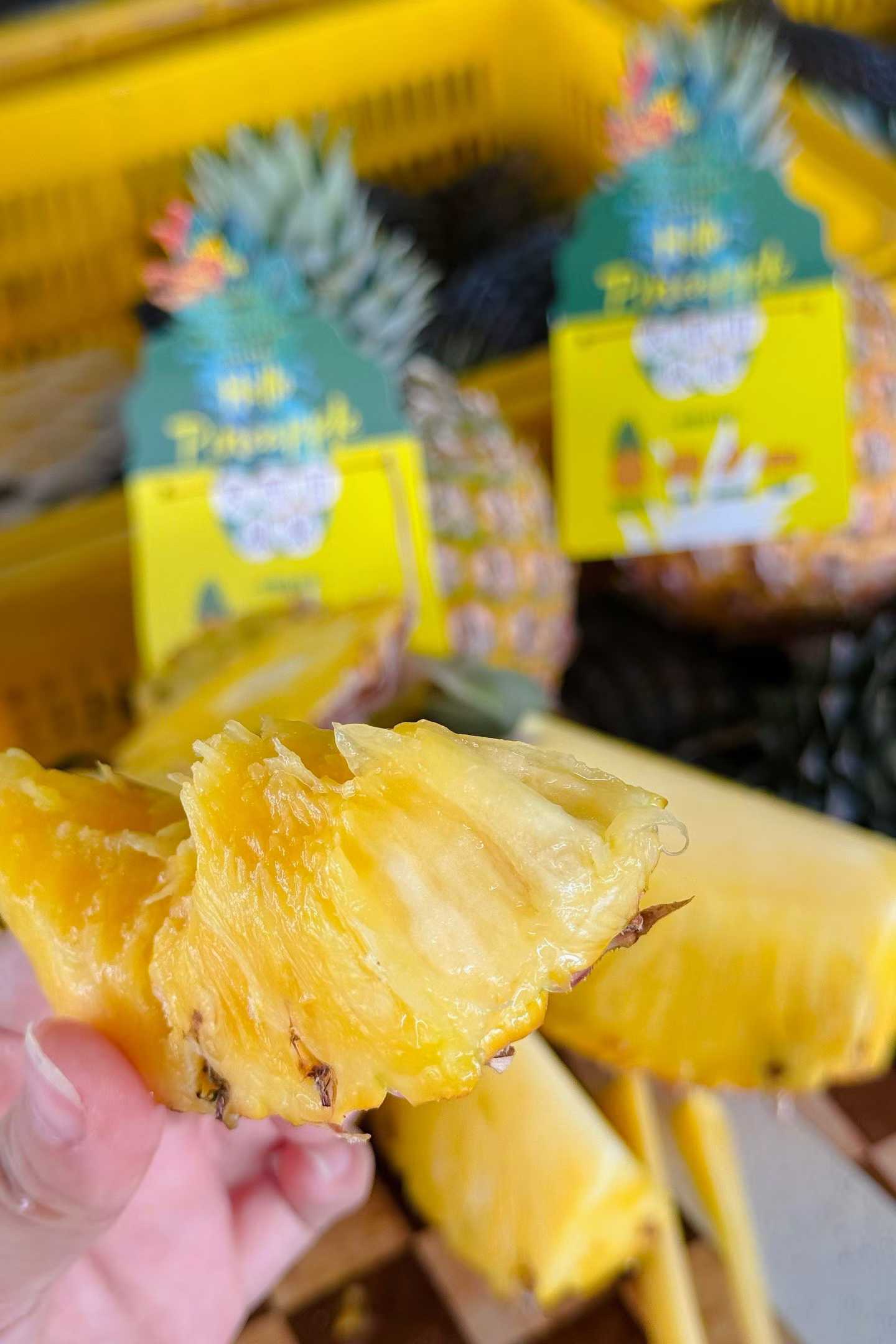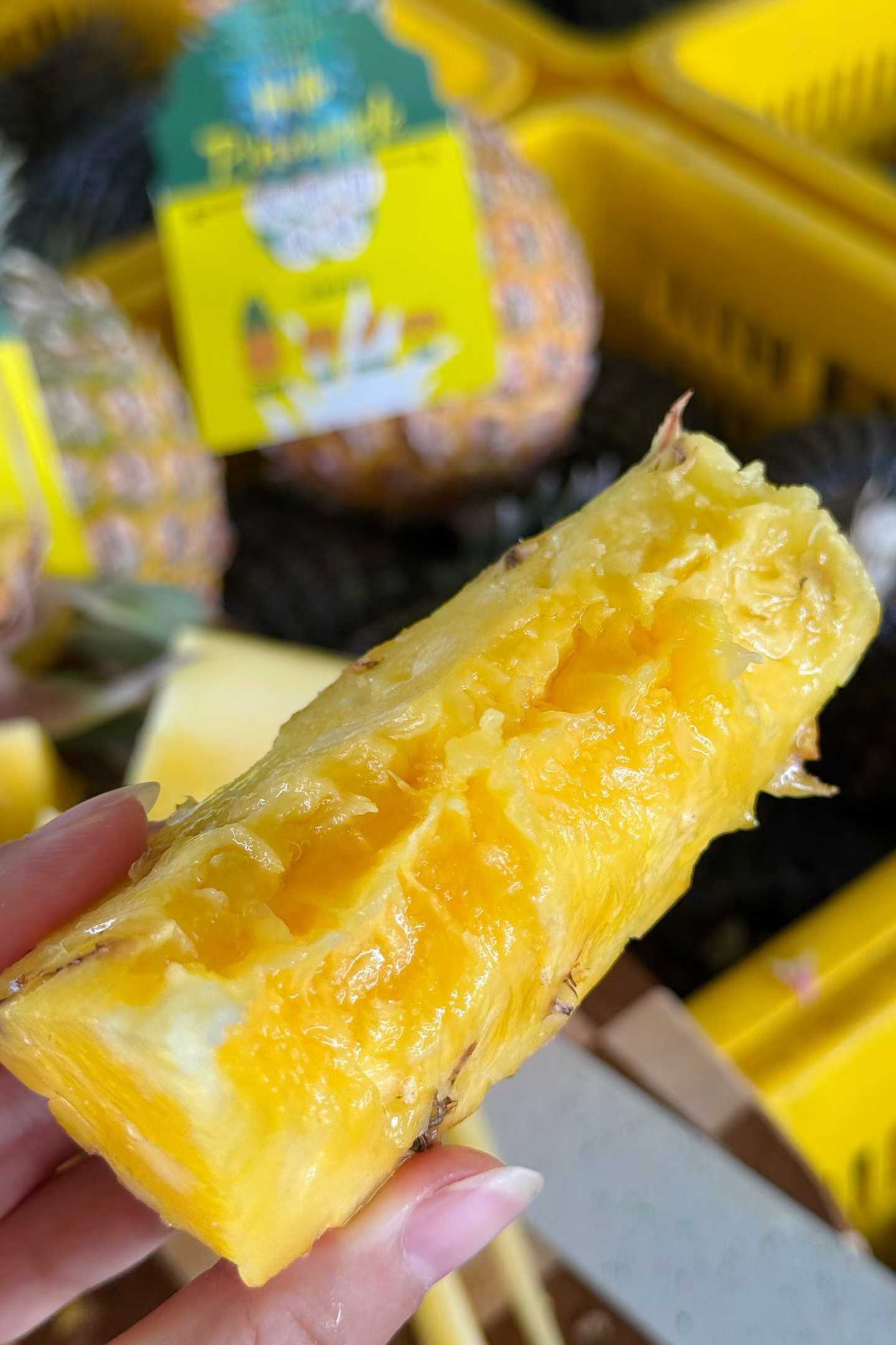 个头很大一个,矮矮胖胖的体型,金灿灿又多汁的果肉,和平时常见的凤梨都不一样 刚切开一颗,其实摆在那里它就在散发着芒果+凤梨香气了,很馋人🤤 一口下去,菠萝的酸甜、芒果的香气,甚至还有水蜜桃的鲜爽…… 在嘴里刮起一阵果香风暴,只要尝过,就会完全被它俘获了!