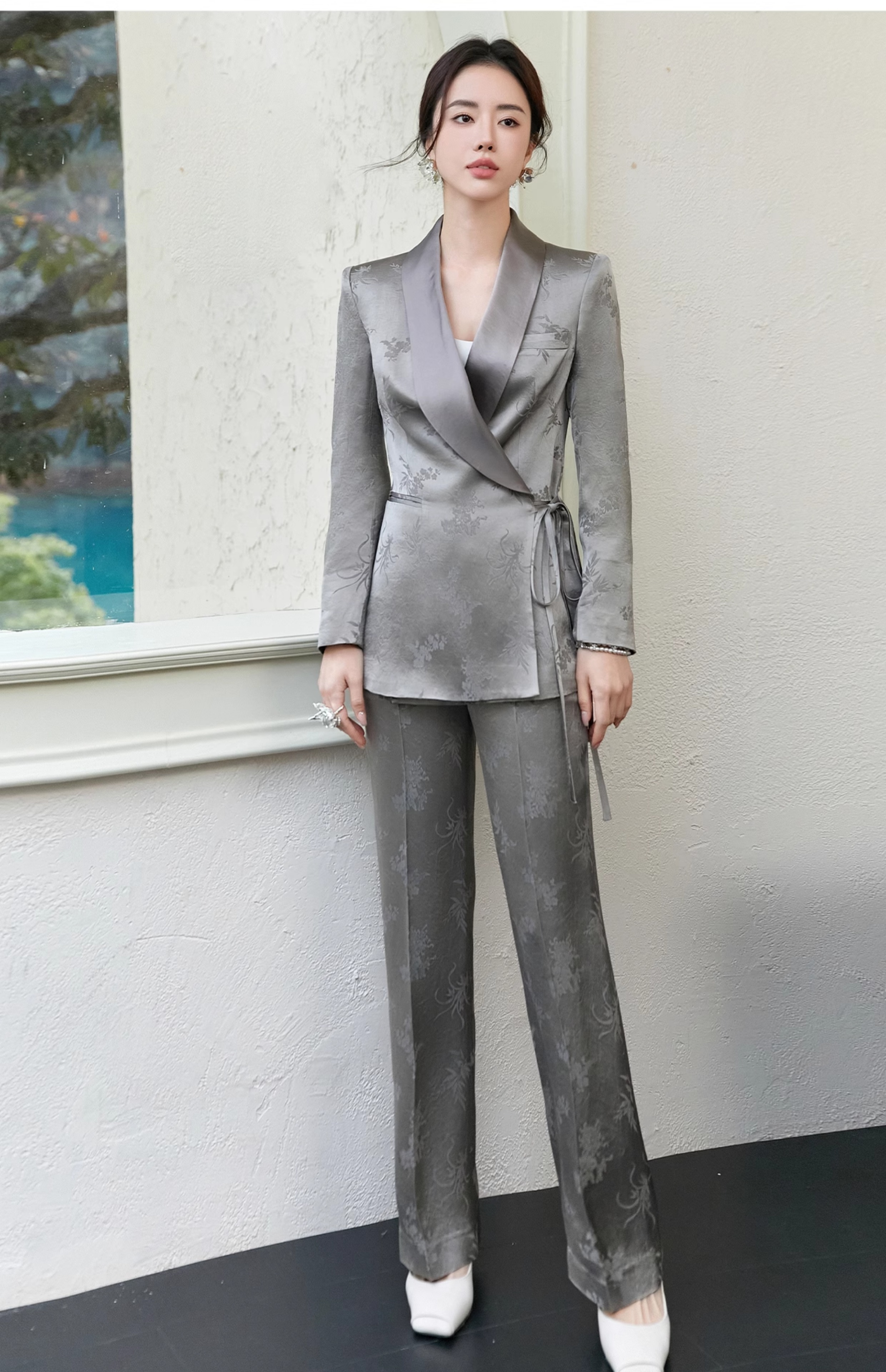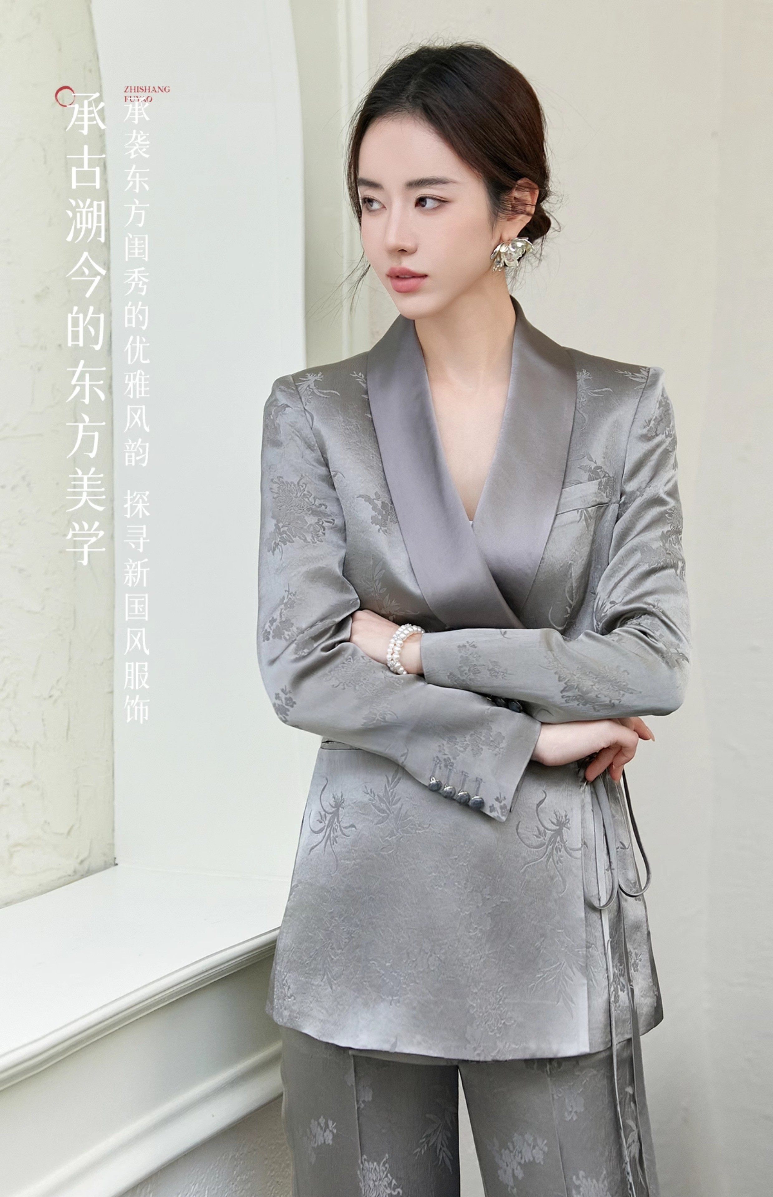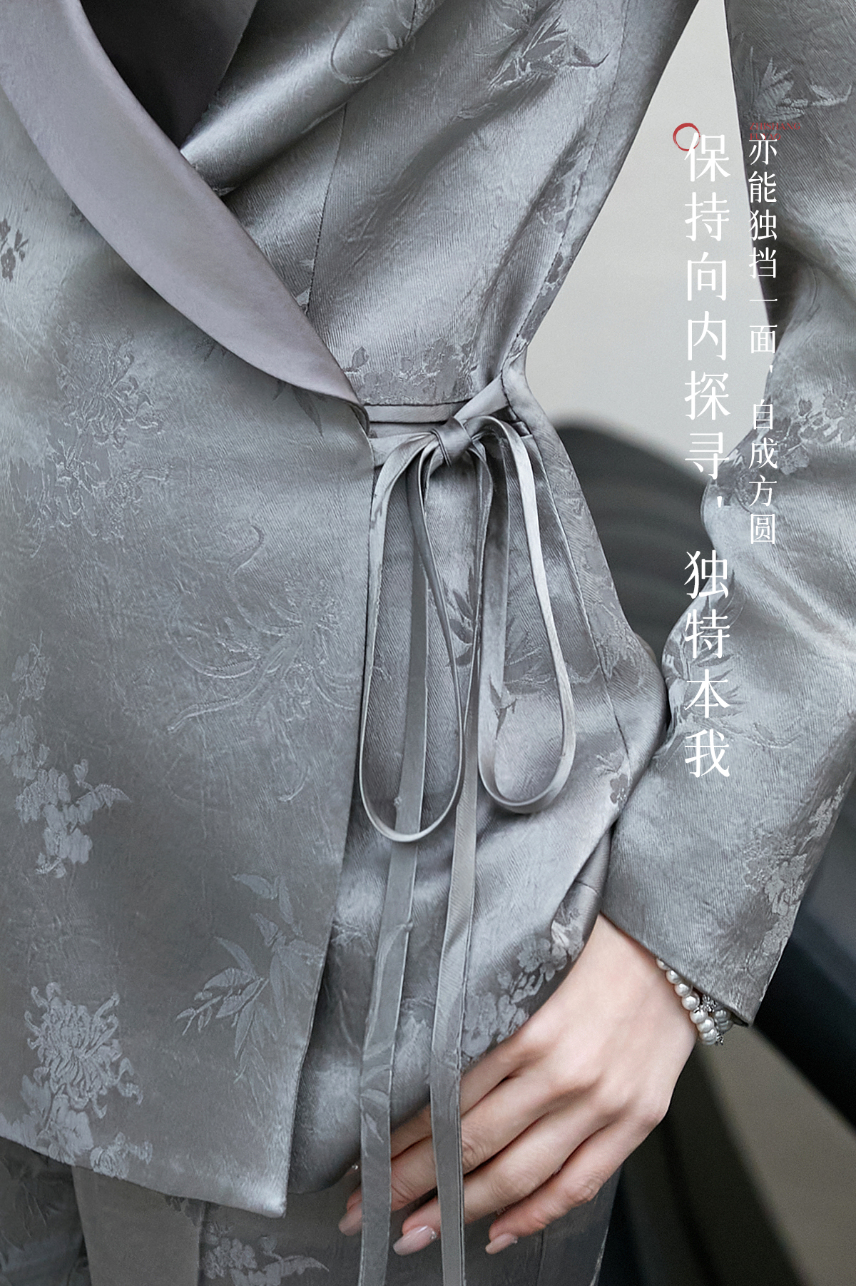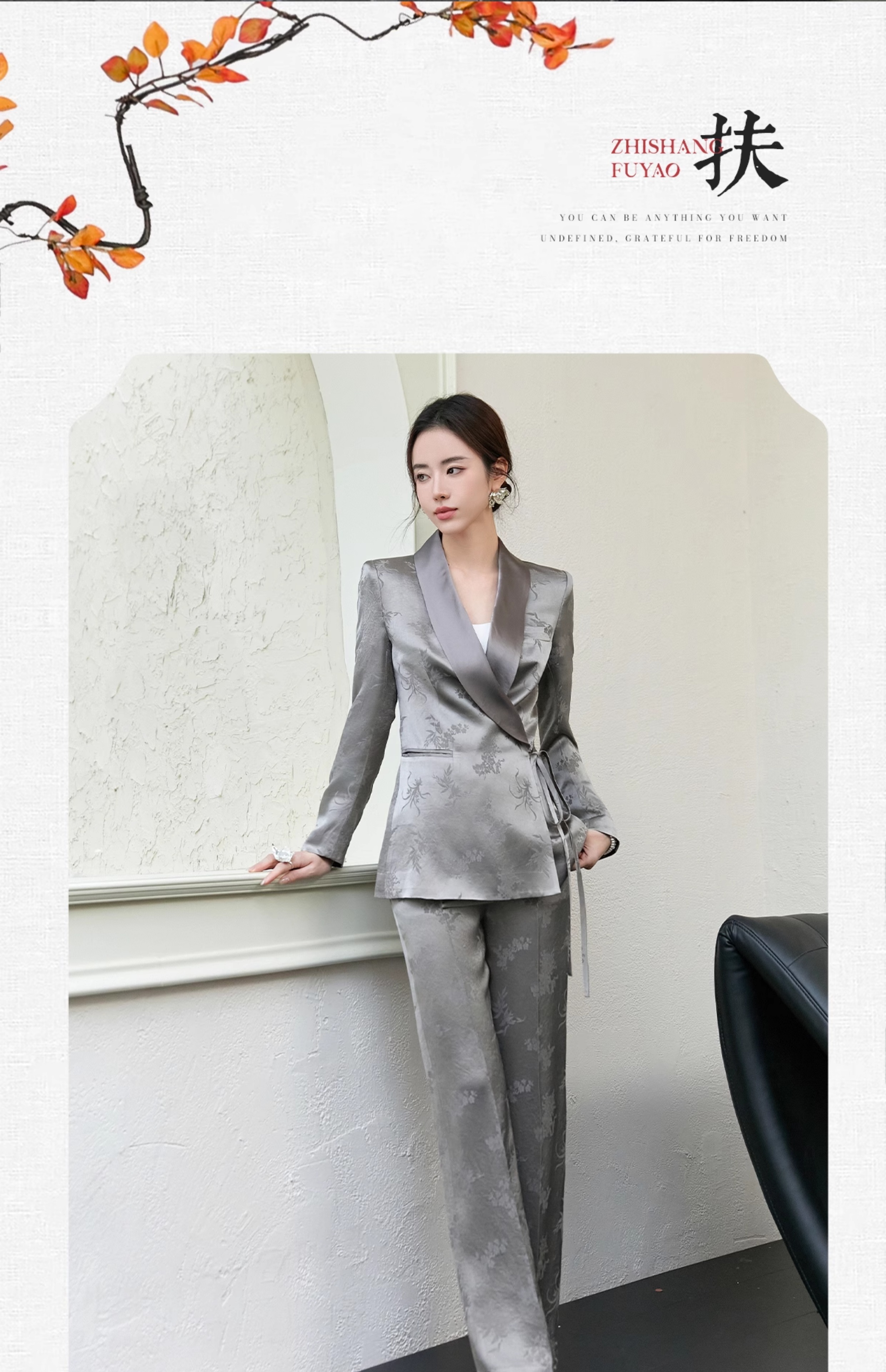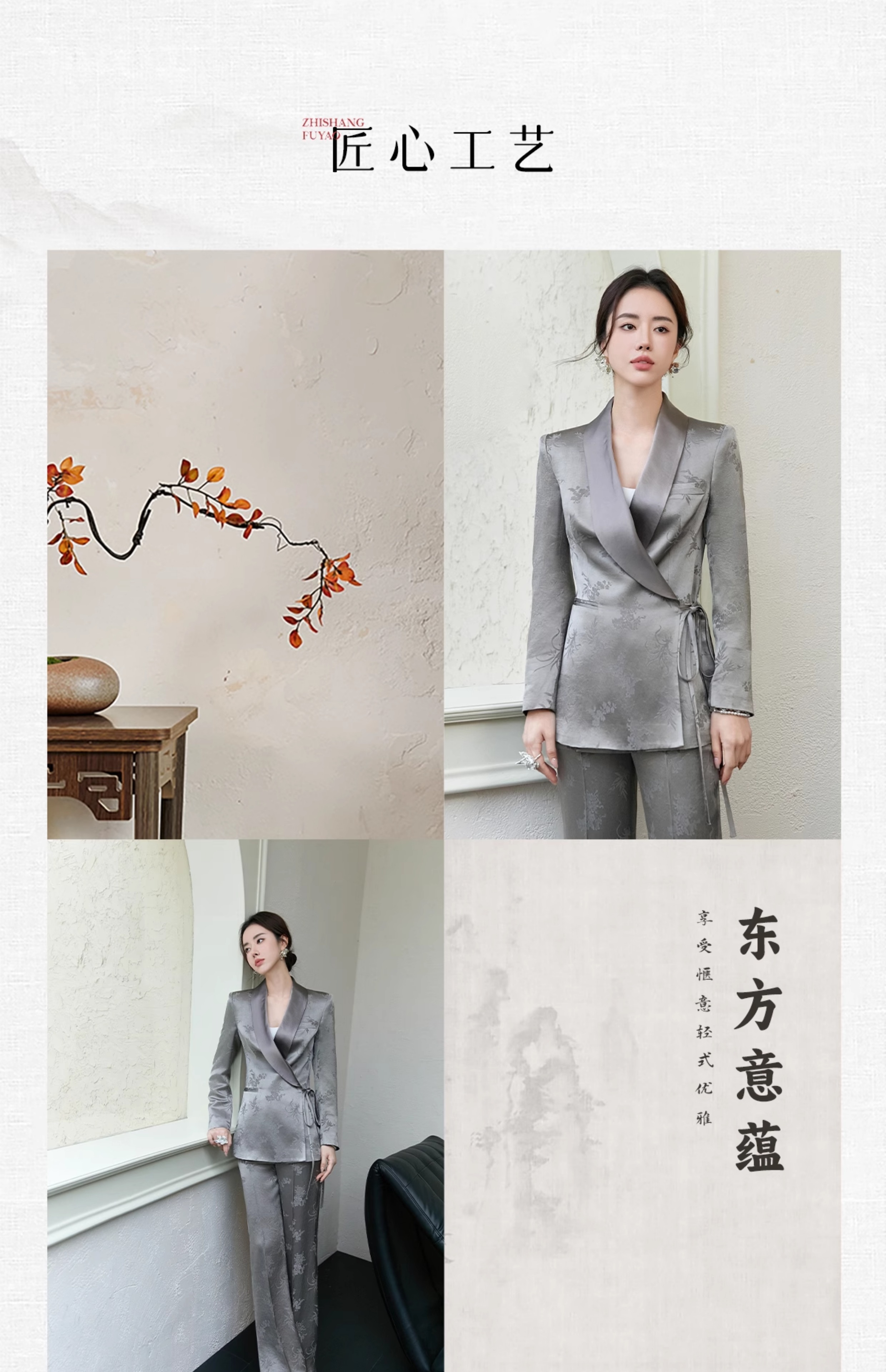 FUYAO扶摇 醋酸缎面时尚套装女2025新款国风交襟西装直筒裤两件套