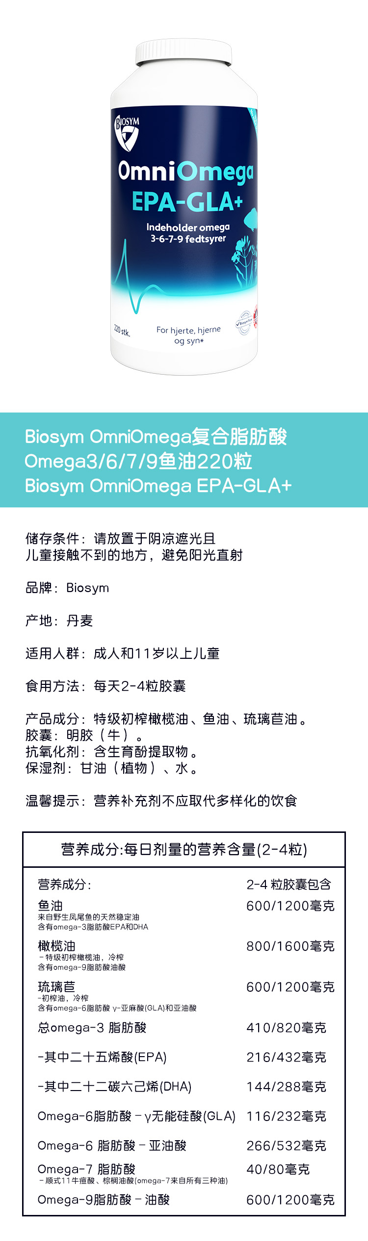 [极速送达-FX]Biosym OmniOmega复合脂肪酸Omega3/6/7/9鱼油220粒.Biosym OmniOmega EPA-GLA+ 220kaps.