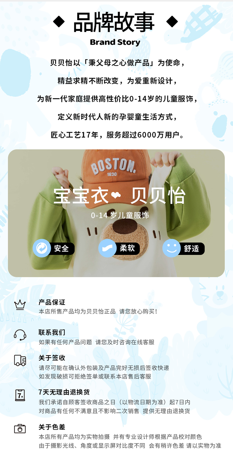 - 贝贝怡专注0-6岁婴幼儿服饰,坚持安全、柔软、舒适的产品理念,为千万中国家庭提供超高品质、安全可靠的婴幼儿服饰产品,妈妈放心,宝宝开心!