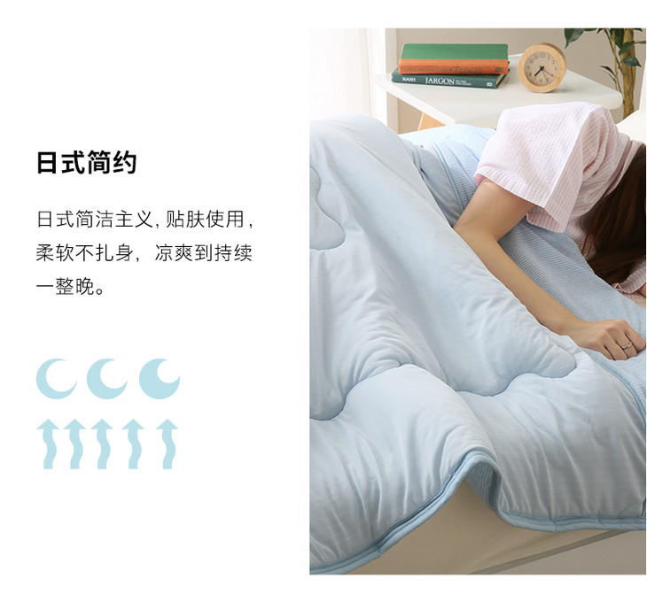 被子两面可用,一面是能让人瞬间清凉的冷感纤维,添加的冷元素晶体矿粉,吸热慢、散热快,冰冰凉凉,丝滑如德芙巧克力,适合夏天。