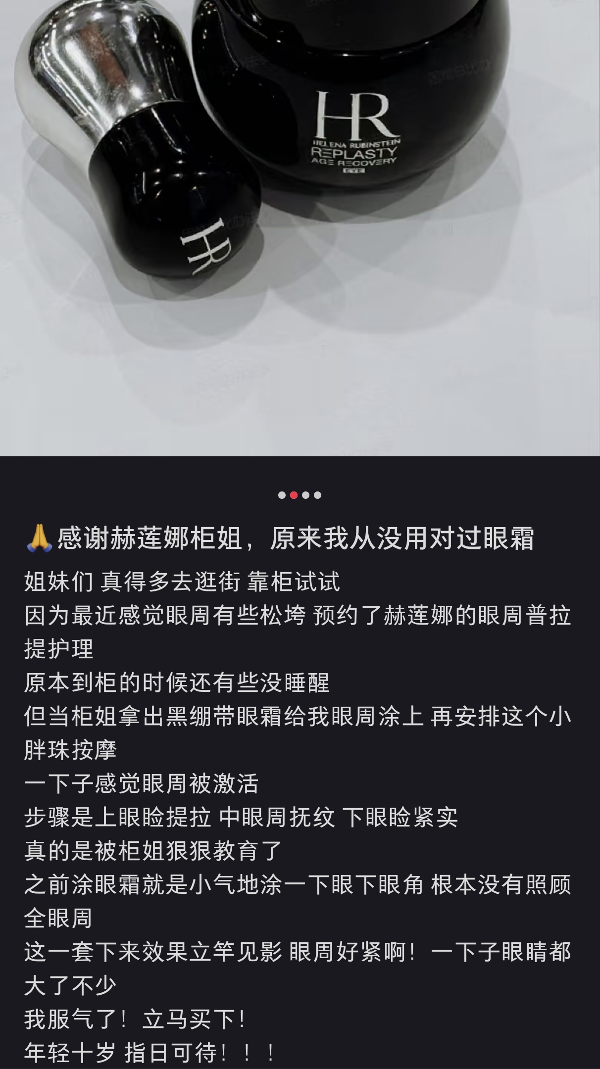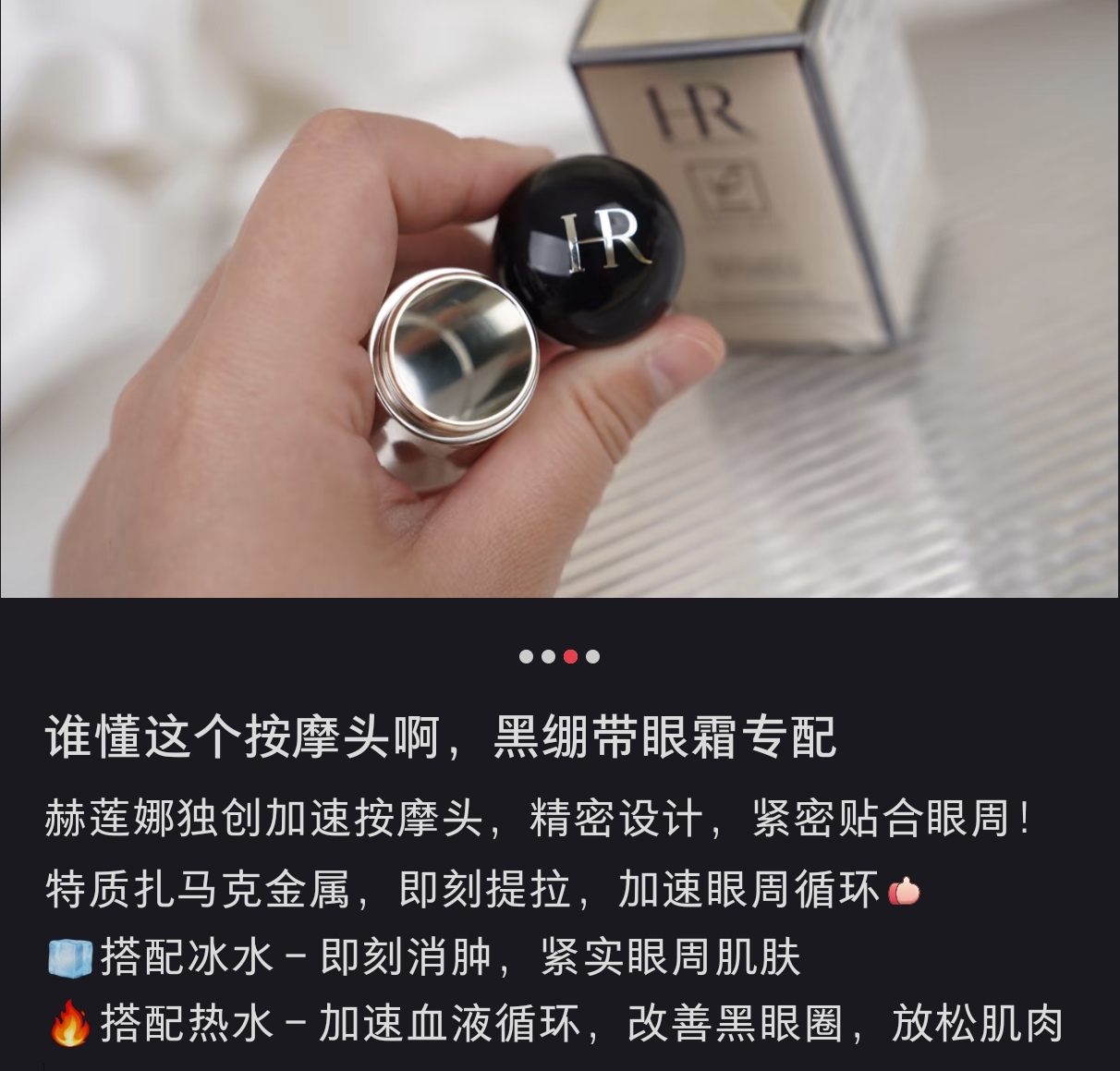 赫莲娜独创加速按摩头,精密设计,紧密贴合眼周!特质扎马克金属,即刻提拉,加速眼周循环~