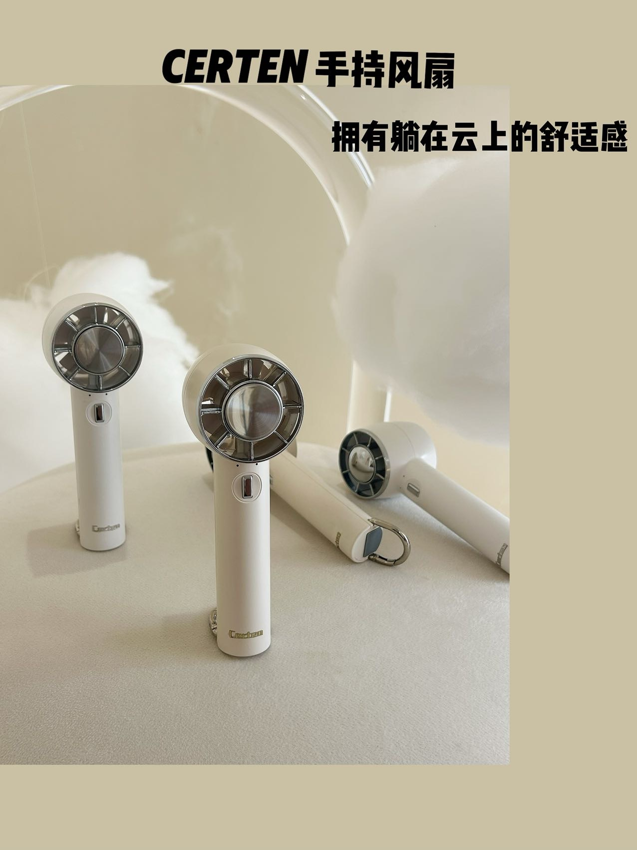 【CERTEN TM黑科技制冷手持风扇】黑科技强效10秒制冷,肌肤冰感十足 黑科技强效10秒制冷,肌肤冰感十足 外观机身小巧、好携带,卡扣设计可挂可手持可站立 轻量型静音,超长待机8小时