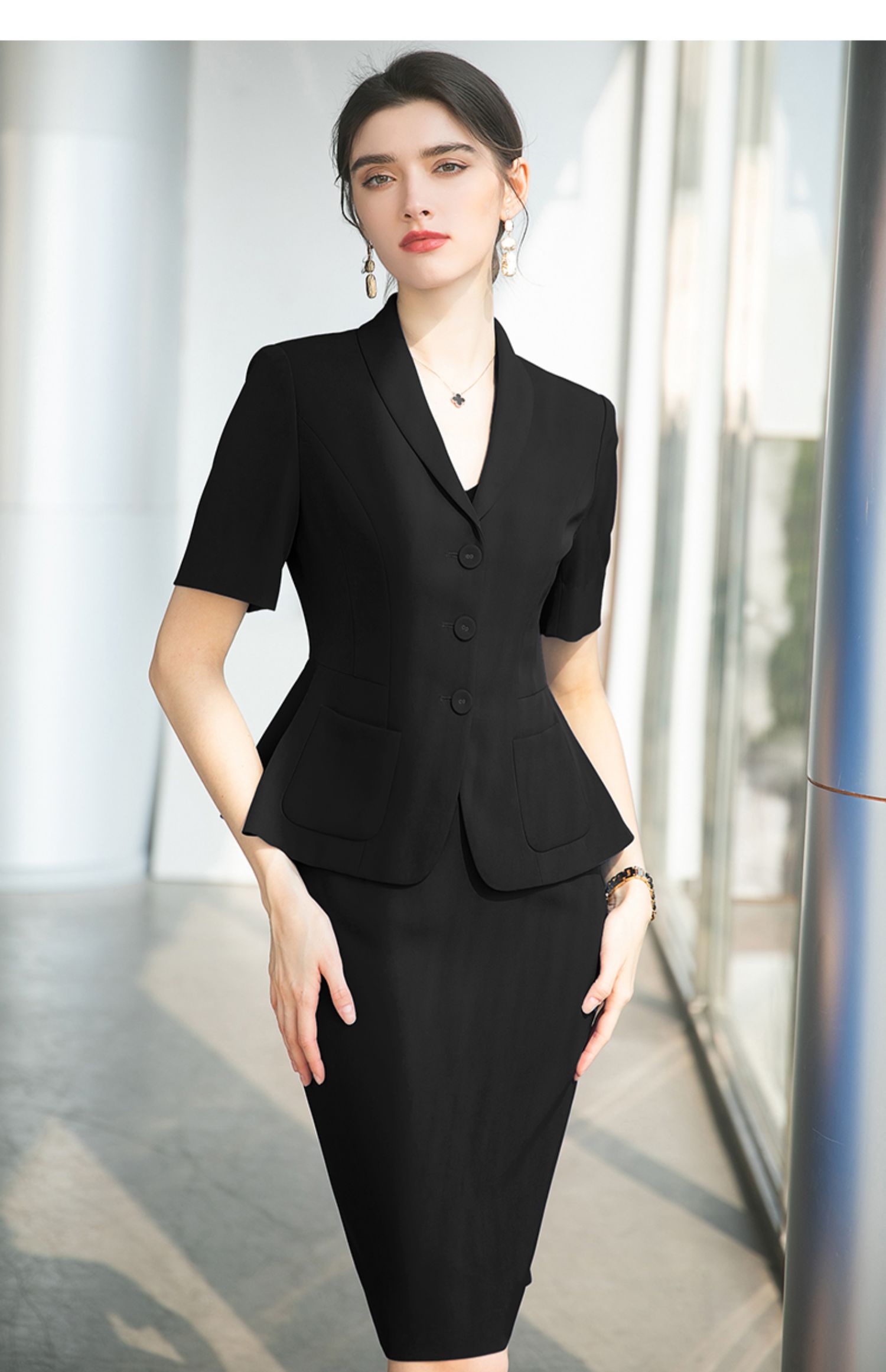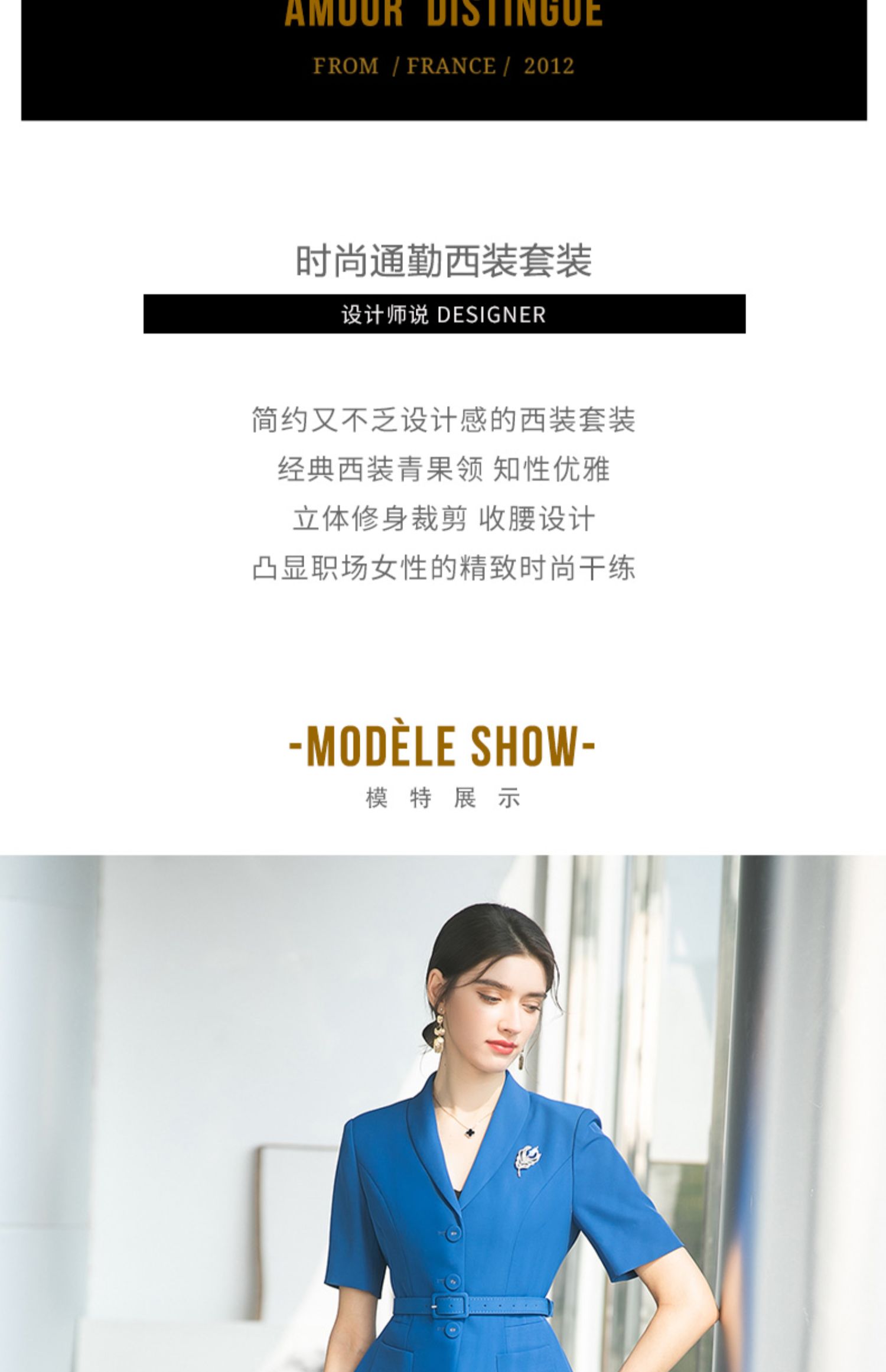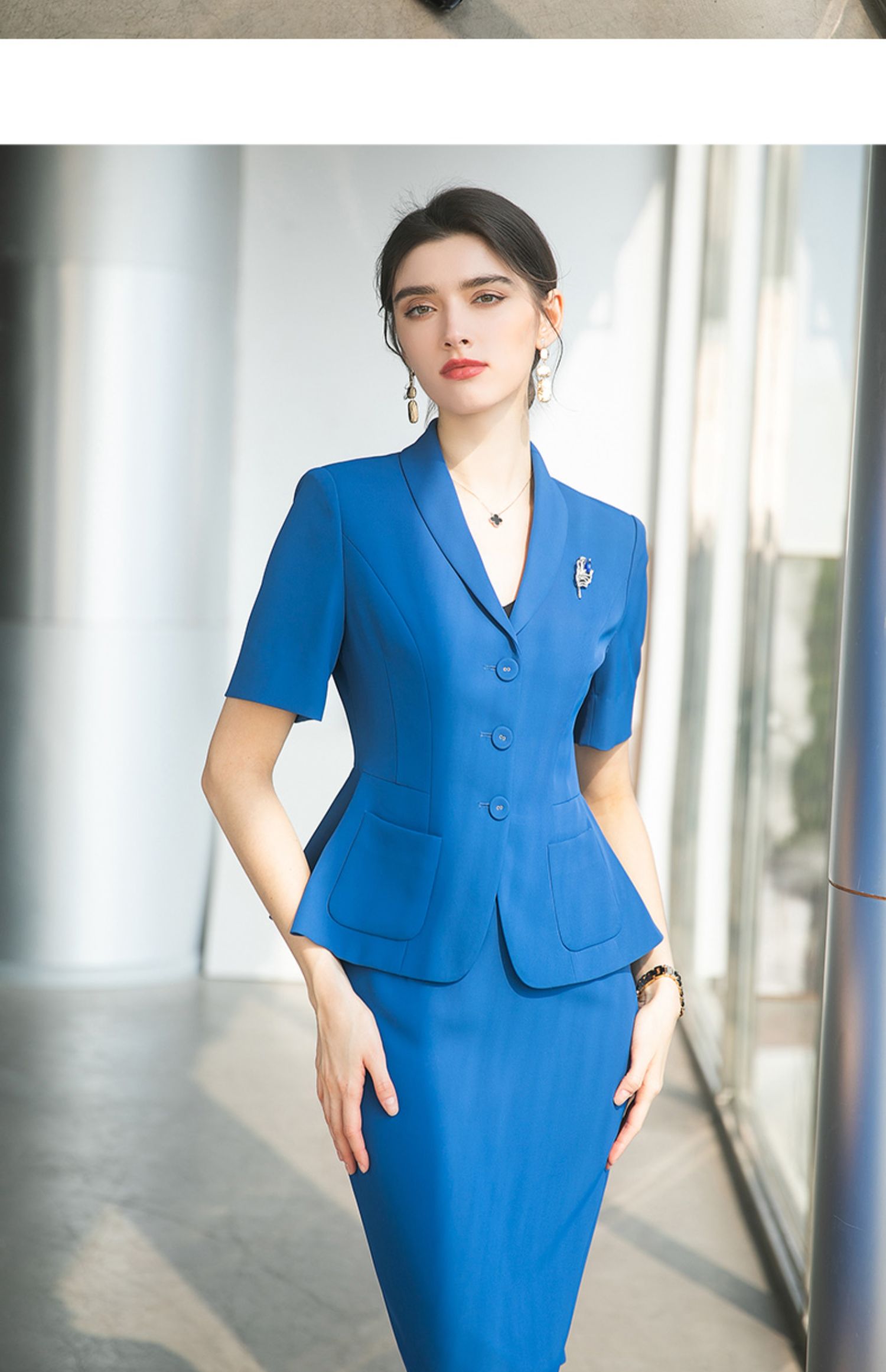AD酒店前台工作装夏季宝蓝色高级感西装套装女收腰显瘦职业工作服