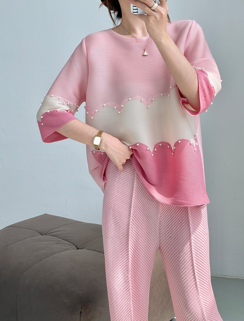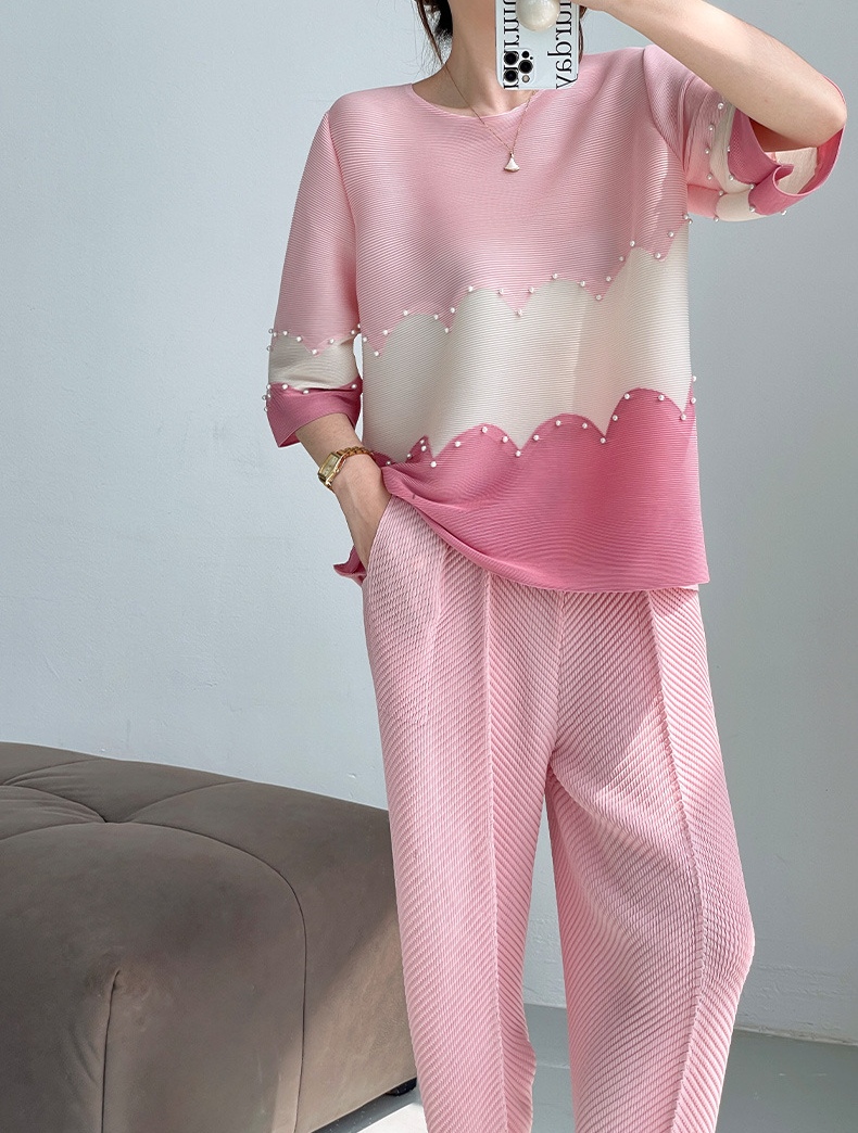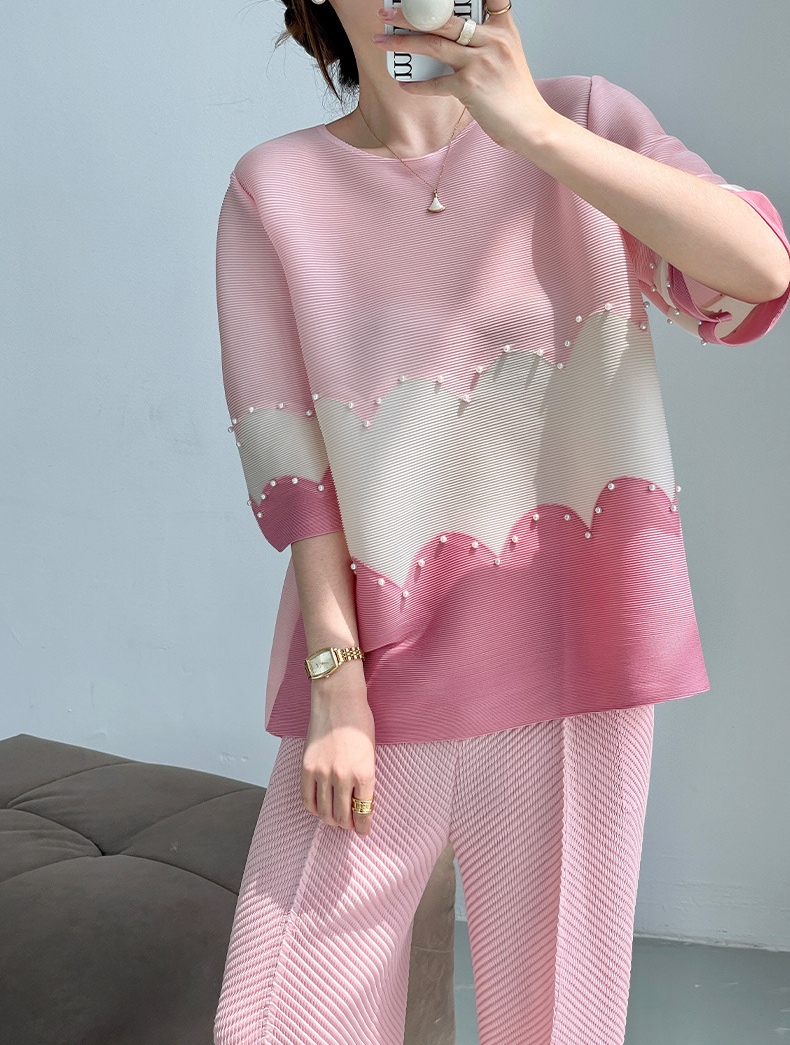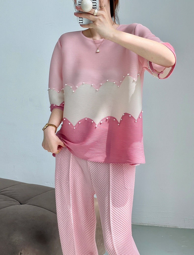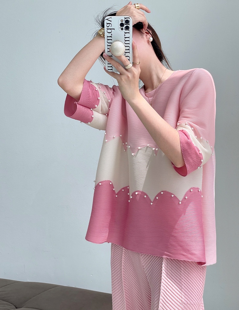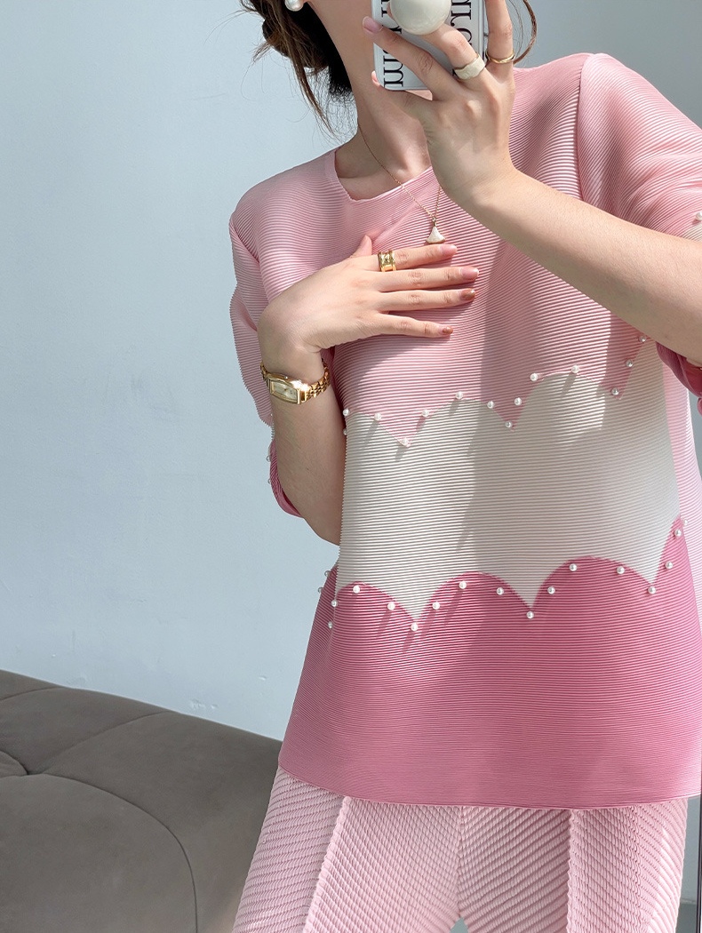 面料选用优质的混纺三丝压褶面料,可以水洗,拉伸性很大,穿着感觉很舒服,面料略带光泽,均匀的褶皱线条,流畅不变形,又不失灵动性,弹力大,遮肉能力超赞!