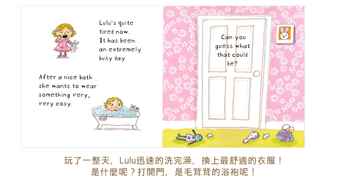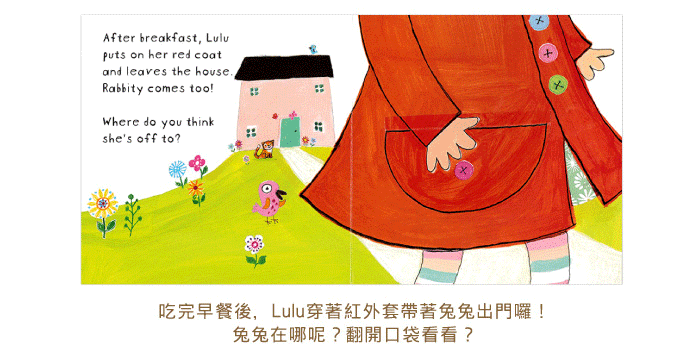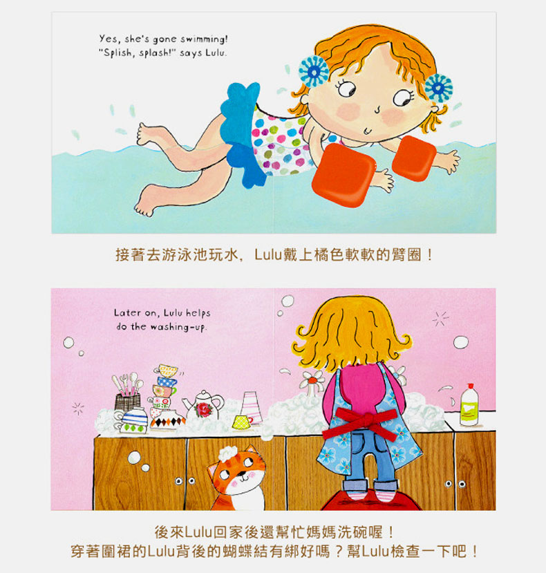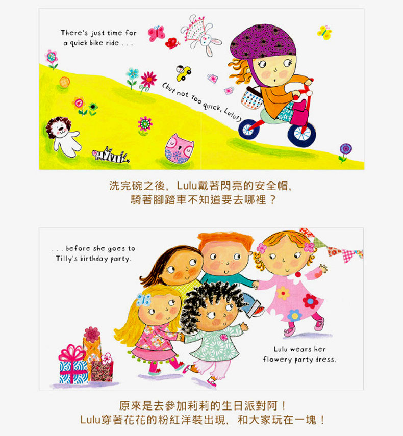 圆圆的脸蛋绑着可爱发夹的小小女孩Lulu,今天将会是很忙碌的一天,穿好自己的粉红衣和红色大外套,吃完早餐后她准备要出门啰~小朋友,快来帮Lulu看看她的拉链有没有拉好?外套的口袋里藏了什么东西呀?游完泳回家还要帮妈妈洗碗,然后迅速地骑着脚踏车去朋友家参加party啰~