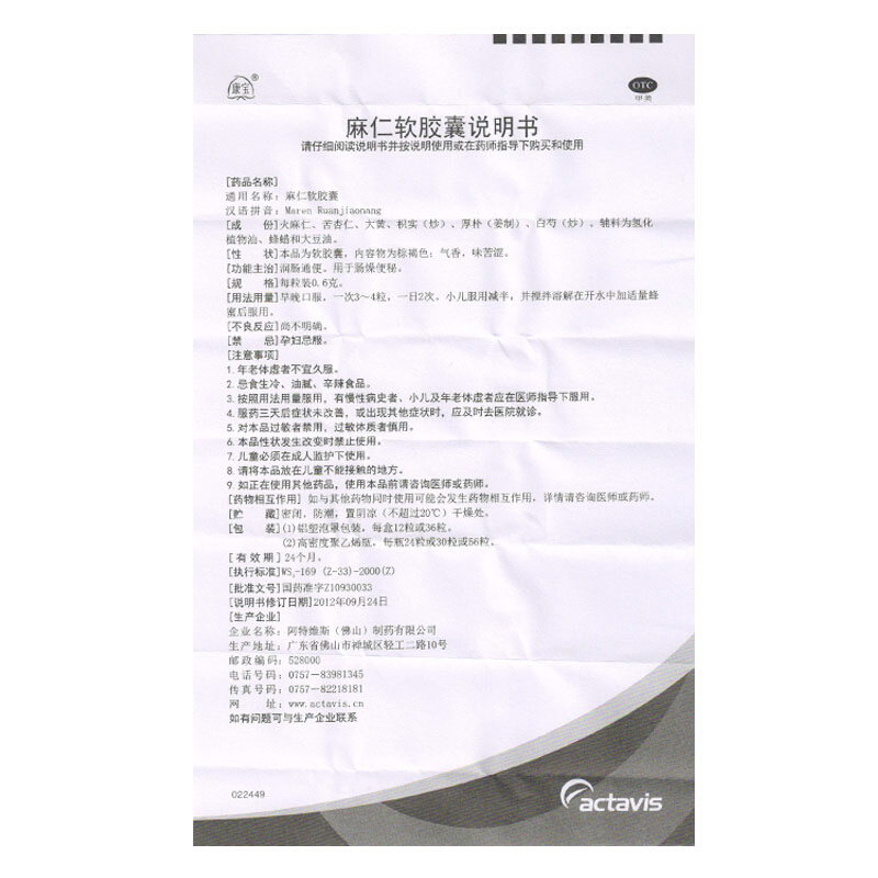 康宝 麻仁软胶囊 0.6g*12粒 润肠通便 肠燥便秘 大便干结药品