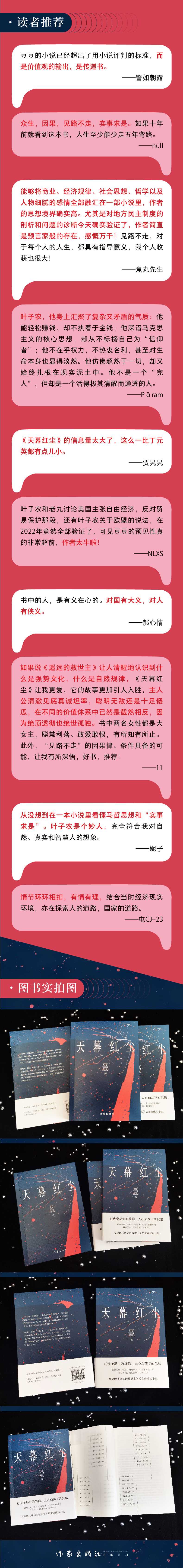 豆豆 已出版《遥远的救世主》《天幕红尘》《背叛》。作品以其对社会现实的犀利洞察,以及深邃的思想内核与哲学思辨广受赞誉,一时洛阳纸贵。改编的电视剧《背叛》《天道》也出乎其类、经久不衰。《天道》更是成为豆瓣9.2高分现象级神剧。