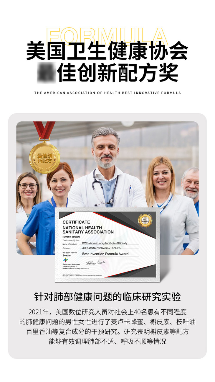 OIWE蜂蜜桉叶油糖果,是由诺贝尔医学奖得主阿尔伯特·哲尔吉,带领世界优秀医学团队与美国专业营养保健品牌OIWE合作,以槲皮素为核心研发的清肺产品。为了将槲皮素、桉叶油、麦卢卡蜂蜜的活性营养保留下来,OIWE团队运用“CO2临界真空提取法,还突破重重检测、审核,才上架到了美国各大药房销售,被美国国家健康卫生协会评为“蕞佳创新配方奖”。而且不仅在畅销全美,更是远销欧洲。也被欧洲生命科学研究协会、世界膳食补充剂协会评为蕞佳营养膳食奖。