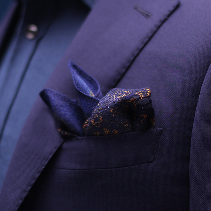 第二款,深蓝底烫裂纹金口袋巾,金色纹作点缀。