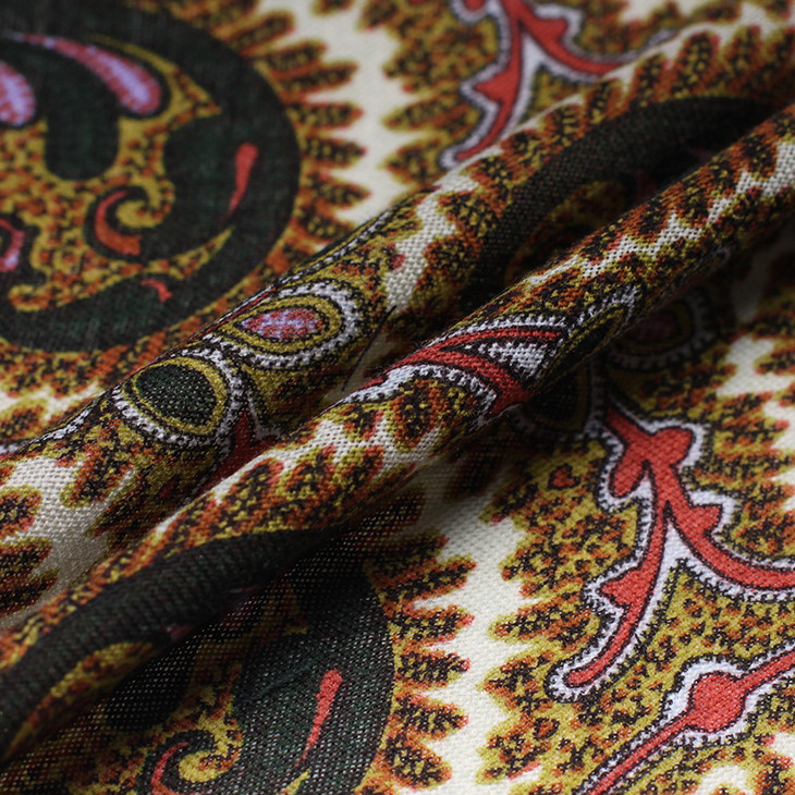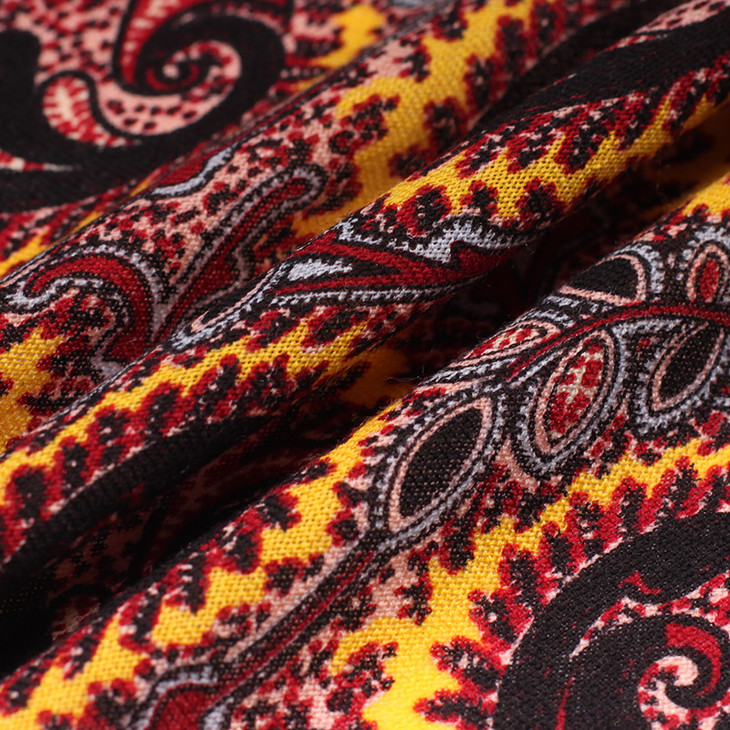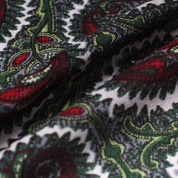 喜欢骚气风格的男士们也有相对艳丽的红色可以选。白底深墨绿佩斯利纹是低调好配,酒红边也不夸张。