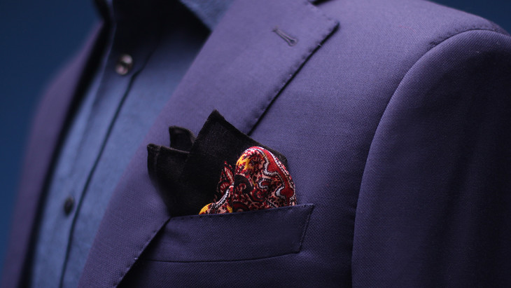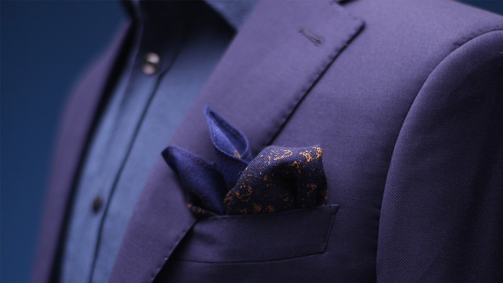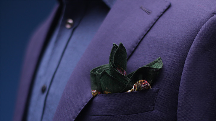 而制作口袋巾的羊毛材质,要用专用面料,质感轻薄,花色也是专门设计和印制,口袋巾的边缘要留宽宽的边色才好看。