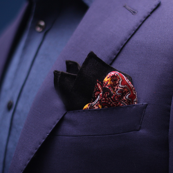 还有一款同系列,黑色边佩斯利纹口袋巾,多露出一点花纹也不会显得太夸张,口袋巾面积小,整体是点缀效果。