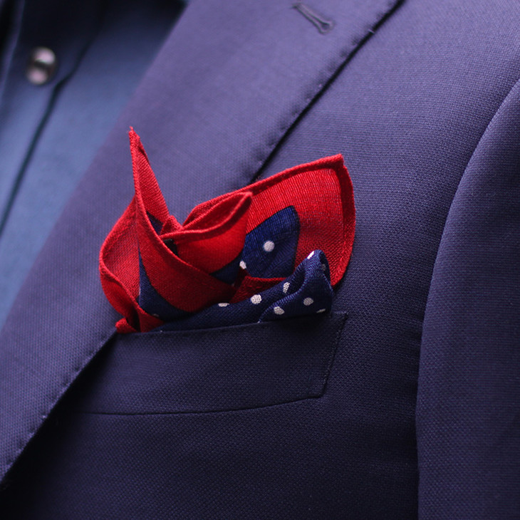 下面这款,深蓝底白点和西装颜色呼应,亮酒红边是整个深色基底的点缀,这款还特别适合喜庆场合,比如参加婚礼用,领结礼服喧宾夺主艳压新郎不讨好,一条小小口袋巾,在众宾客中脱颖而出,让伴娘小姐姐及时注意到你还是没问题的。