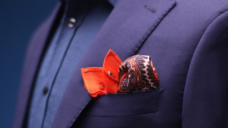不是随便一块羊毛面料锁边就能当口袋巾用了,有些品牌用的是普通羊毛面料,就太厚太累赘。用大块面料裁开做成的口袋巾,往往是单色或者是满地花。