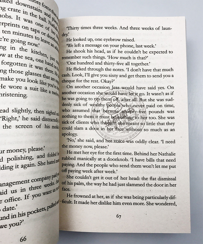 Eighty pounds a week, guaranteed. And holiday pay.” Nathalie let out a scream. “Bloody hell. I actually want to find the tart who left that earring and thump her for losing us our best job. Maybe she didn’t know he was married.” “Oh, she knew.” Before she’d met Dean, Nathalie had spent two years with a man who turned out to have not one but two families on the other side of Southampton. “No single man keeps color- coordinated scatter cushions on his bed.” Neil Brewster does,” Jess said. “Neil Brewster’s music collection is sixty-seven percent Judy Garland, thirty-three percent Pet Shop Boys.” They had cleaned together every weekday for four years, since back when the Beachfront Holiday Park was part paradise, part building site. Back when the developers promised local families access to the swimming pool and assured everyone that a large up- market development would bring benefits to their little seaside town, instead of sucking out what remained of its life. The faded moniker, BENSON & THOMAS CLEANING, was stenciled on the side of their white van. Nathalie had added underneath: A BIT DIRTY? CAN WE HELP? until Jess pointed out that for two whole months half the calls they had received had nothing to do with cleaning. Nearly all their jobs were in the Beachfront development now. Hardly anybody in town had the money—or the inclination—to hire a cleaner, except for the doctors, the solicitor, and the odd client like Mrs. Humphrey, whose arthritis had stopped her from doing it herself. It was a good job on the one hand. You could work for yourself, organize your own hours, pick and choose your clients for the most part. The downside, weird was not the crappy clients (and there always was at least one crappy client) or that scrubbing someone else’s toilet somehow left you feeling like you were one step lower on a ladder than you had planned to be. Jess didn’t mind pulling lumps of hair out of other people’s plugholes or the fact that most people who rented holiday homes seemed to feel obliged to live like pigs for a week. What she didn’t like was that you ended up finding out much more about other people’s lives than you really wanted to. Jess could have told you about Mrs. Eldridge’s secret shopping habit: the designer shoe receipts she stuffed into the bathroom bin, and the bags of unworn clothes in her wardrobe, the tags still firmly attached.