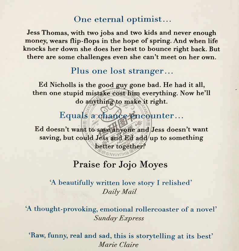 ★美国独立书商协会热力推选,美国豆瓣Goodreads读者选择年度小说 ★《纽约时报》、《洛杉矶时报》、《出版人周刊》畅销榜前十 ★同名电影由美国华纳公司拍摄 由风靡欧美的全民畅销书作家乔乔·莫伊斯创作的The One Plus One《一加一》,这又是一部叫人难以抗拒的爱情故事。一个单身妈妈,一个不断出岔子的家庭,一个古怪的陌生人,他们在彼此落魄的时候相逢,然后一路向着国家的另一个边际前进。在这个过程中,他们彼此的了解不断加深,故事也向着未知且美好的结局延伸开来。 媒体评论:“莫伊斯,经典爱情小说销量女王,她从不叫人失望。这是继《我就要你好好的》之后又一本圈粉巨制。”——Elle“万万没想到,这本小说浪漫至极、惊险至极。”——《人物》 “存在于黯淡生活中的浪漫爱情……乔乔的小说再次震撼了读者。”——《娱乐周刊》The beautiful, poignant and utterly compelling Number One bestseller from the internationally bestselling author of Me Before You, After You and Still Me.One eternal optimist…Jess Thomas, with two jobs and two kids and never enough money, wears flip flops in the hope of spring. And when life knocks her down she does her best to bounce right back. But no one told her it's okay to ask for help. Plus one lost stranger…Ed Nicholls is the good guy gone bad. He had it all, then one stupid mistake cost him everything. Now he'll do anything to make it right. Equals a chance encounter…Ed doesn't want to save anyone and Jess doesn't want saving, but could Jess and Ed add up to something better together? Praise for The One Plus One:'A beautifully written love story I relished'--Daily Mail 'A heartbreaking, laugh-out-loud, roller coaster'--Sunday Express 'An uplifting, charming, life-affirming tale that you won't want to put down'--Heat 'Raw, funny, real and sad, this is storytelling at its best'--Marie Claire