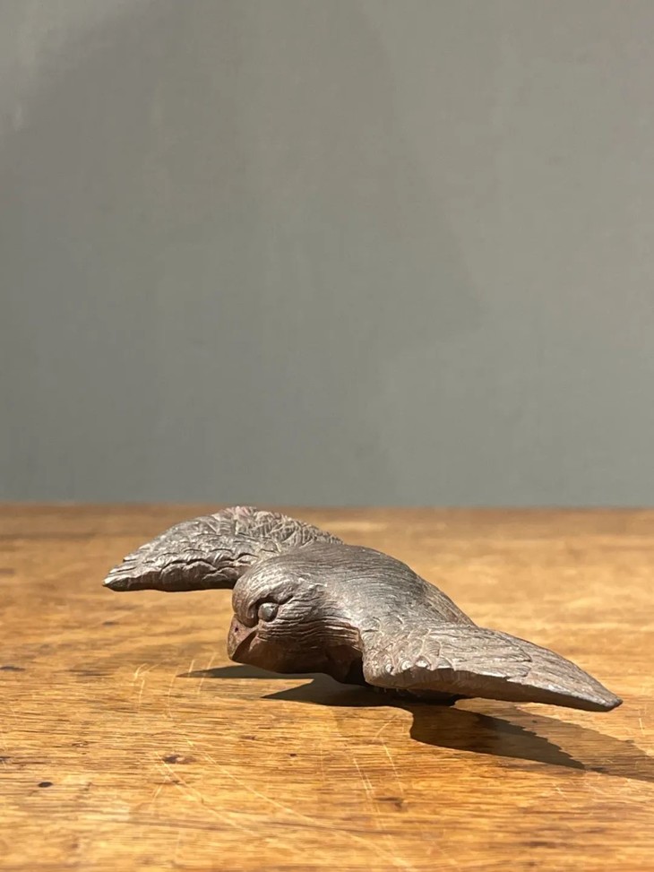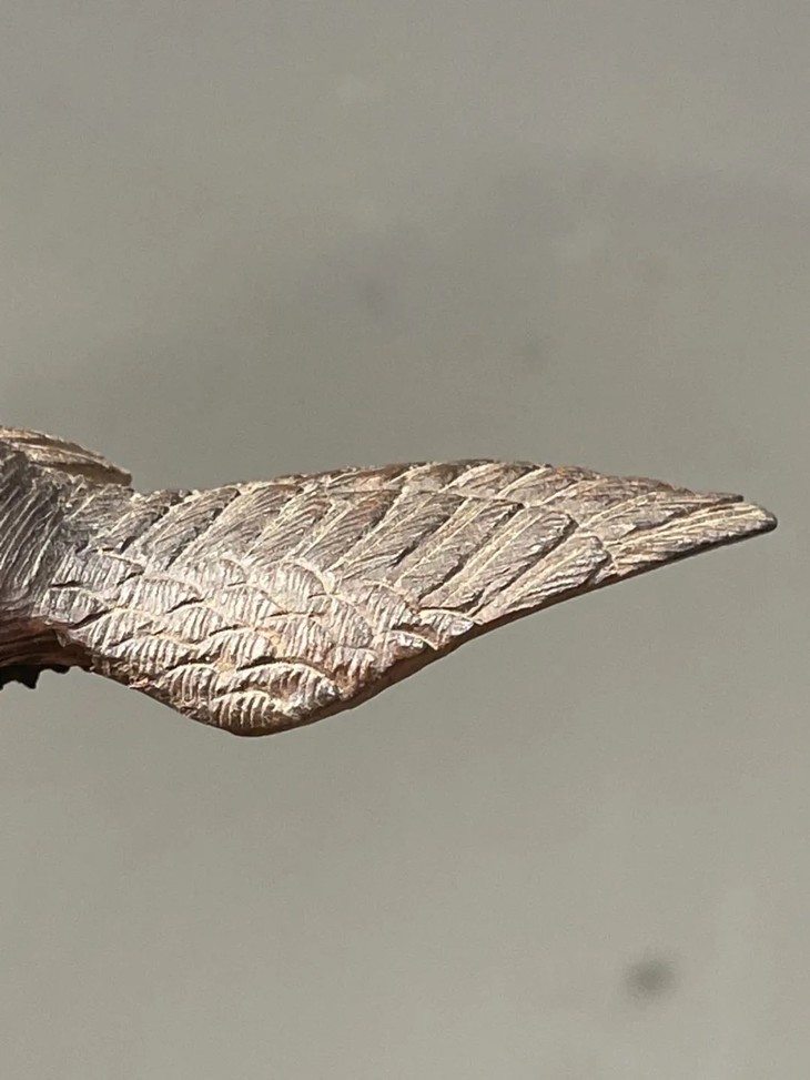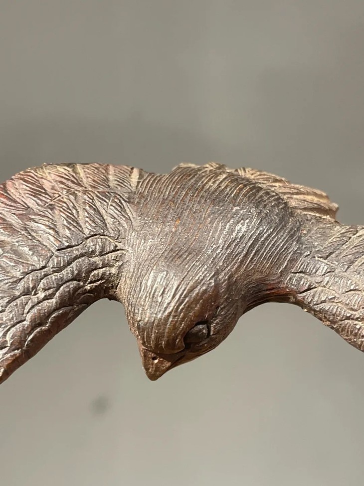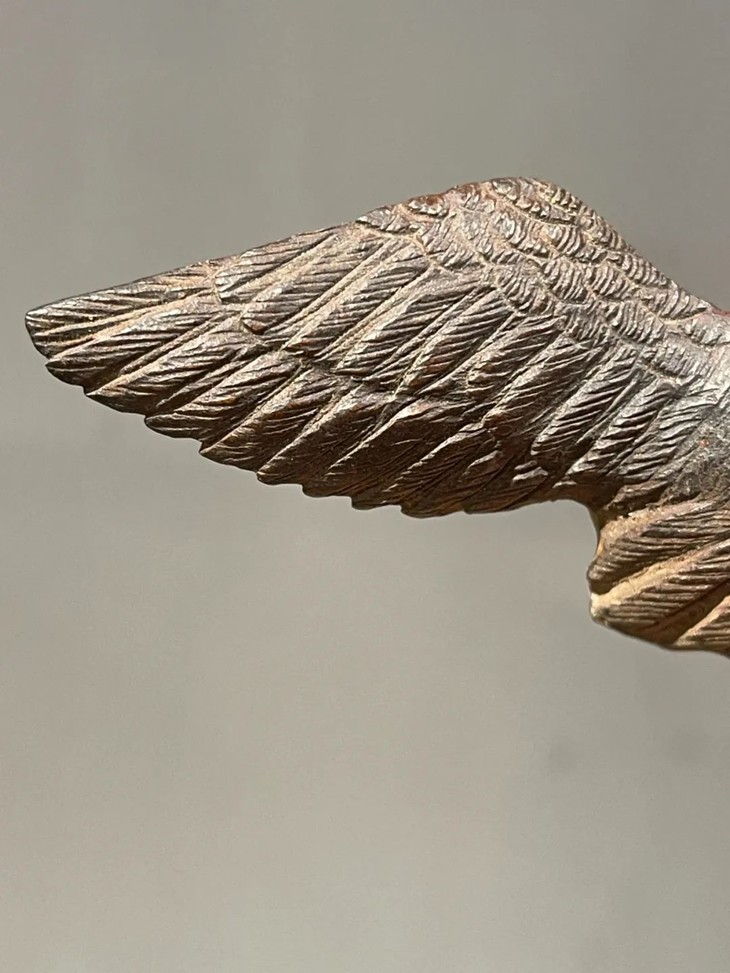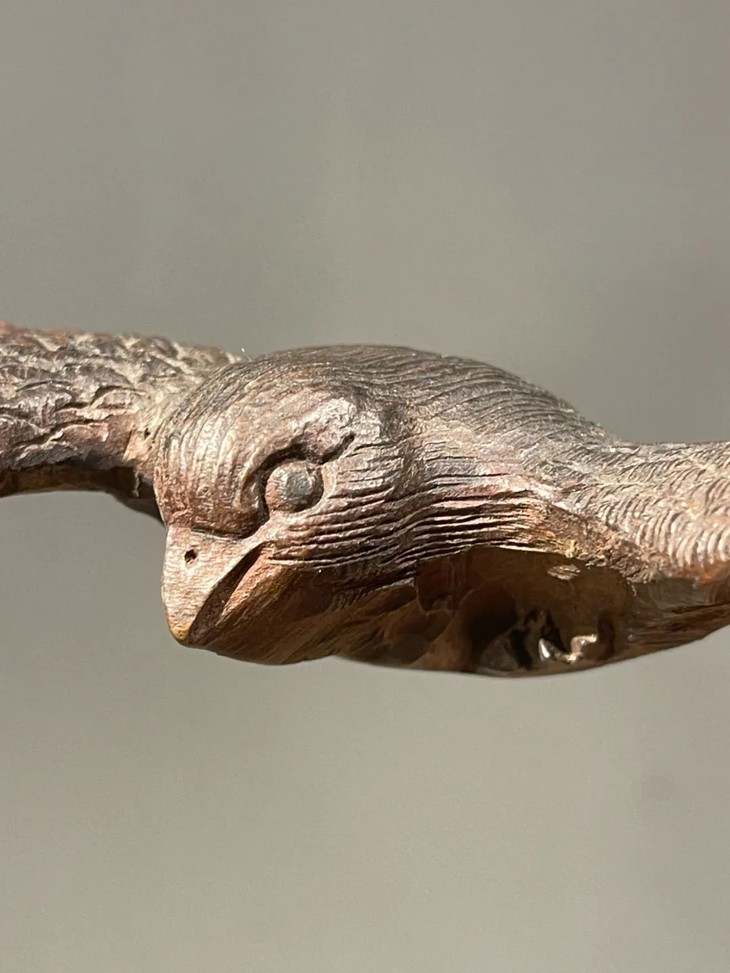 此柏木雕翱翔老鹰把玩件,除浅层短裂痕,表面细微磨损与刮痕以及边沿小剥落外,保存品相完美,柏木表面包浆皮壳温润细滑,是一原汁原味的清代文人随手把玩小木雕。