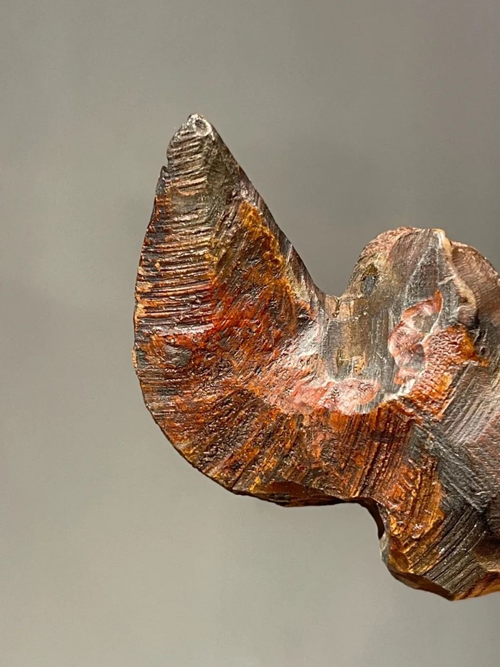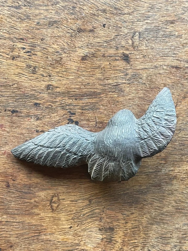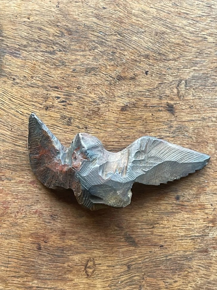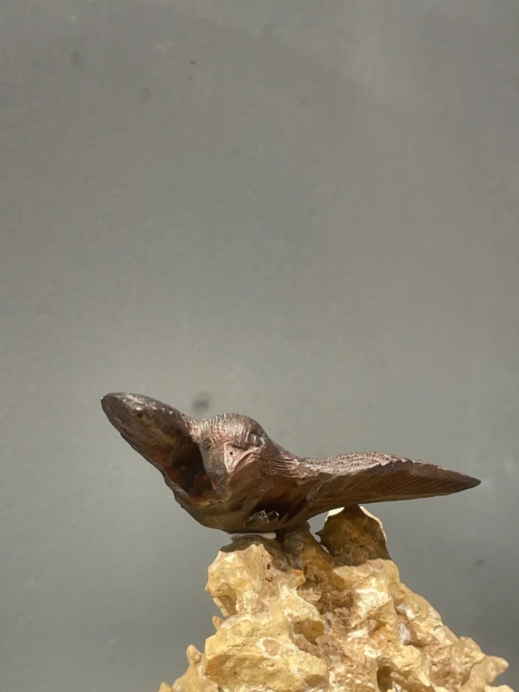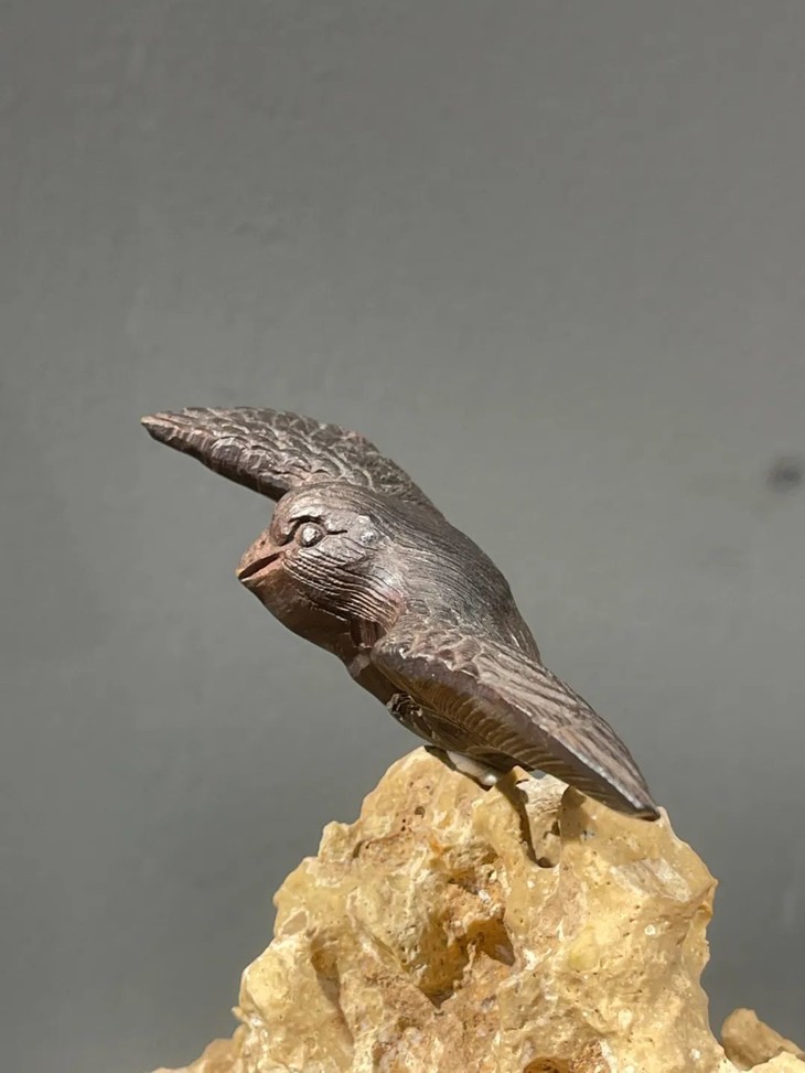 此柏木雕翱翔老鹰把玩件,除浅层短裂痕,表面细微磨损与刮痕以及边沿小剥落外,保存品相完美,柏木表面包浆皮壳温润细滑,是一原汁原味的清代文人随手把玩小木雕。