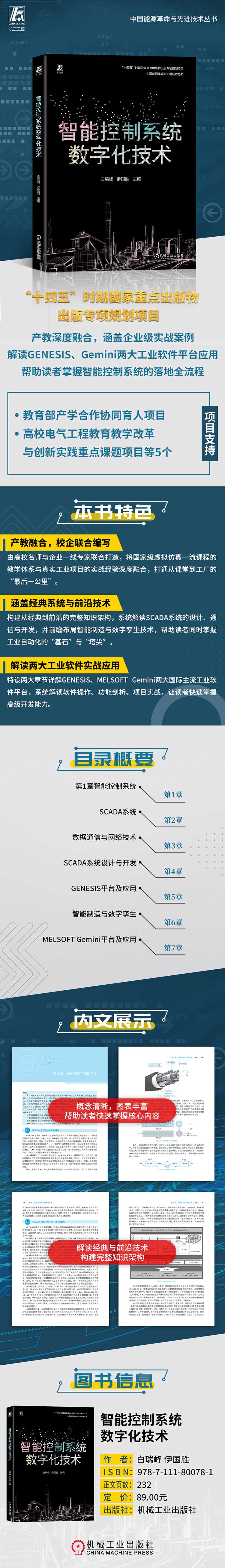 本书立足智能控制系统数字化技术前沿,系统地整合理论成果与工程实践经验,旨在构建适应产业变革的知识体系。内容包括智能控制系统、SCADA系统、数据通信与网络技术、SCADA系统设计与开发、GENESIS平台及应用、智能制造与数字孪生、MELSOFT Gemini平台及应用。本书涉及知识面广,注重产教深度融合,技术前瞻性强,重视理论与实践相结合。每章都配有思考题与习题,指导读者深入学习。本书可作为工业控制工程师、智能制造技术研发人员的工具书,也适用于高等院校自动化、机器人工程、电气工程等专业本科生及研究生教学,兼顾应用型本科与高职院校电类专业的项目实训需求,助力培养新工科复合型人才,破解产业发展瓶颈。