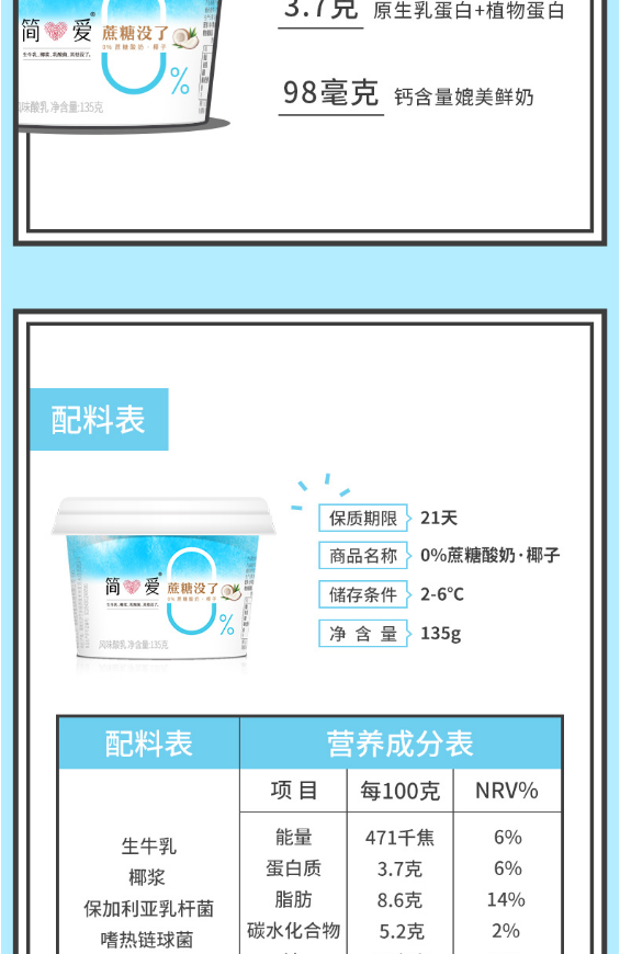 保质期至11.20,简爱0%蔗糖酸奶-椰子135g*1杯,保质期21天