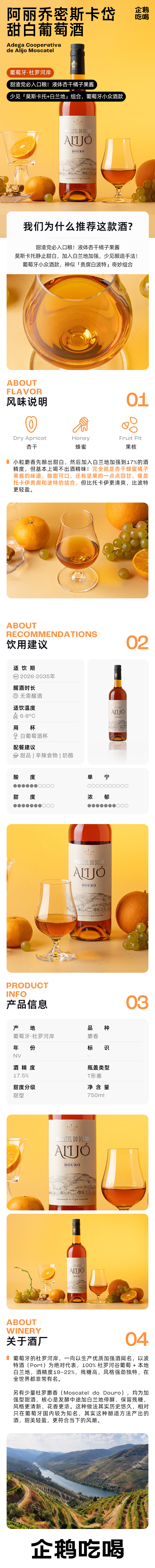 企鹅市集|葡萄牙阿丽乔密斯卡岱甜白葡萄酒 莫斯卡托+白兰地加强甜白 杏子果酱太妃糖