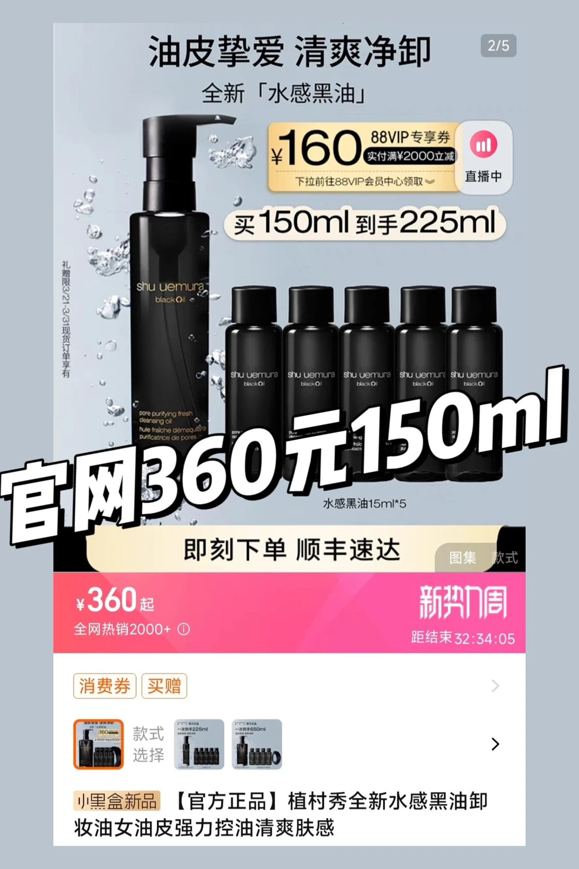 满3瓶起拍~【植村秀水感黑油卸妆油50ml】最最适合油皮的控油卸妆黑油!多孔黑色炭粉+黑米精粹,不仅去油控油还能锁住水分~控油/溶解/保湿三合一!