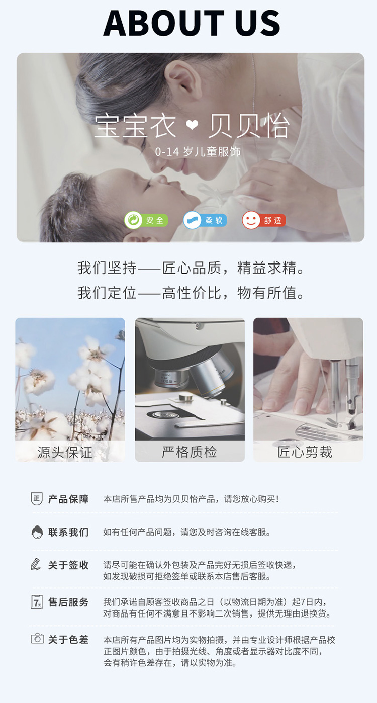 - 贝贝怡专注0-6岁婴幼儿服饰,坚持安全、柔软、舒适的产品理念,为千万中国家庭提供超高品质、安全可靠的婴幼儿服饰产品,妈妈放心,宝宝开心!