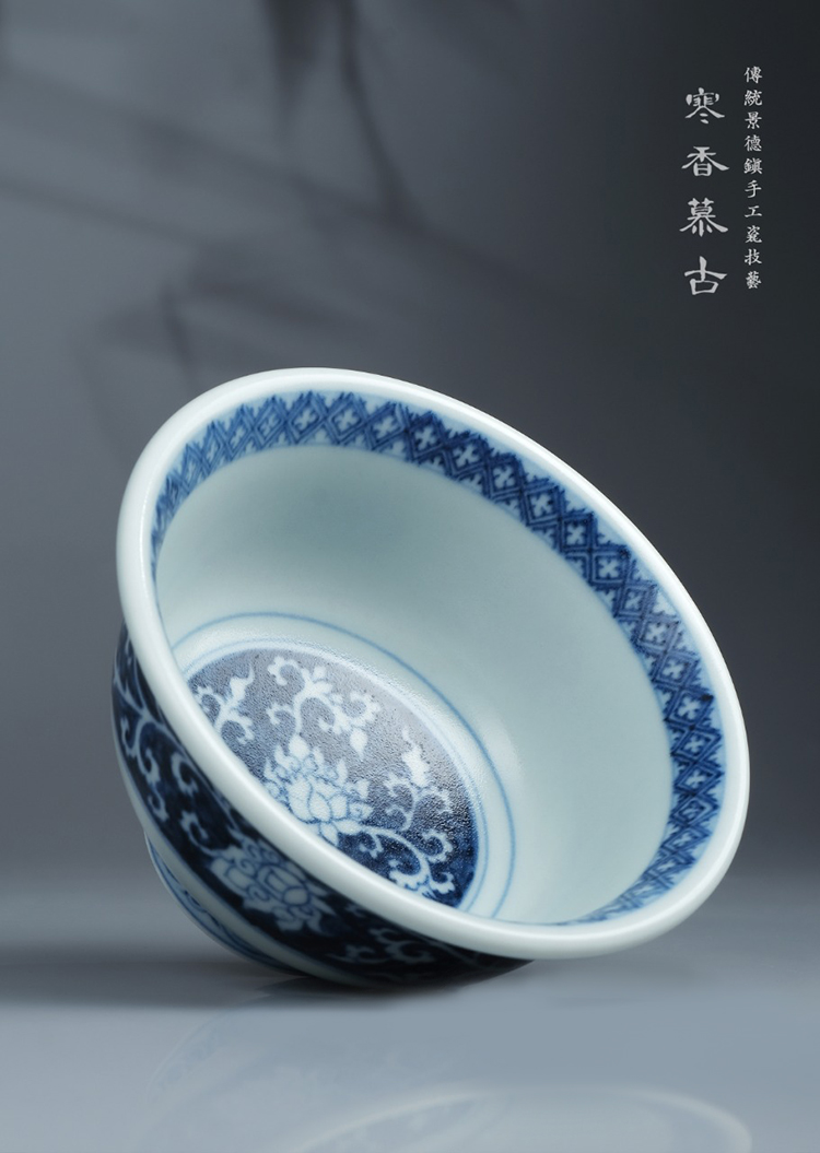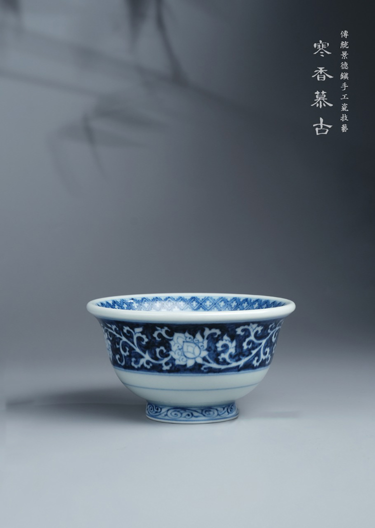 寒香慕古元明青花糯米釉兰地白花纹压手杯