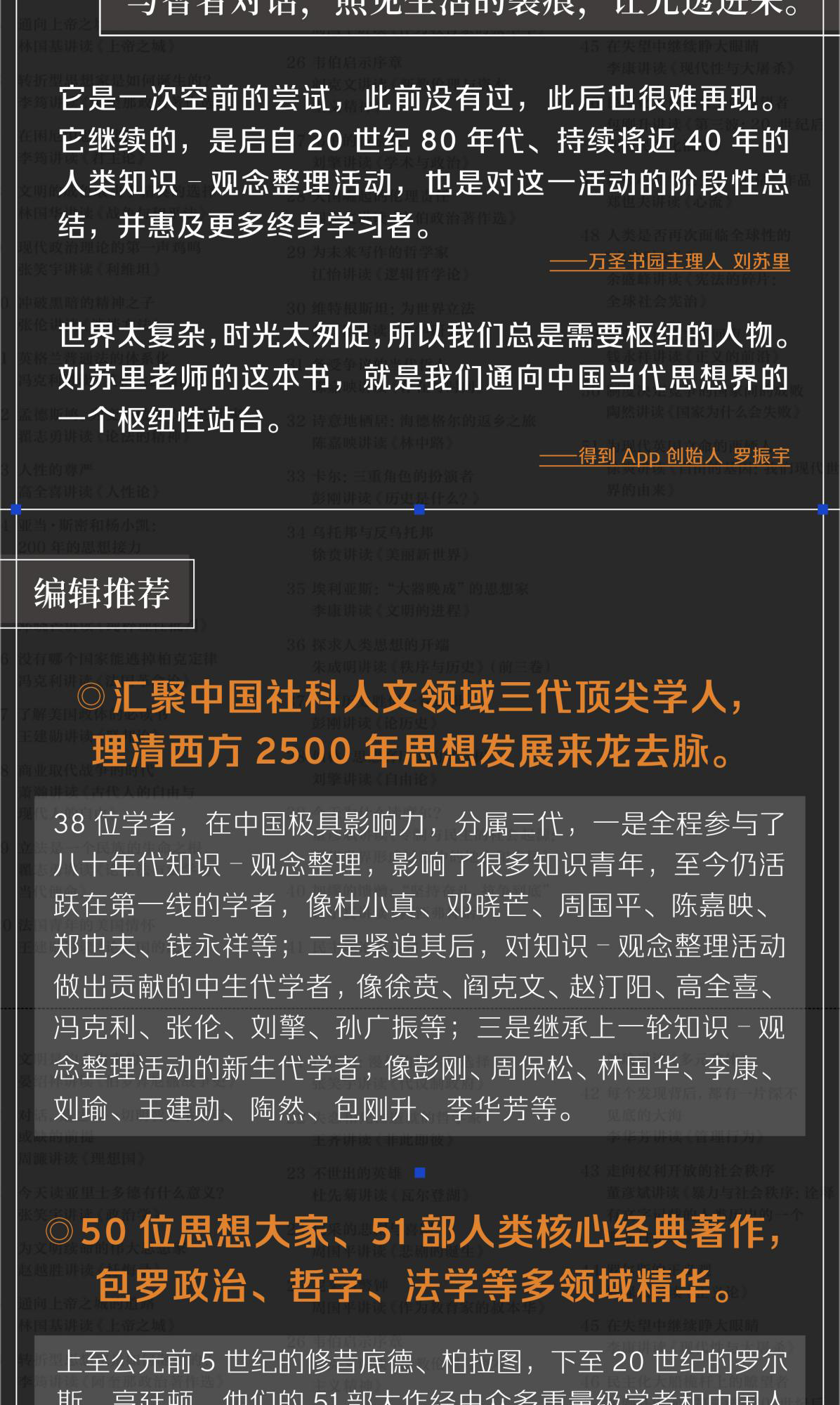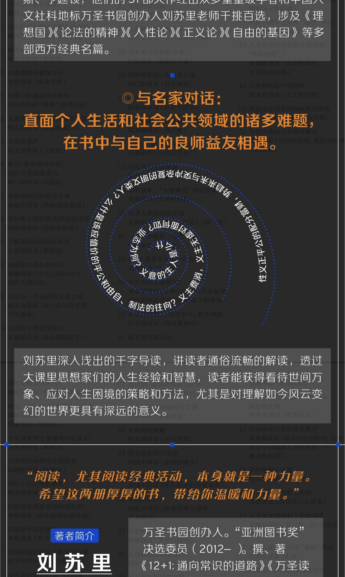 上至公元前5世纪的修昔底德、柏拉图,下至20世纪的罗尔斯、亨廷顿等,绵延2500年,他们的51部大作经由众多重量级学者和中国人文社科地标万圣书园创办人刘苏里老师千挑百选, 涉及《理想国》《论法的精神》《人性论》《正义论》《自由的基因》等多部西方经典名篇。