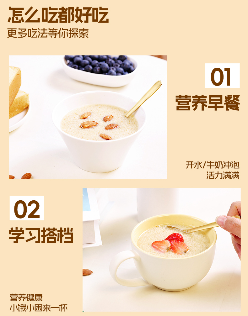 食用方法:90度开水/热牛奶泡2分钟即食,一次一小袋,也可以和米饭、粥一起伴着吃。