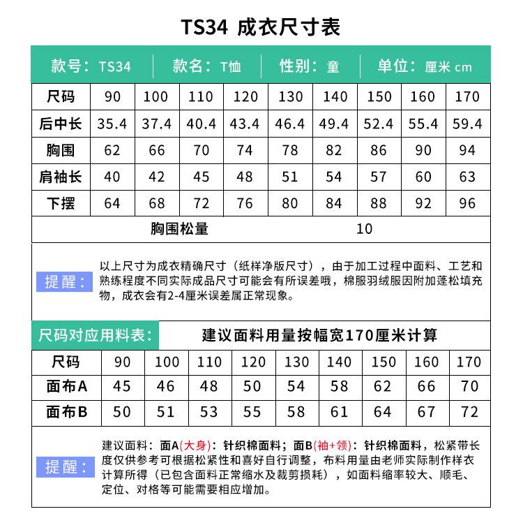 裁缝学苑TS34插肩袖长袖T恤纸样儿童女童圆领打底衫上衣童装服装打板