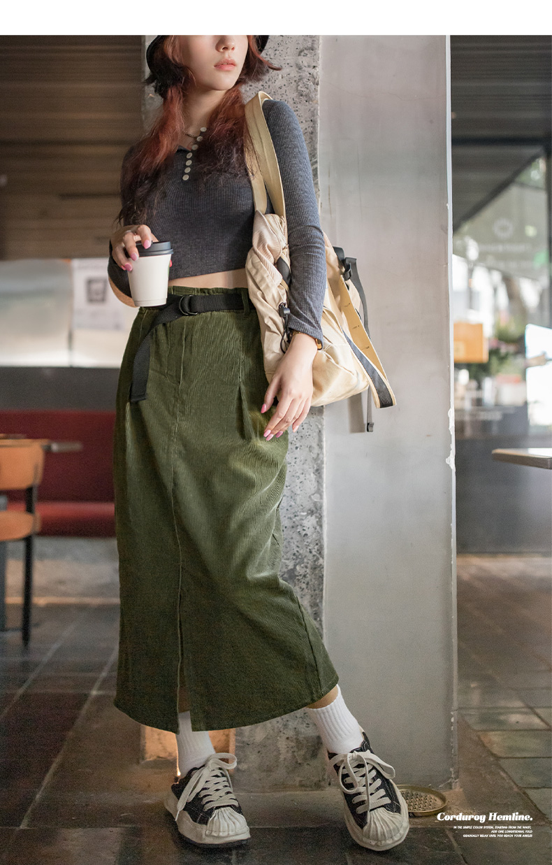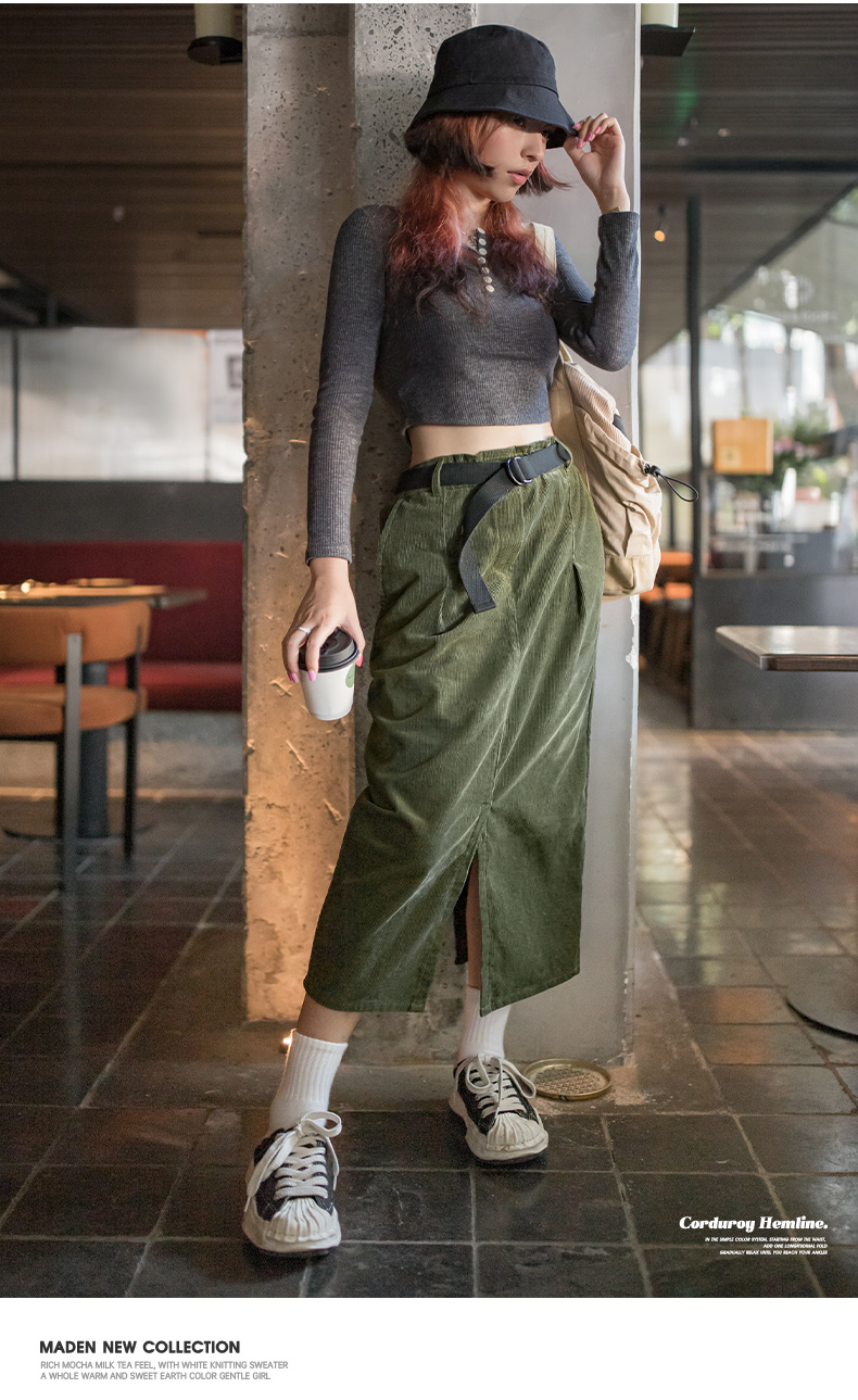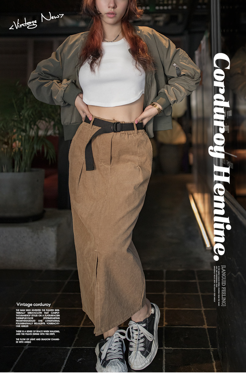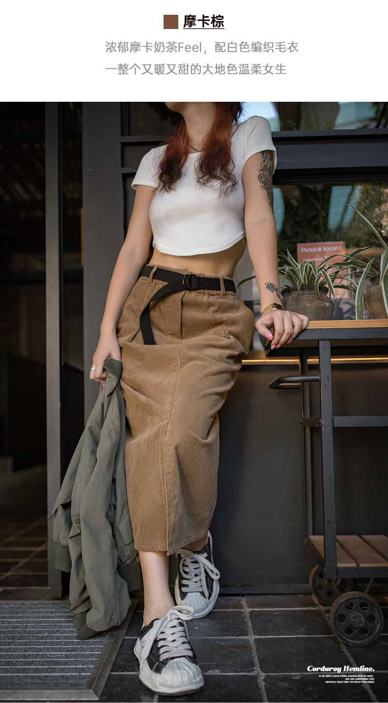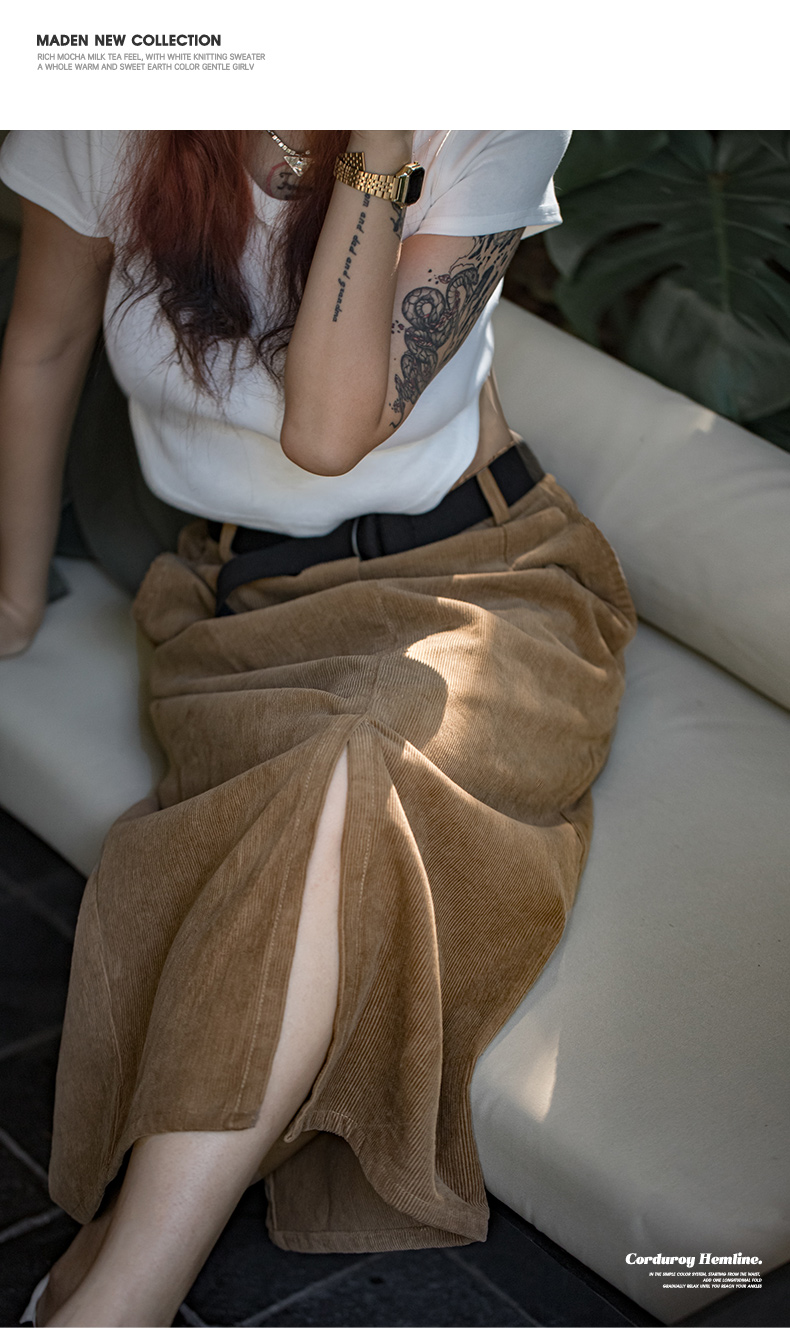 马登美拉德式复古灯芯绒秋冬棕绿色中长裙显瘦开叉包臀半身裙女