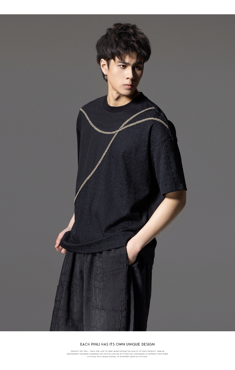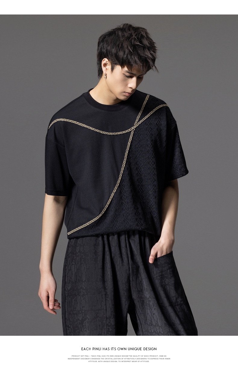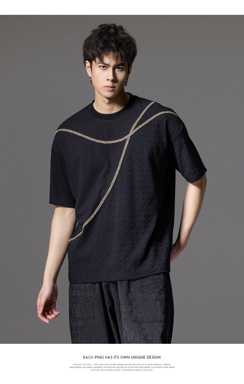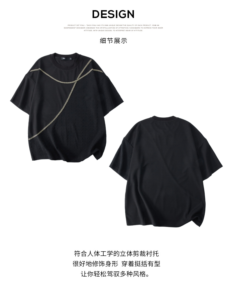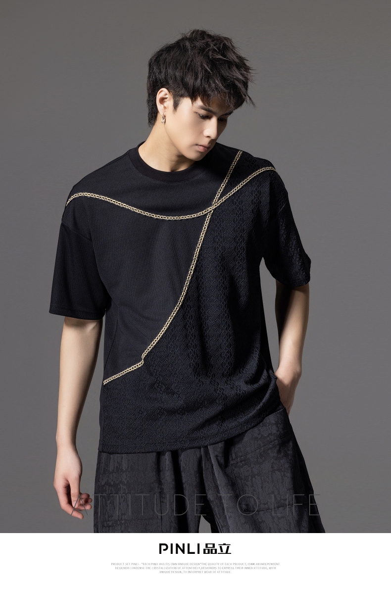 PINLI品立2024夏季新款男士拼接短袖T恤锁链织带潮牌宽松休闲体恤B242111042
