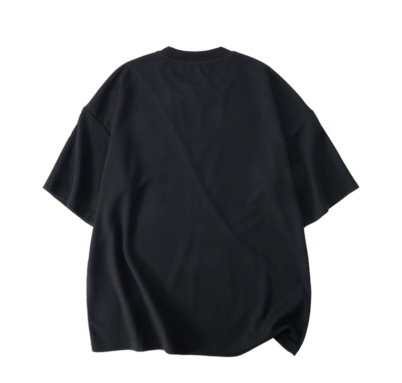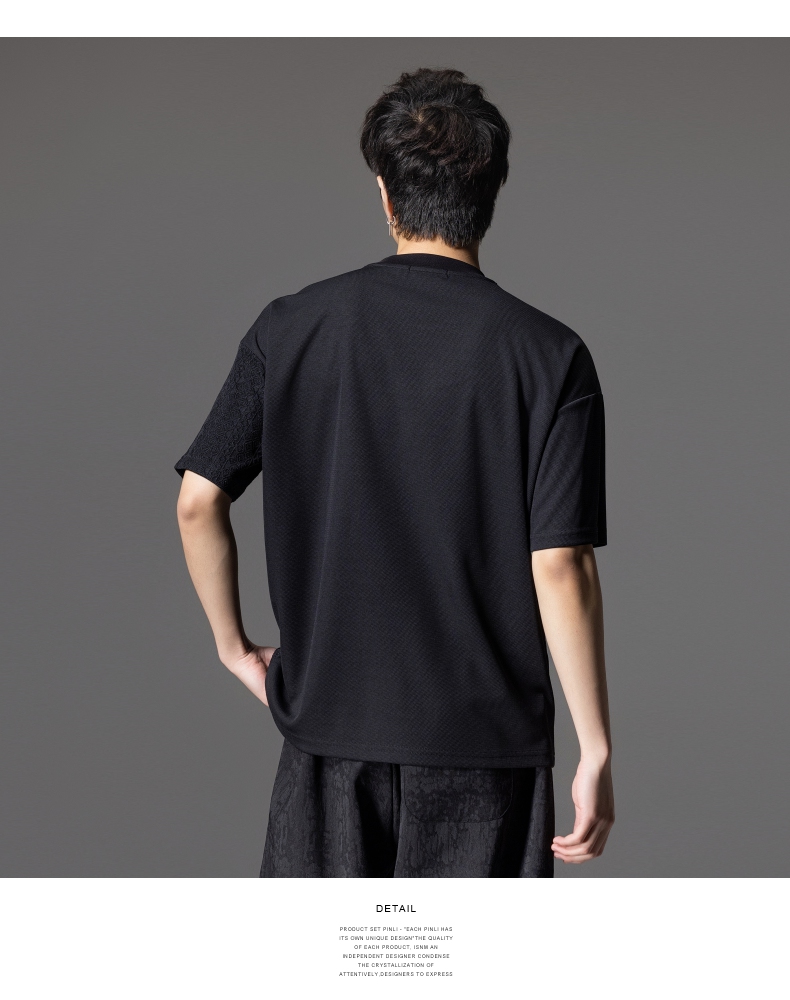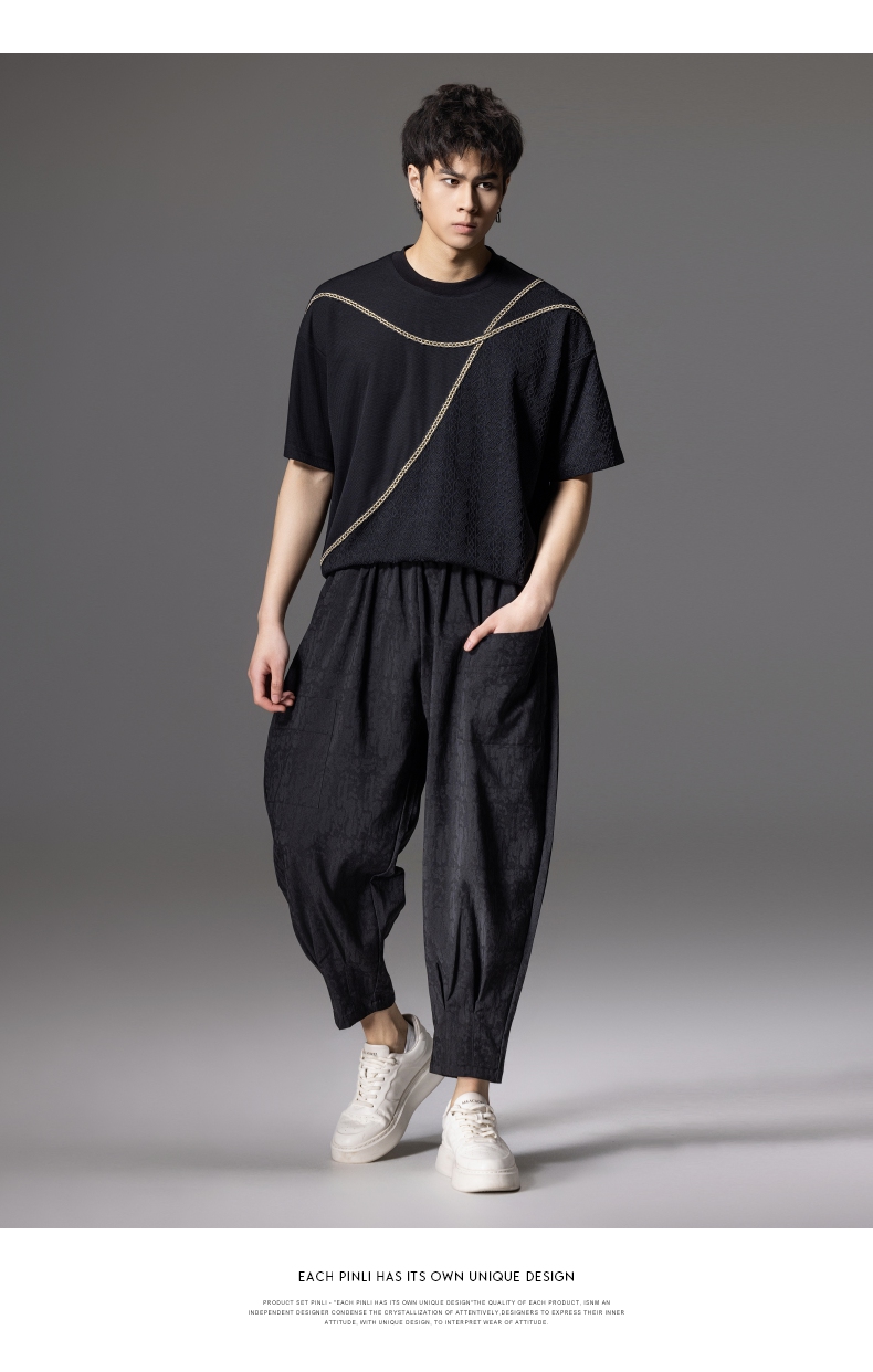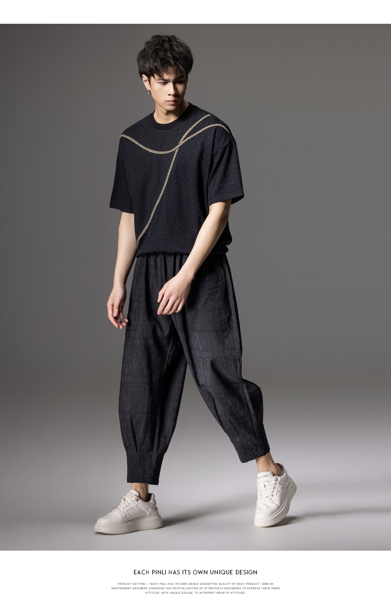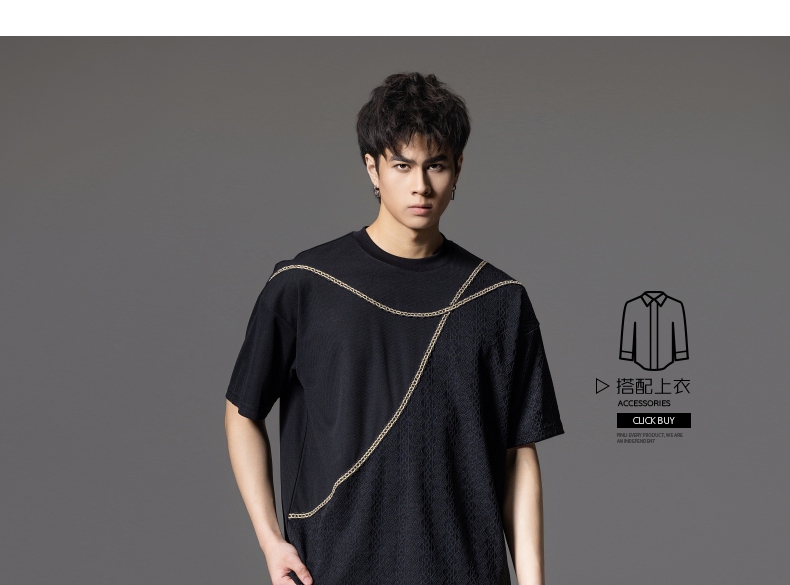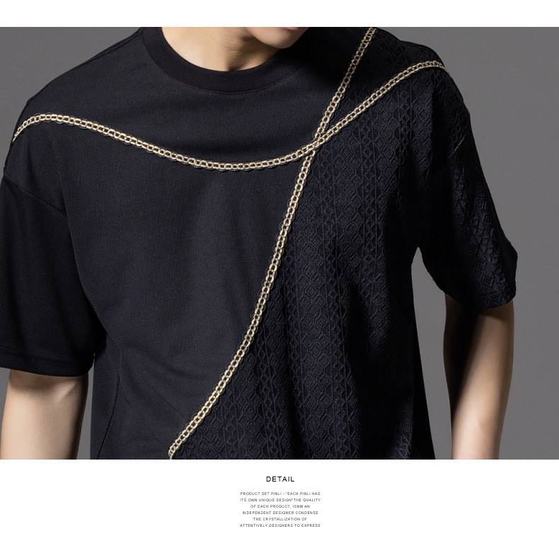 PINLI品立2024夏季新款男士拼接短袖T恤锁链织带潮牌宽松休闲体恤B242111042