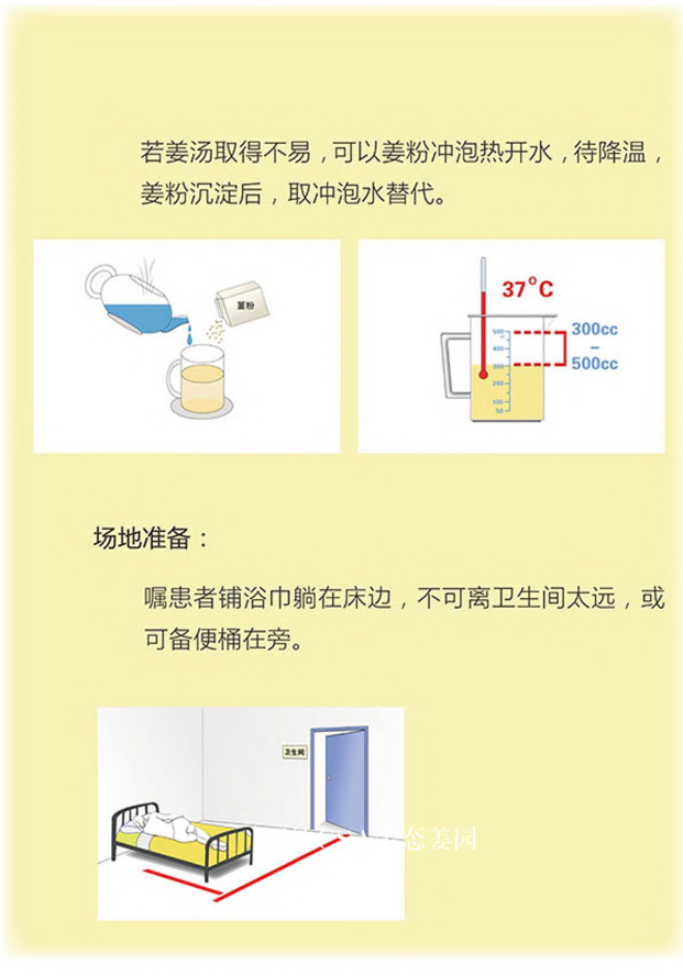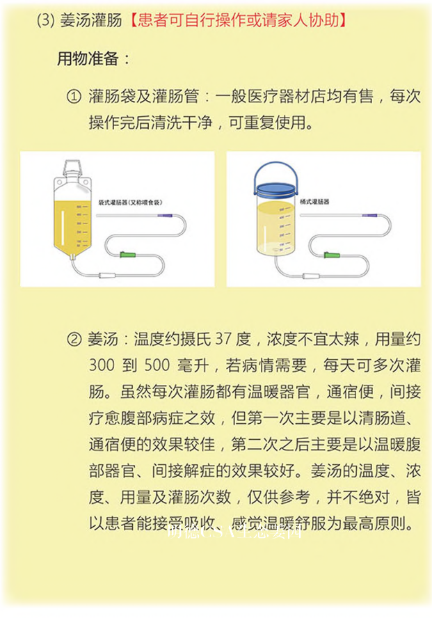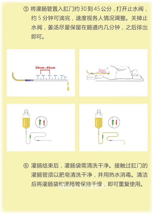 售,每次操作完后清洗干净,可重复使用。②姜汤:温度约摄氏37度,浓度不宜太辣,用量约300到500毫升,若病情需要,每天可多次灌肠。虽然每次灌肠都有温暖器官,通宿便,间接疗愈腹部病症之效,但第一次主要是以清肠道、通宿便的效果较佳,第二次之后主要是以温暖腹部器官、间接解症的效果较好。姜汤的温度、浓度、用量及灌肠次数,仅供参考,并不绝对,皆以患者能接受吸收、感觉温暖舒服为最高原则若姜汤取得不易,可以姜粉冲泡热开水,待降温,姜粉沉淀后,取冲泡水替代。场地准备:嘱患者铺浴巾躺在床边,不可离卫生间太远,或可备便桶在旁。①将姜汤倒入灌肠袋中,挂于高处(约一人高)。②打开灌肠管上的止水阀,让姜汤流出使灌肠管内空气排出,之后再关上止水阀。③嘱患者侧躺并将上面的腿自然弓起,露出臀部。④灌肠管以软管为宜,操作者戴上一次性手套,并于末端涂上凡士林,用拇指与中指掐住末端约7公分处,两指轻推将灌肠管置入肛门,此时灌肠管因受力会弯曲,用食指轻轻压挤弯曲处以方便灌肠管顺利进入肛门。⑤将灌肠管置入肛门约20-30到45公分(视人体身高而变),打开止水阀,约5分钟可滴完,速度视各人情况调整。关掉止水阀,姜汤尽量保留在肠道内几分钟,之后排出即可。⑥灌肠结束后,灌肠袋需清洗干净。接触过肛门的灌肠管须以肥皂清洗干净,并用热水消毒。清洁后将灌肠袋和灌肠管保持干燥,即可重复使用。