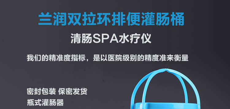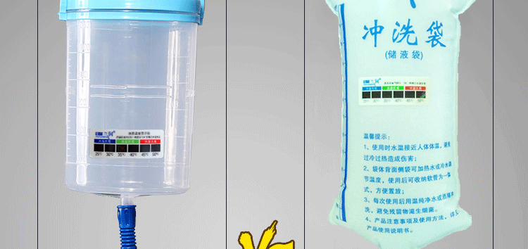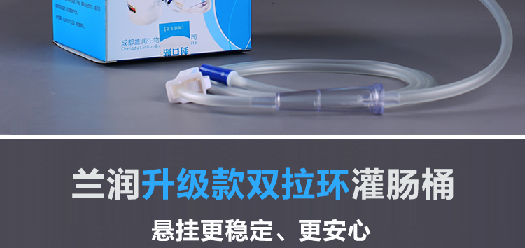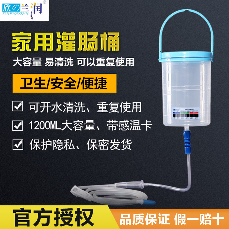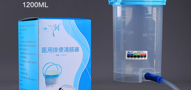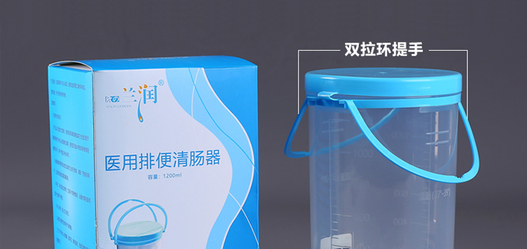 排便清肠器(灌肠桶1200ml)【产品型号】:LR/QCQ-II-A-1200A【包装规格】:1支/盒【产品备案编号】:川蓉械备20160021号【产品技术要求编号】:川蓉械备20160021号【产品生产备案编号】:川蓉食药监械生产备20160007号【产品主要结构及性能】:由容器和冲洗头组成,通常由医用聚乙烯材料制成。【产品预期用途】:用于便秘患者排便【使用方法】:1、先将容器悬挂在高于身体的墙体或挂钩架上2、关闭流量调节阀3、将温水或药液灌入容器内4、将冲洗头缓缓送入肛门内5、打开流量调节阀让温水或药液流入即可清洗【注意事项】:1、使用前先清洗手2、产品以非无菌方式提供,使用前用消毒酒精或其它适合的医疗器械消毒剂对冲洗头表面擦拭消毒,使用后用温水将医用排便清肠器清洗干净,晾干并置洁净处保存。3、根据病情所需药液浓度及配制方法进行配制,请按“药液说明书”上的要求配制或遵医嘱配制。4、孕妇、消化道出血患者、肛肠手术患者慎用,必要时需在医师或护士指导下使用。5、专人专用,禁止交叉使用。6、避免与腐蚀性液体和气体接触。7、为了你和他人的健康,废弃后,请先毁形,再按日常生活垃圾处理即可。