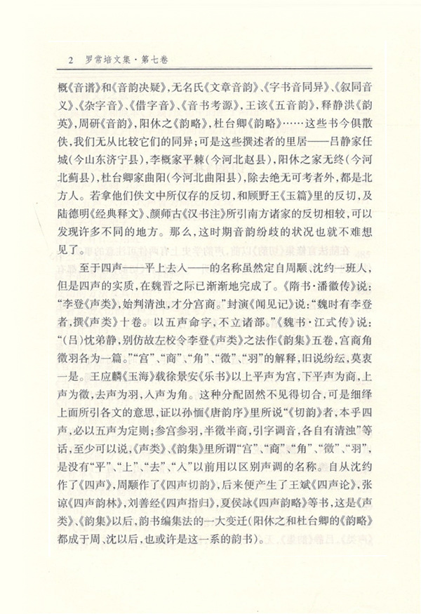 这一卷的文章,都是关于汉语音韵学的,包括学术研论文、音韵学知识讲话、书评和序跋。这些文章,多数曾发表过,或曾收入《罗常培语言学论文选集》,少数是未刊手稿或抄正稿。这次编辑整理,对于已经发表过的,改正了原印件上的错误。限于当时的印刷条件,这类排印上的讹夺衍误的例子还不少。我们能找到原稿的,就据原稿来校改,找不到原稿的,就尽量揣摩先生的用语行文习惯加以校改。对于未刊手稿或手稿抄件,严格保持原样,只是按这次出版统一体例的要求,作些必要的加工。手稿中一篇《大高殿校勘(韵镜)日记》,是经张清常整理过的,这次又据原稿复核过。稿中有几处摘录的外文材料和图表,因排印不便,按张清常的意见,付诸阙如。本卷由杨耐思编校。2007年后本卷由杨耐思、麦耘编校。