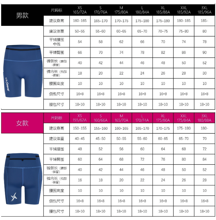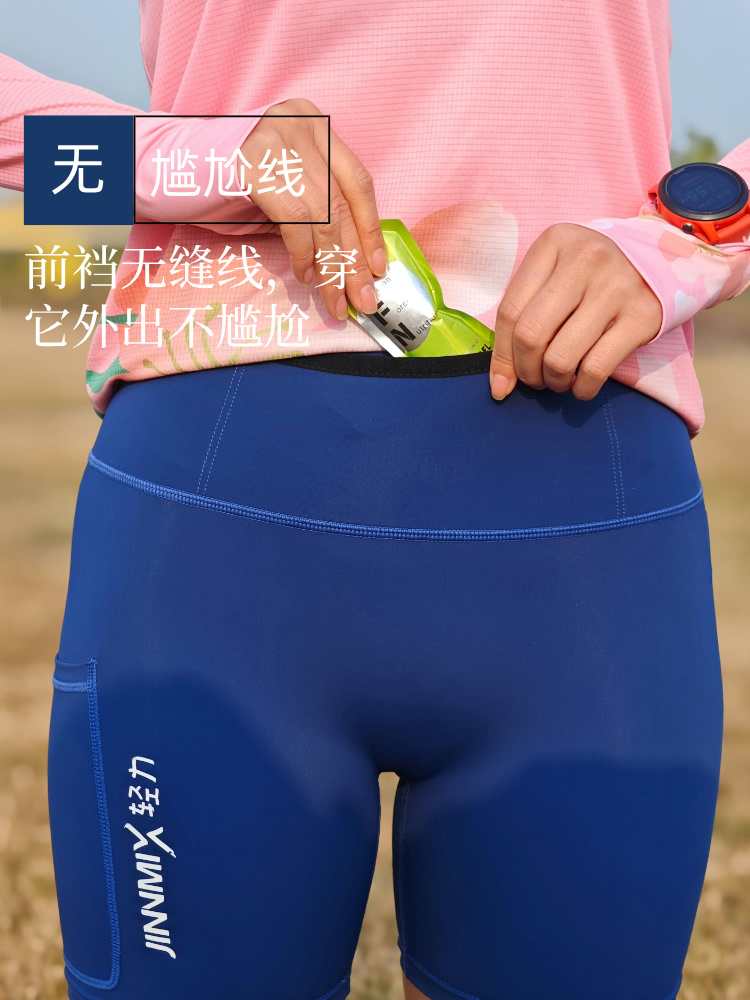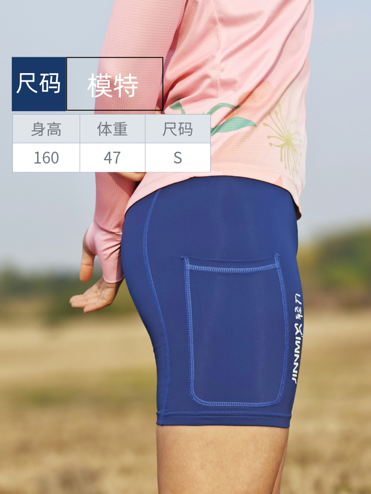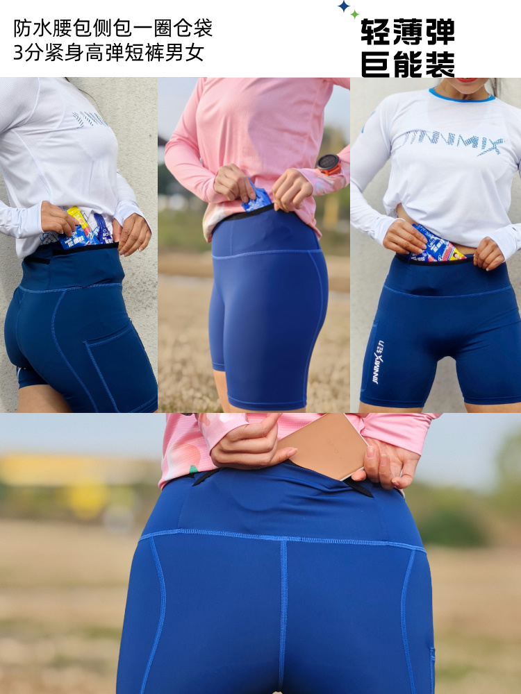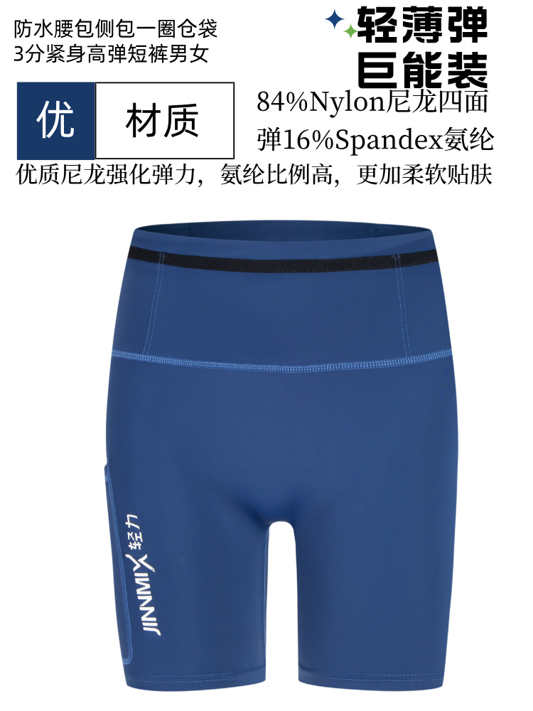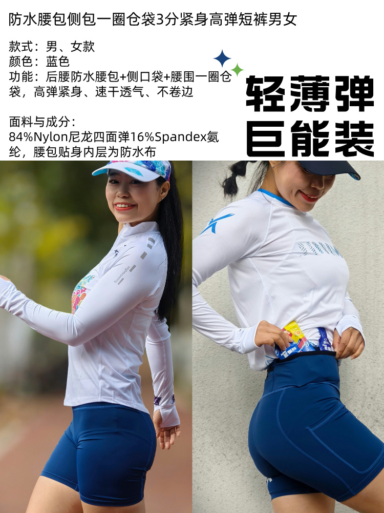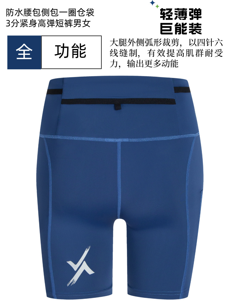 3分防水腰包侧包一圈仓袋紧身高弹短裤男女蓝