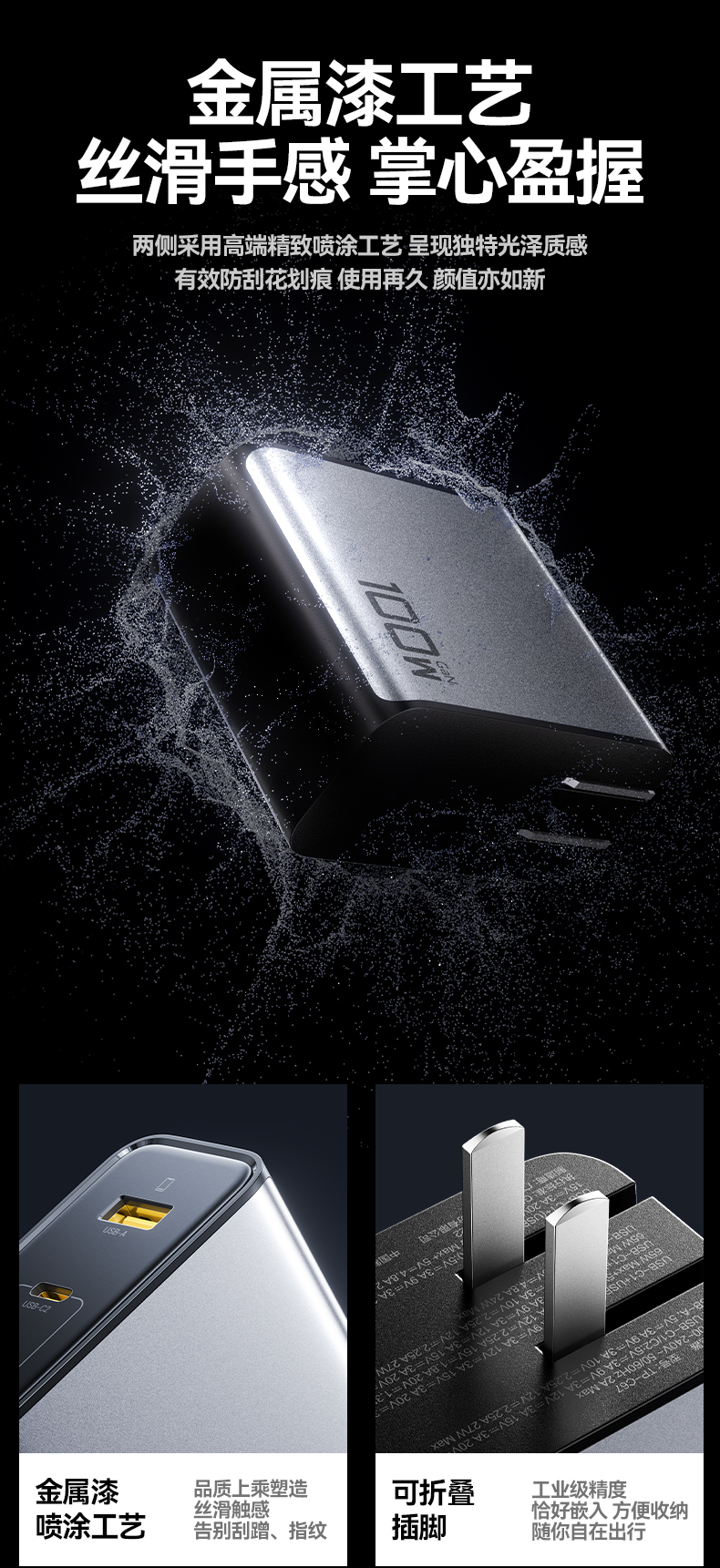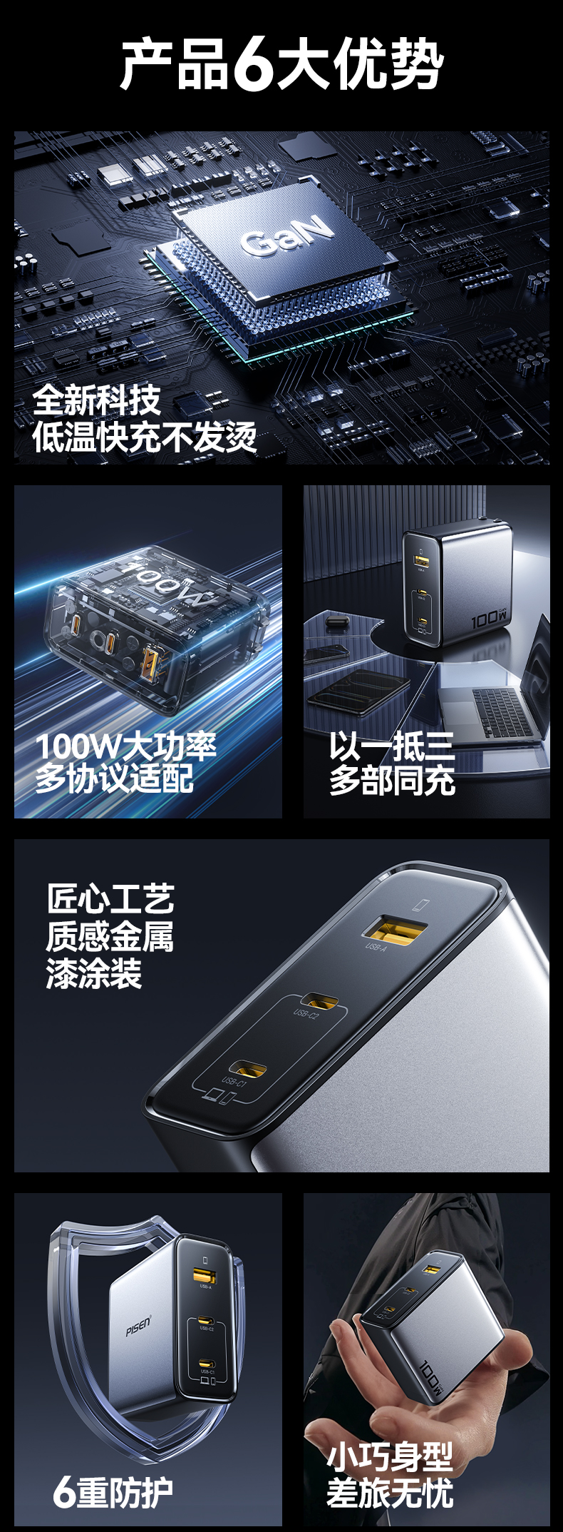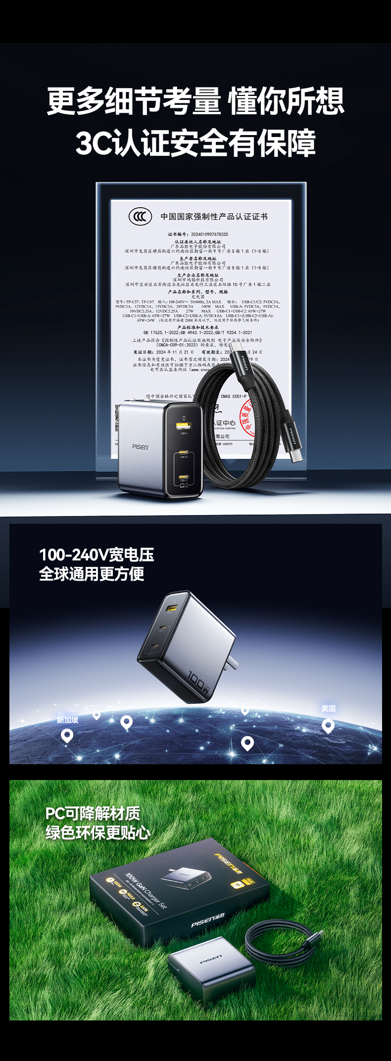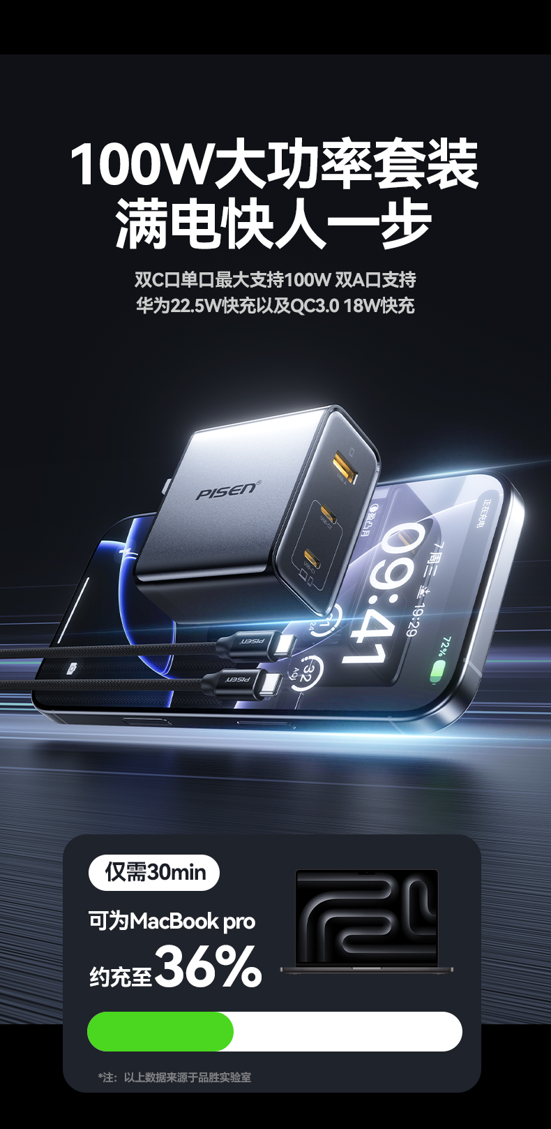 品胜 100W氮化镓闪电湃多口快速充电器套装2C1A Type-C数据线套装 笔记本充电器