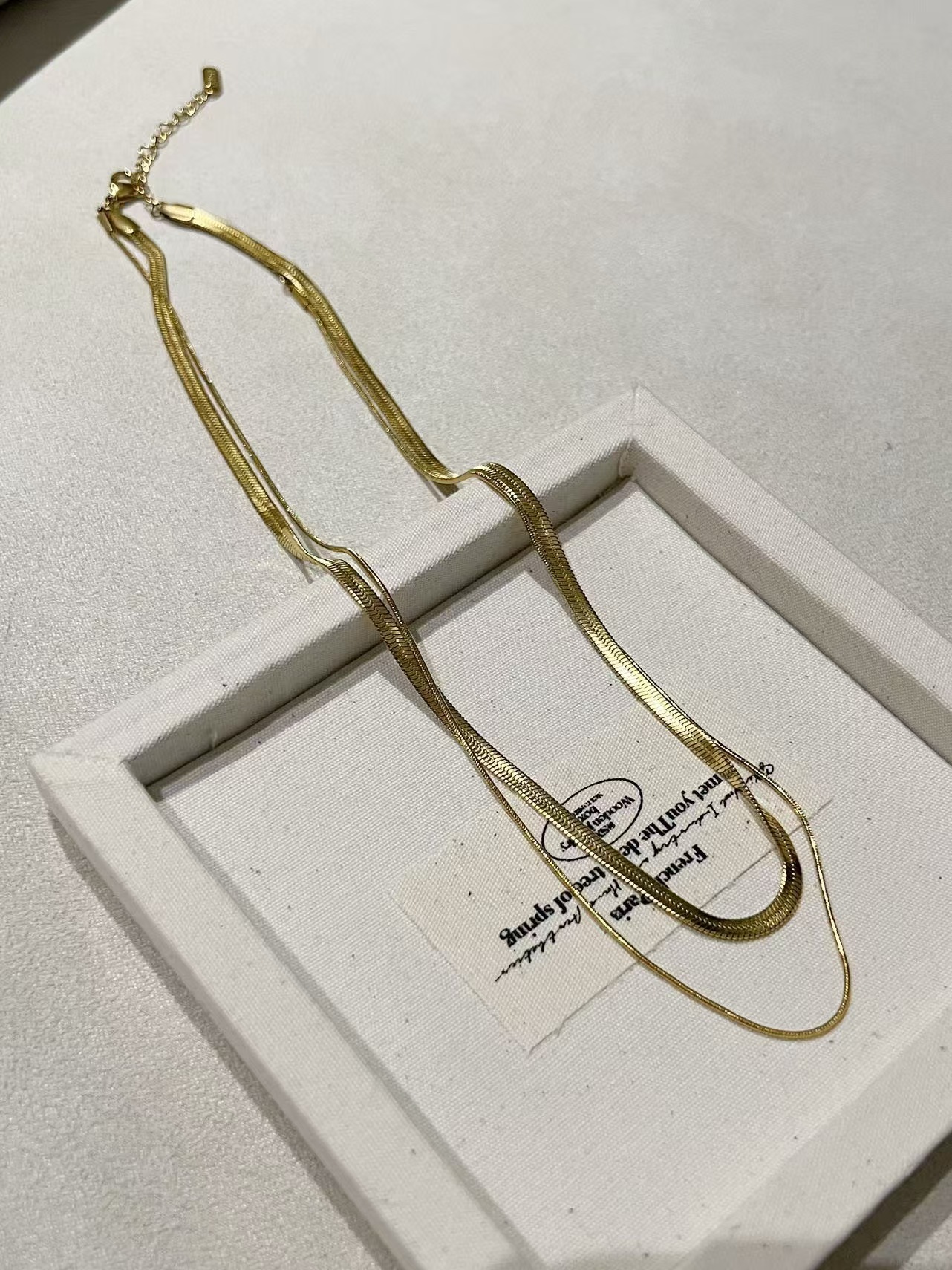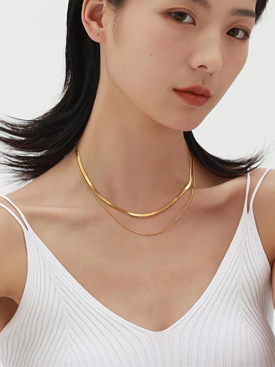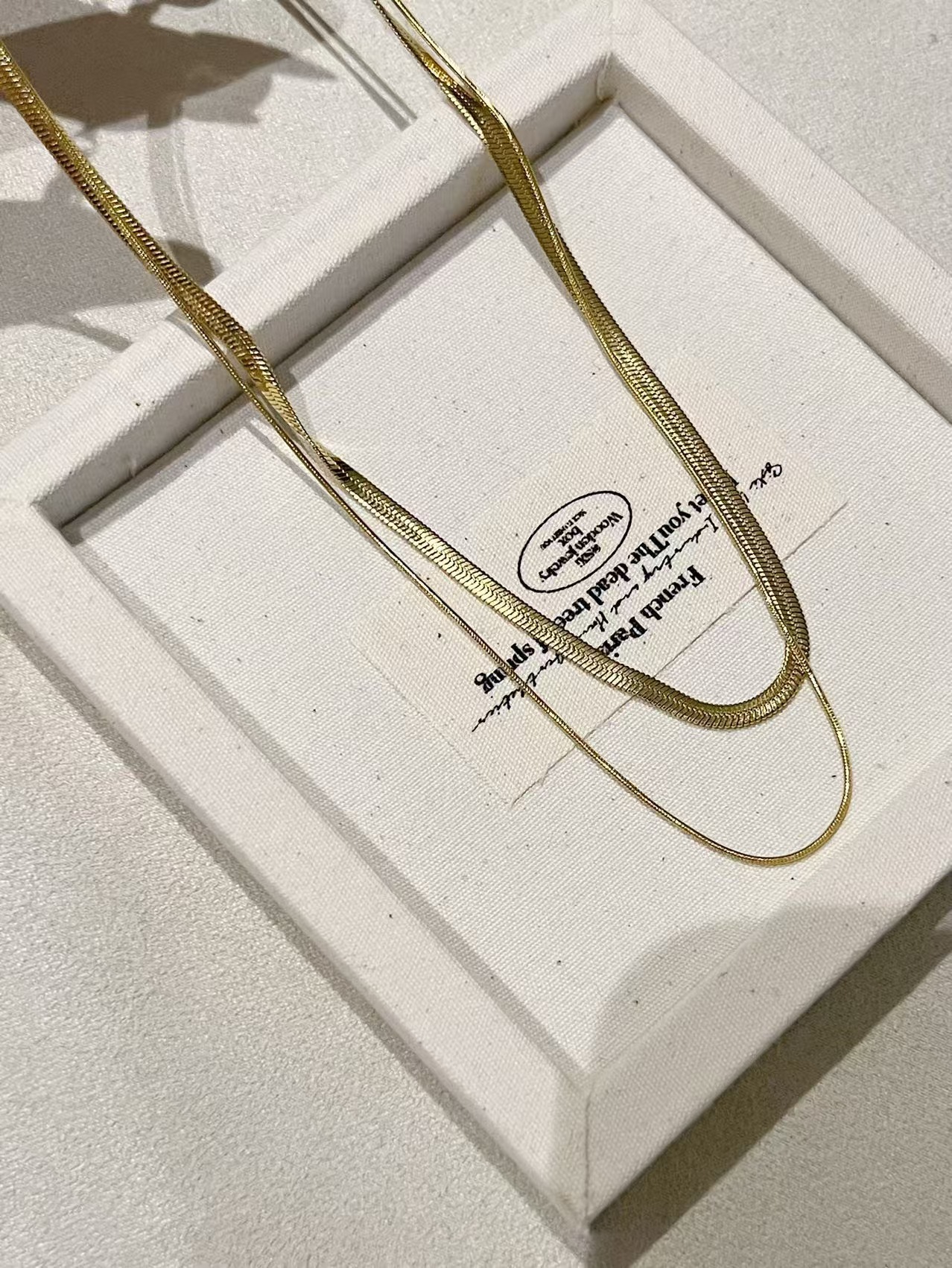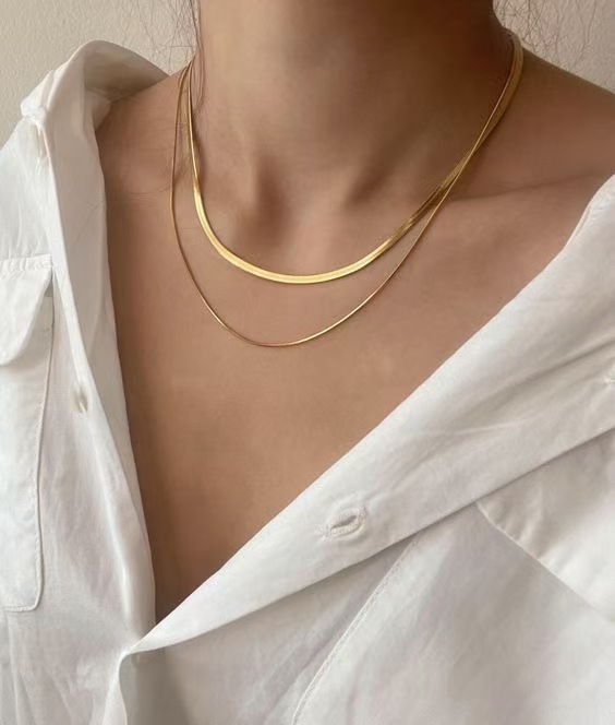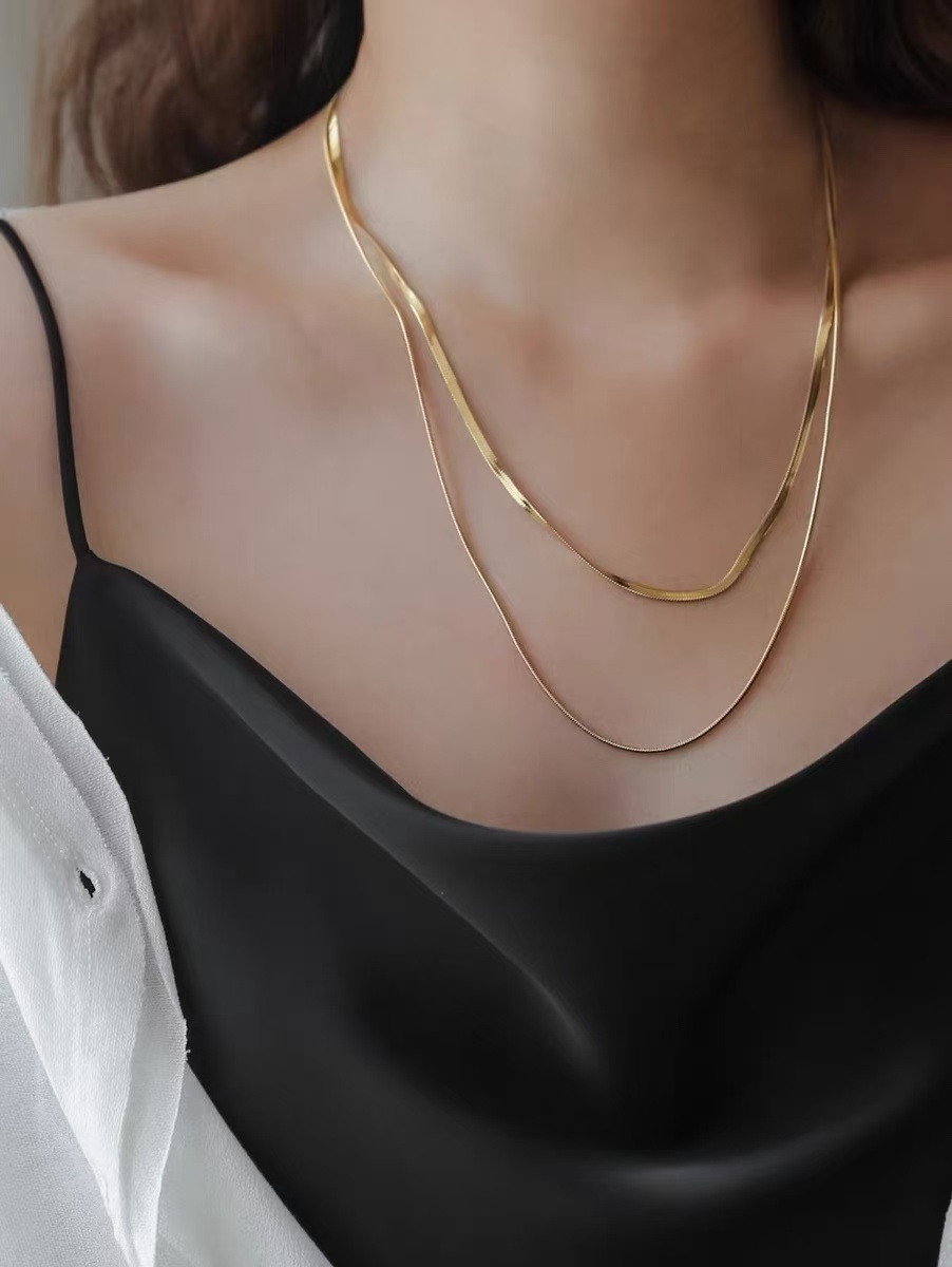 镀金工艺不掉色~经典蛇骨链谁还没有?必须高冷G级感拉满~蛇骨链双层叠戴很百搭~可以让穿搭G有质感!i轻奢小众冷淡锁骨链,值得焊在脖子上的一条项链,永远不会过时的款式。意大利进口机器编织更柔顺,不挂脖颈。出口标准双层真空保色电镀!无惧水洗!