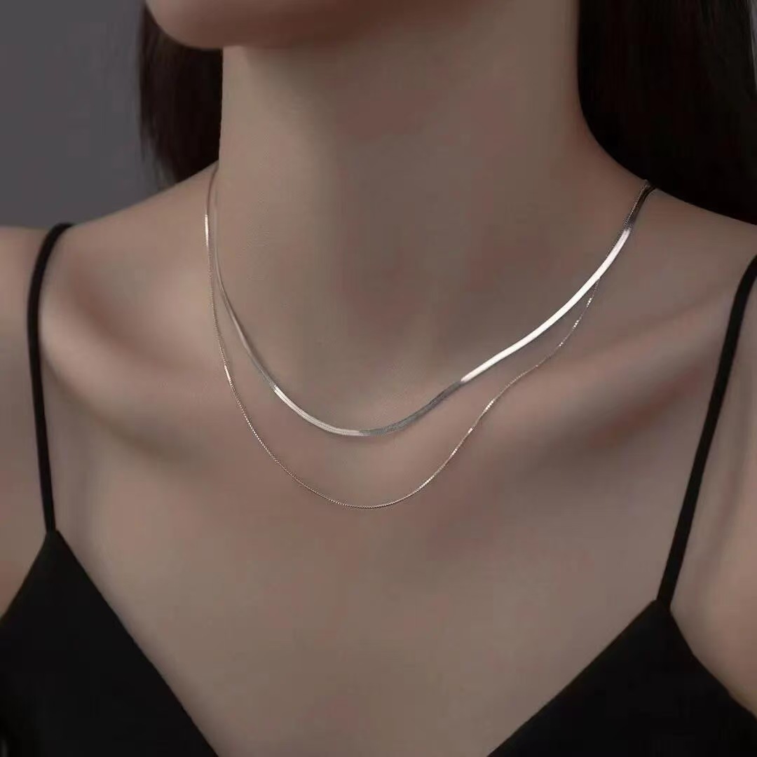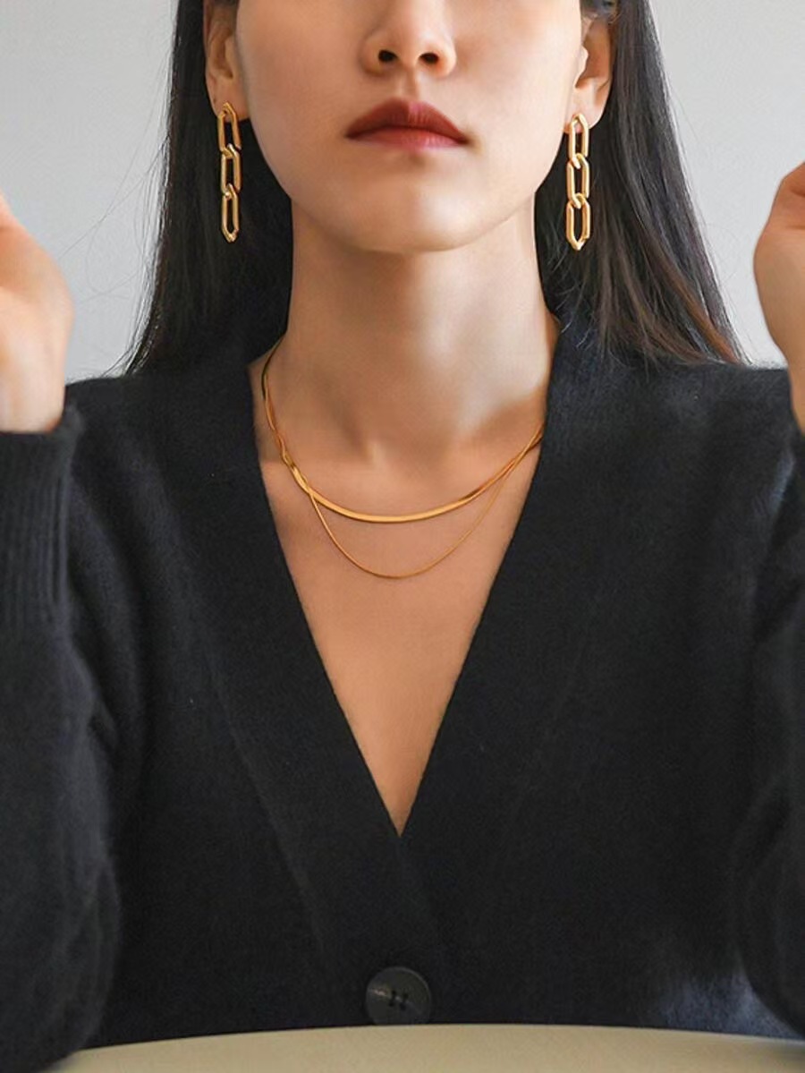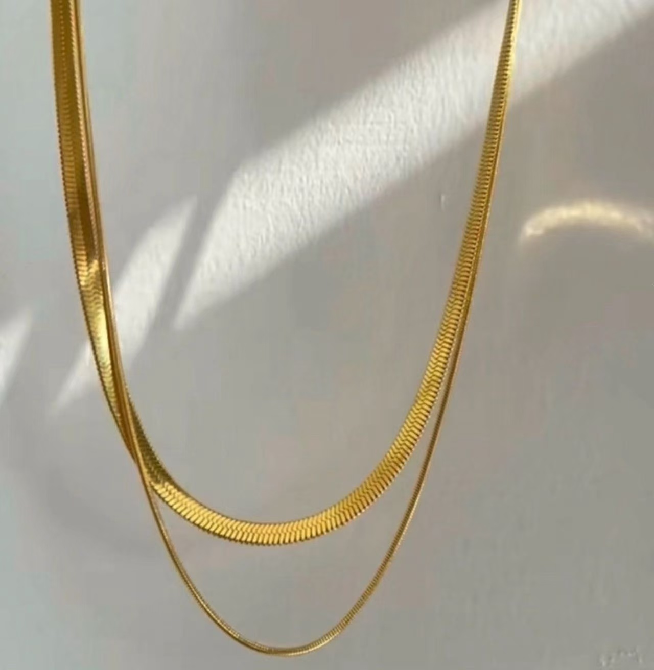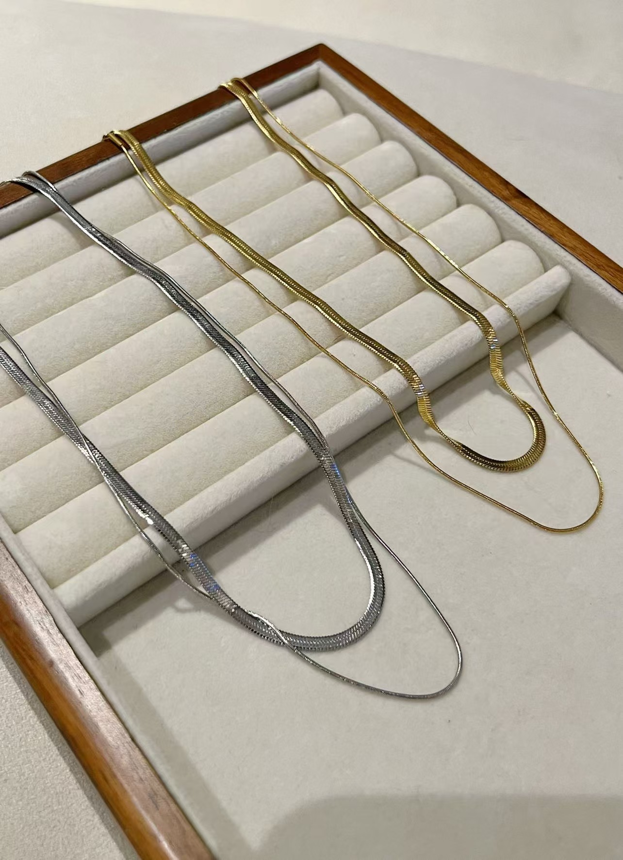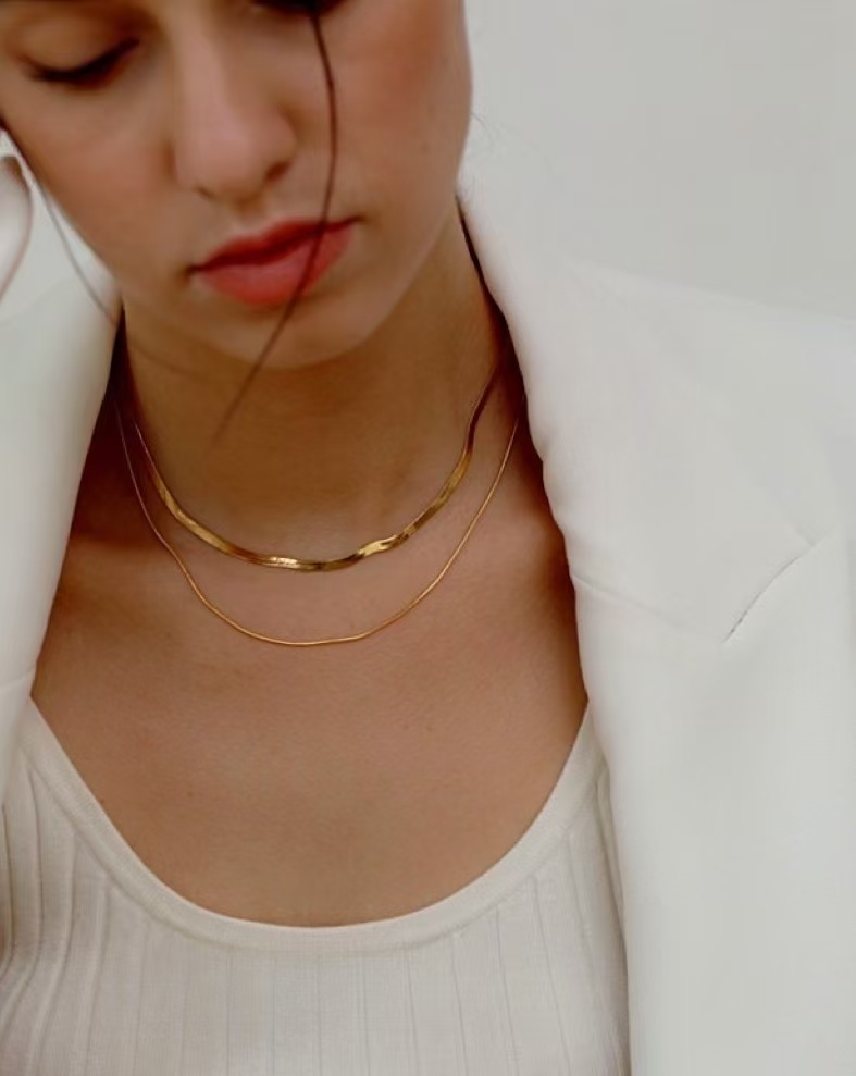 镀金工艺不掉色~经典蛇骨链谁还没有?必须高冷G级感拉满~蛇骨链双层叠戴很百搭~可以让穿搭G有质感!i轻奢小众冷淡锁骨链,值得焊在脖子上的一条项链,永远不会过时的款式。意大利进口机器编织更柔顺,不挂脖颈。出口标准双层真空保色电镀!无惧水洗!