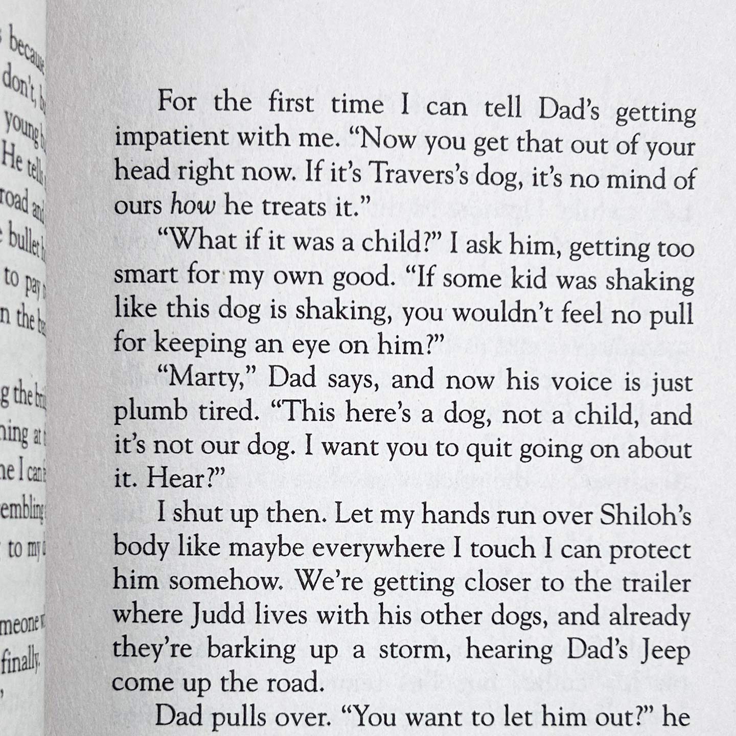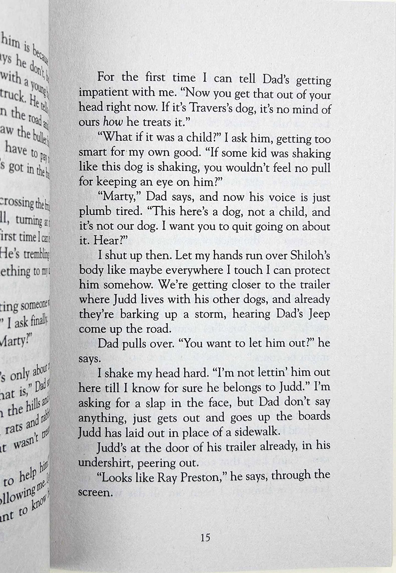 When 11-year-old Marty Preston chances upon a mistreated beagle pup in his hometown of Friendly, West Virginia, he is not prepared for the ethical questions he has to face. Should he return the dog to its owner, only to have the animal abused again? Should he tell his parents? Should he steal food to help the poor creature? Marty's efforts to cope with these questions provides the moral backbone for this story, which is presented in a language and manner that will be understood by third- and fourth-grade readers. The heart and beauty of this 1992 Newbery Medal winner lies in lessons children will take away with them.