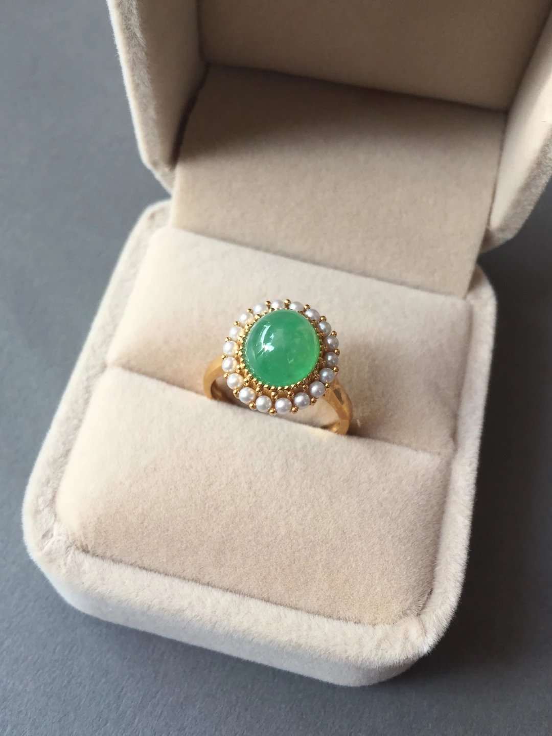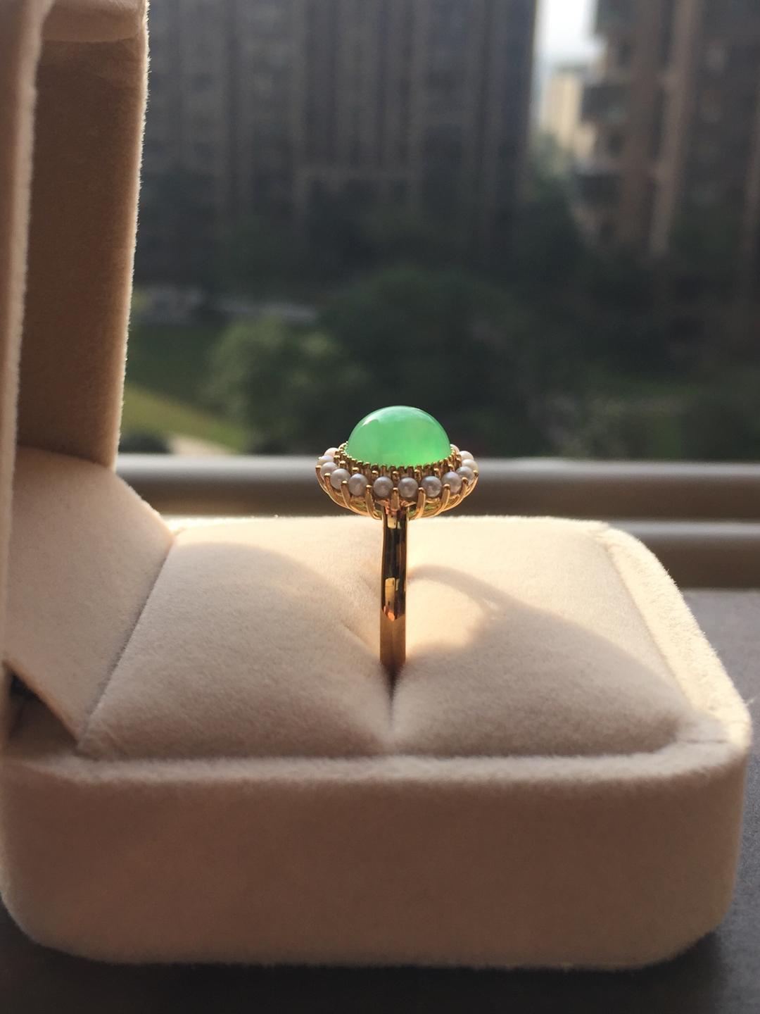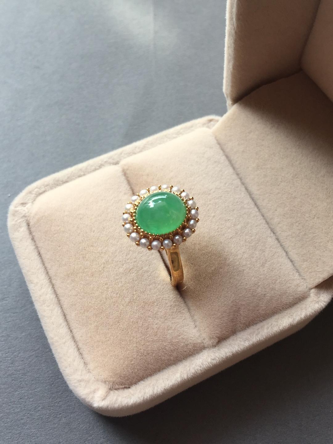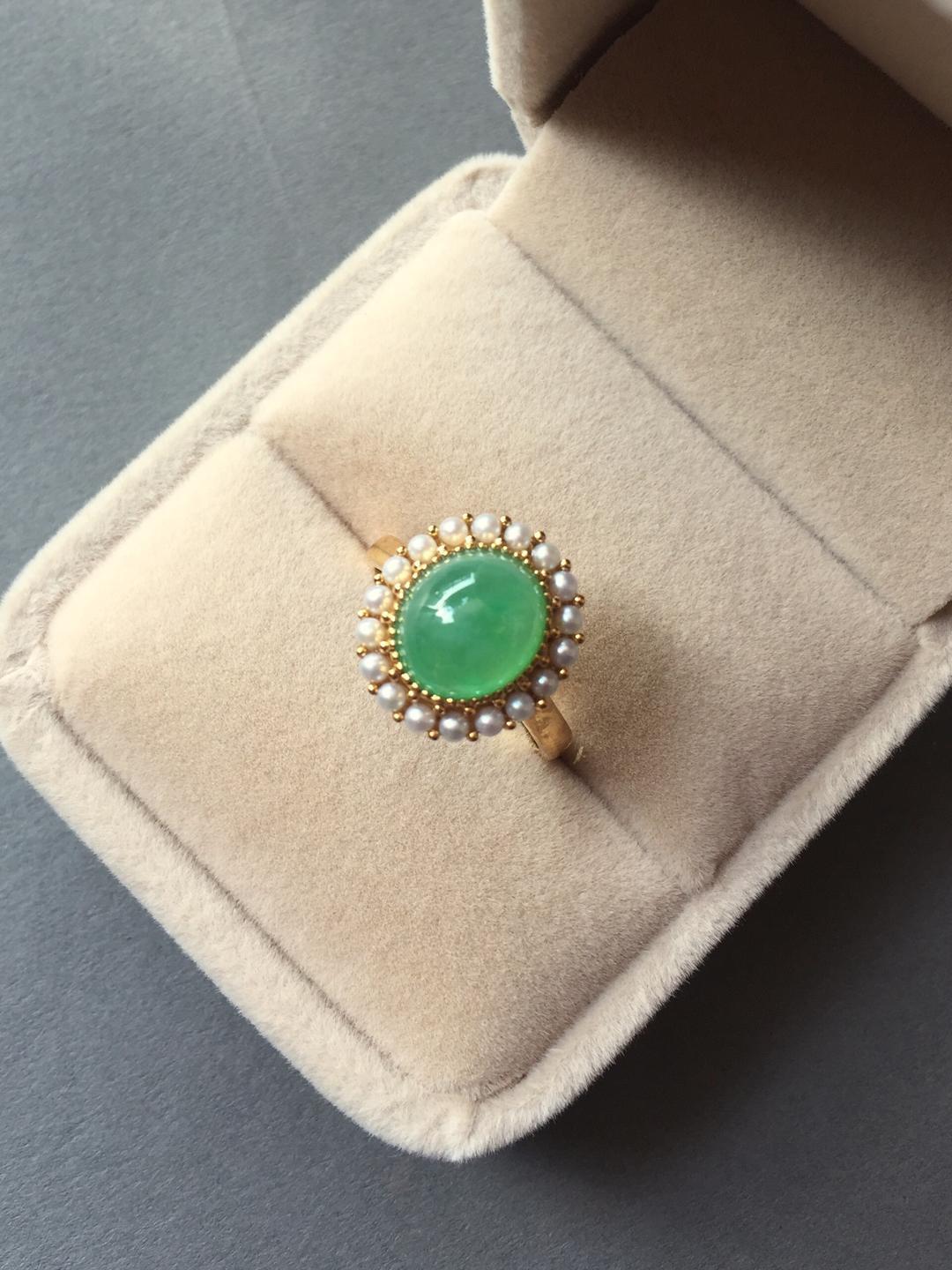 冰种翡翠阳绿蛋面戒指,种水晶莹剔透,荧光四射,阳绿清新艳丽,蛋面9.7*8.5*5mm,大气饱满,鼓鼓的像个小山,18k黄金镶嵌,这次配的是珍珠,简洁的复古设计,款式经典大气,任何人都能驾驭,避免了传统做法太繁复的缺点,让你日常佩戴轻松无压力。圈口13,可改大小,特色好推荐,高性价比
