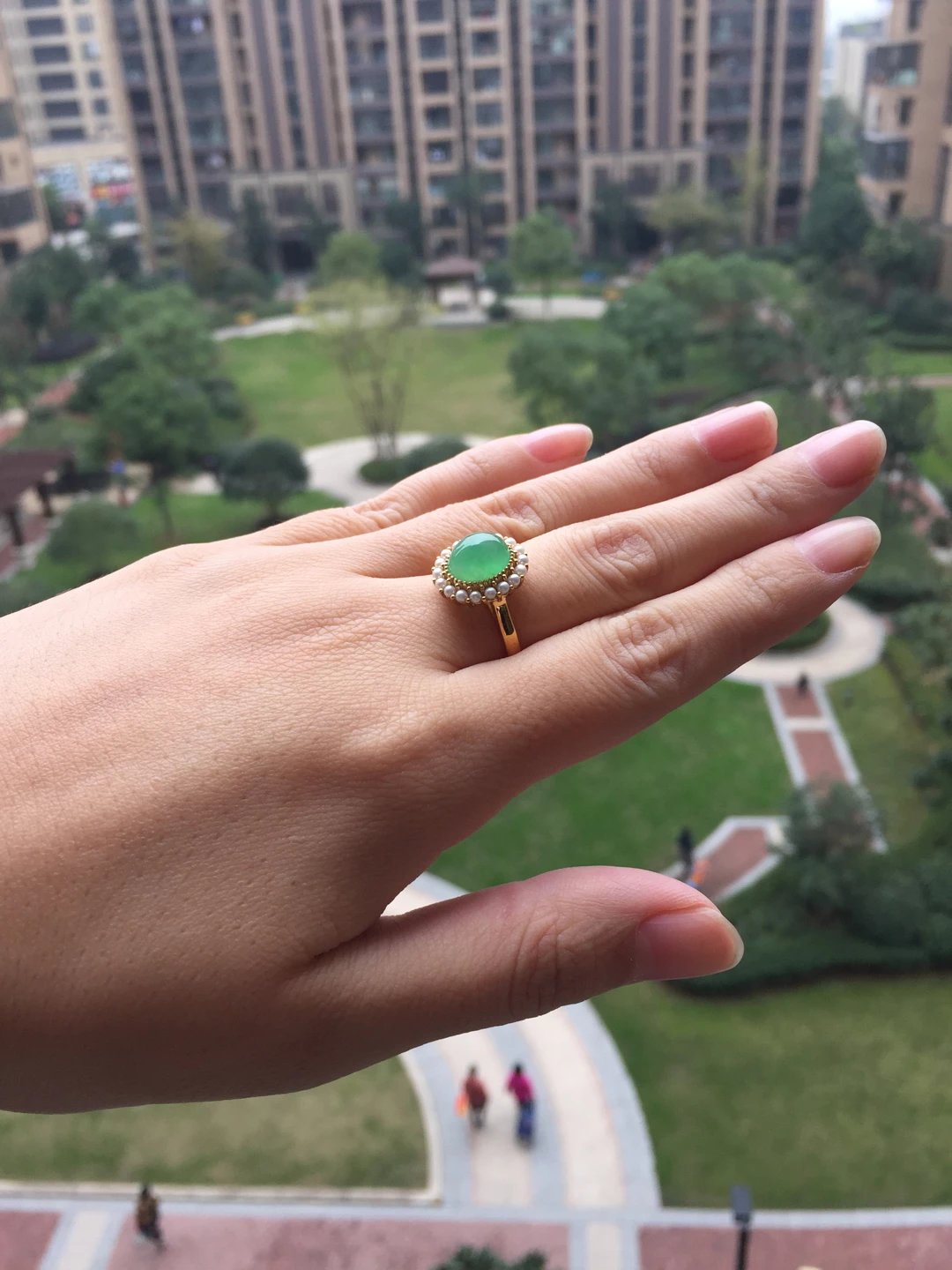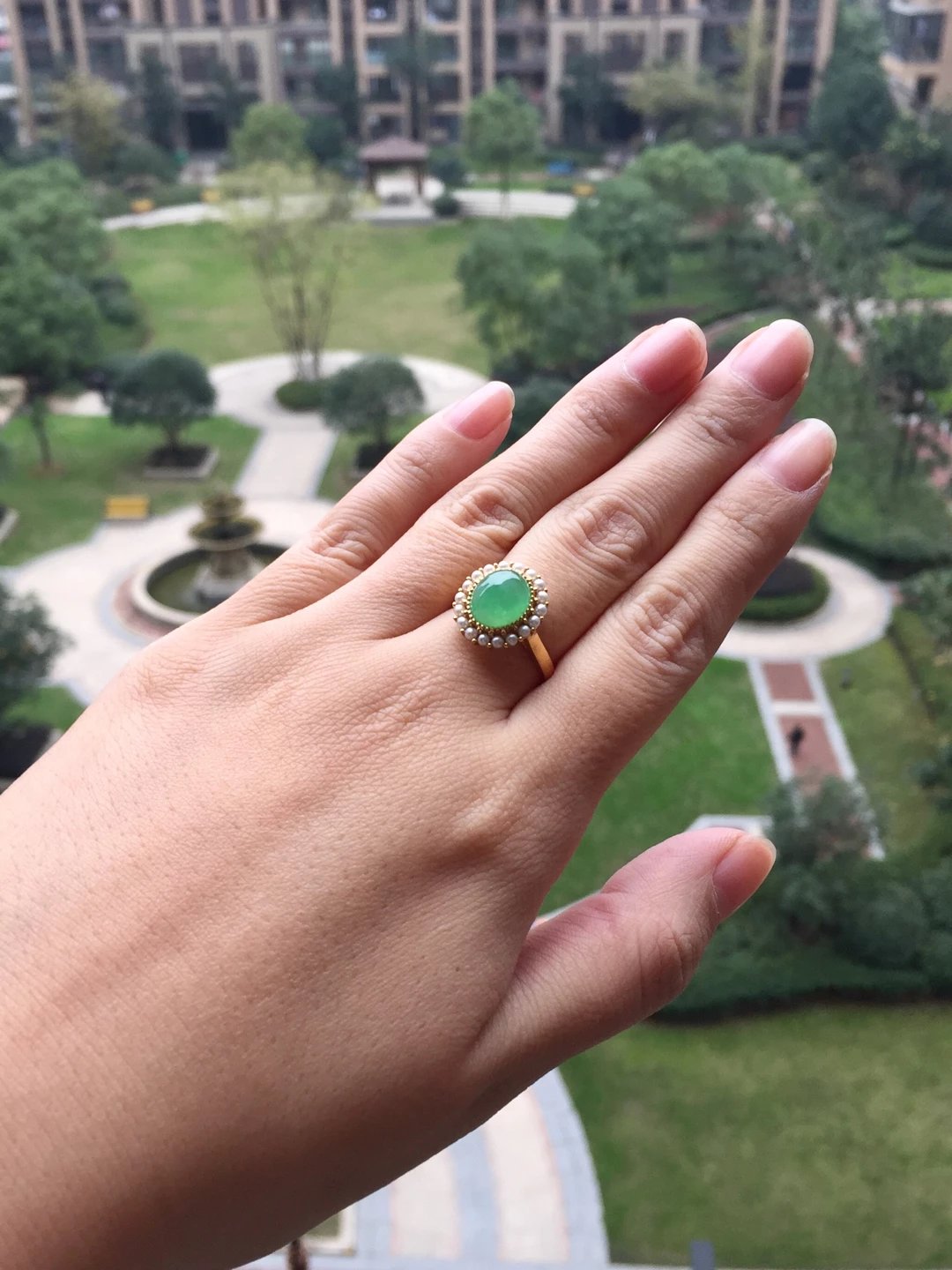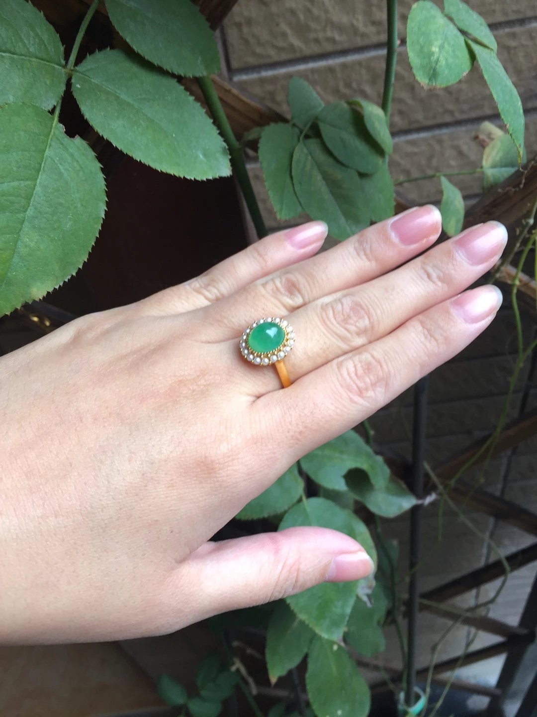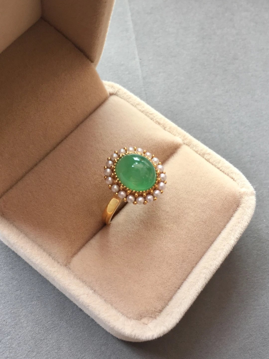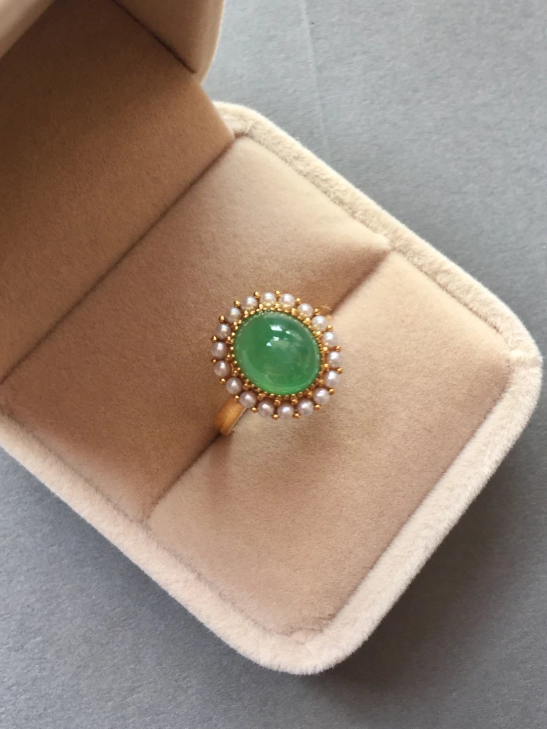 冰种翡翠阳绿蛋面戒指,种水晶莹剔透,荧光四射,阳绿清新艳丽,蛋面9.7*8.5*5mm,大气饱满,鼓鼓的像个小山,18k黄金镶嵌,这次配的是珍珠,简洁的复古设计,款式经典大气,任何人都能驾驭,避免了传统做法太繁复的缺点,让你日常佩戴轻松无压力。圈口13,可改大小,特色好推荐,高性价比