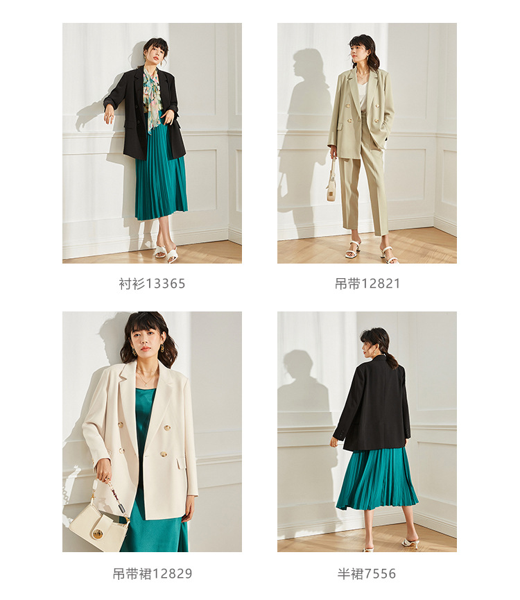商品信息 | ● 货号:12818 ● 款名:廓形西服 ● 面料:91.6%聚酯纤维8.4%氨纶 ● 里料:100%聚酯纤维 ● 颜色:米白、浅绿、卡其、黑色 ● 尺码:S、均码F ● 品牌标识:自主品牌正品包装 ● 洗涤建议:低温手洗/不可漂白/悬挂晾干/不可在阳光下暴晒,避免掉色/通风处阴干。熨斗底板温度≤110℃,常规干洗 |