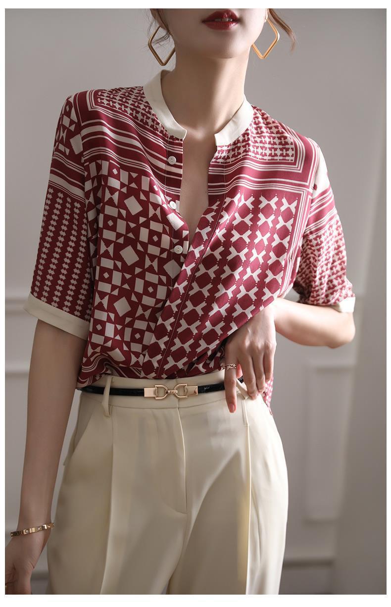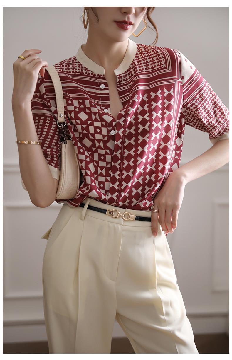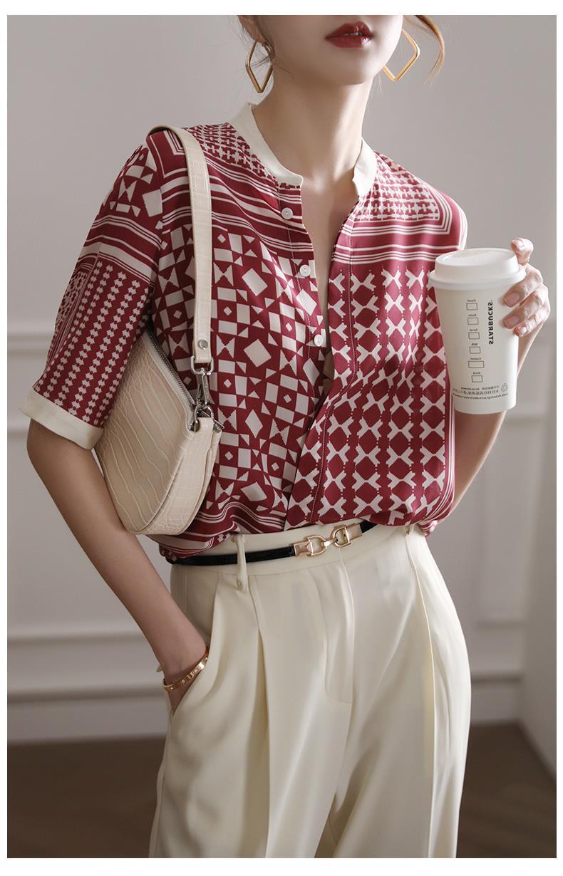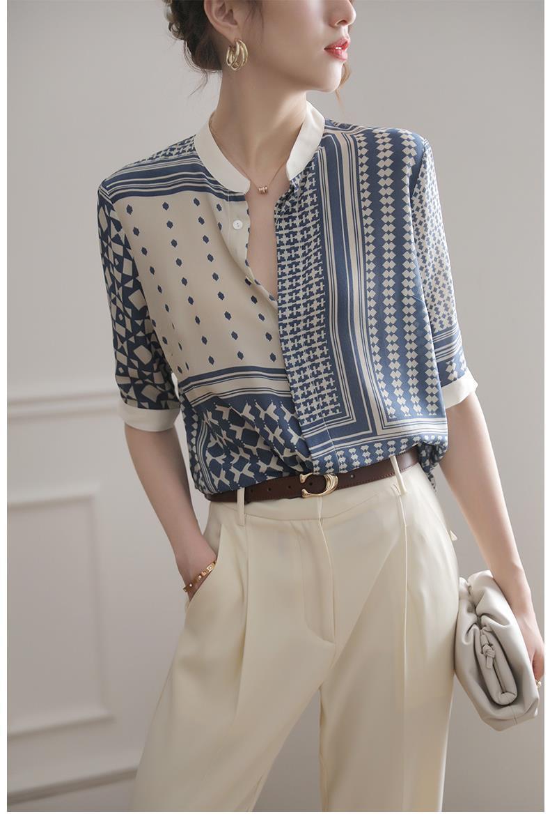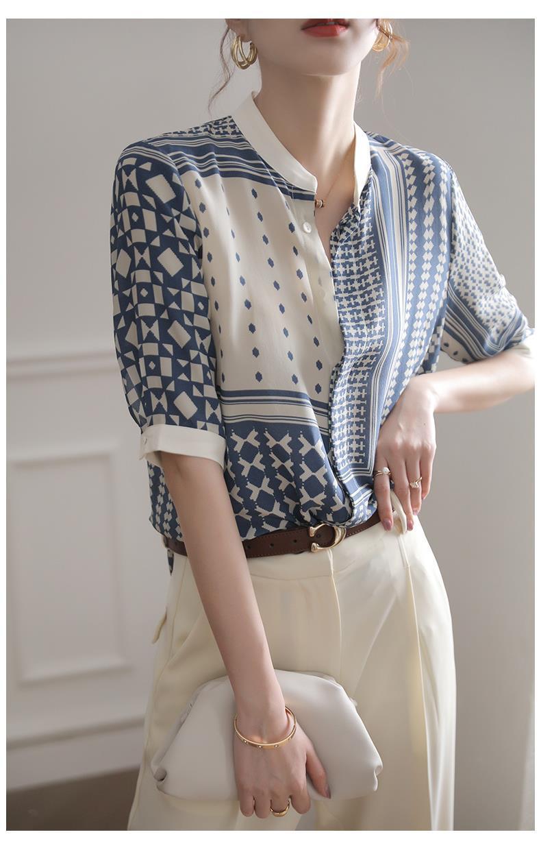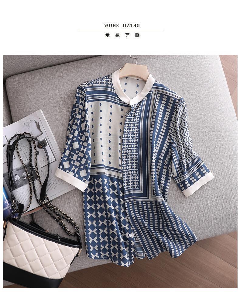 【满满设计感】法式真丝衬衫 中袖立领 复古格子条纹 设计感小众蚕丝上衣